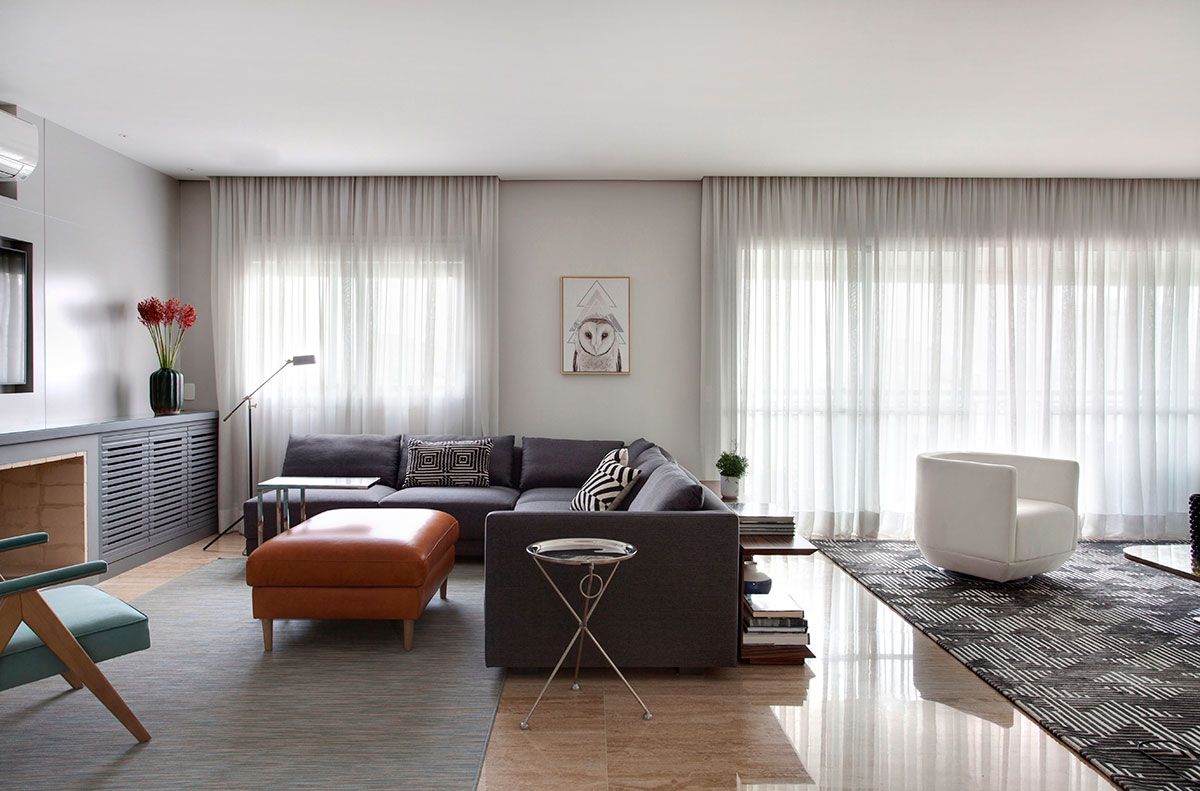 Antes de darem início ao processo de reforma, lá foram os três até o apartamento que o casal havia alugado temporariamente. De cara, o Robert percebeu o enorme potencial do mobiliário que eles htinham comprado já com o novo apê em mente: as linhas curvas e limpas eram bastante modernas, as dimensões adequadas, porém, as cores nada tinham de interessantes. No geral, o cenário era bastante neutro e sem personalidade, algo que não condizia com a vivacidade dessa família. O designer, com o aval do casal, deu nova cara aos móveis ao estofá-los com tecidos em tons mais atuais e vibrantes, como o linho verde pistache eleito para o sofá do living e o veludo gelo das poltronas.