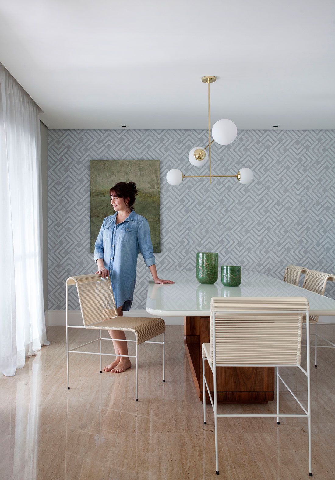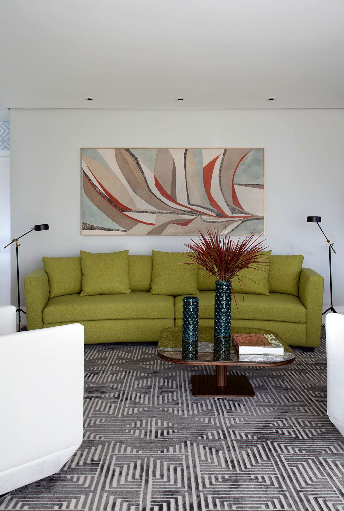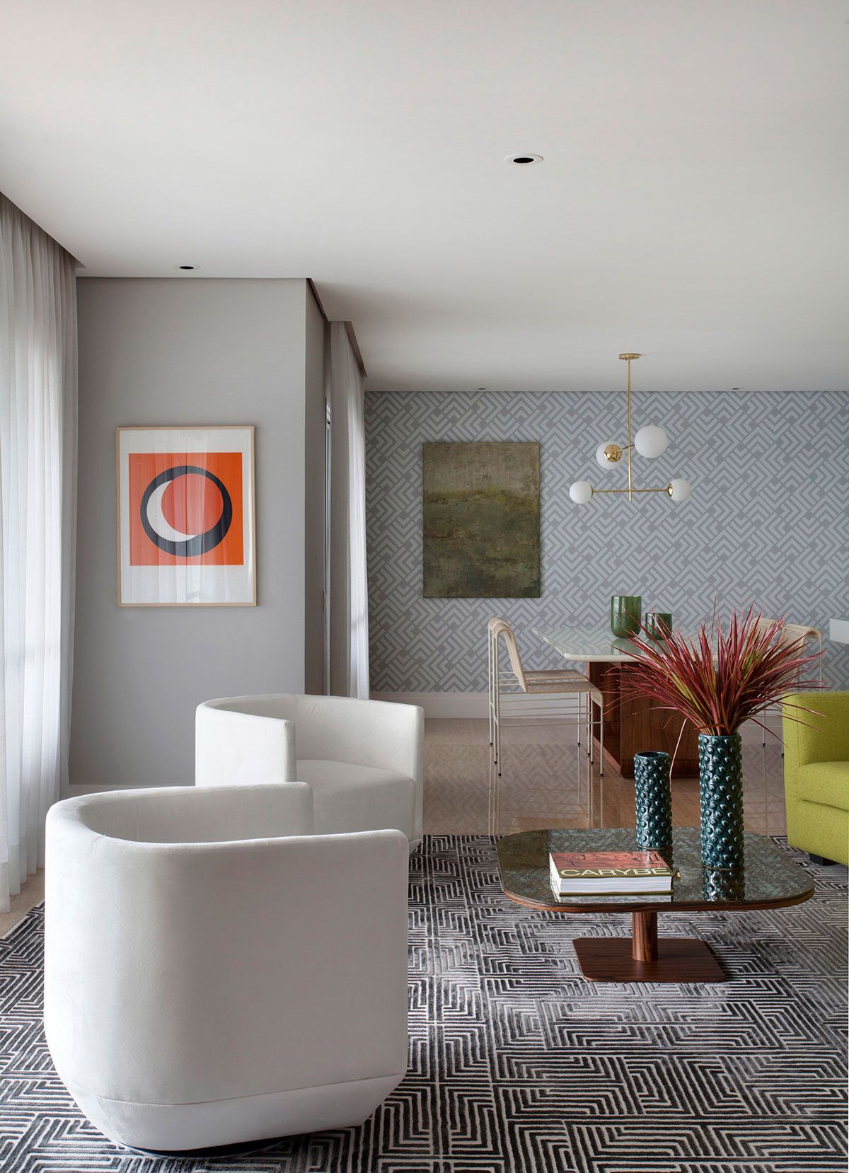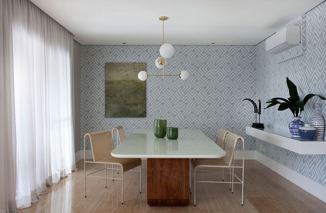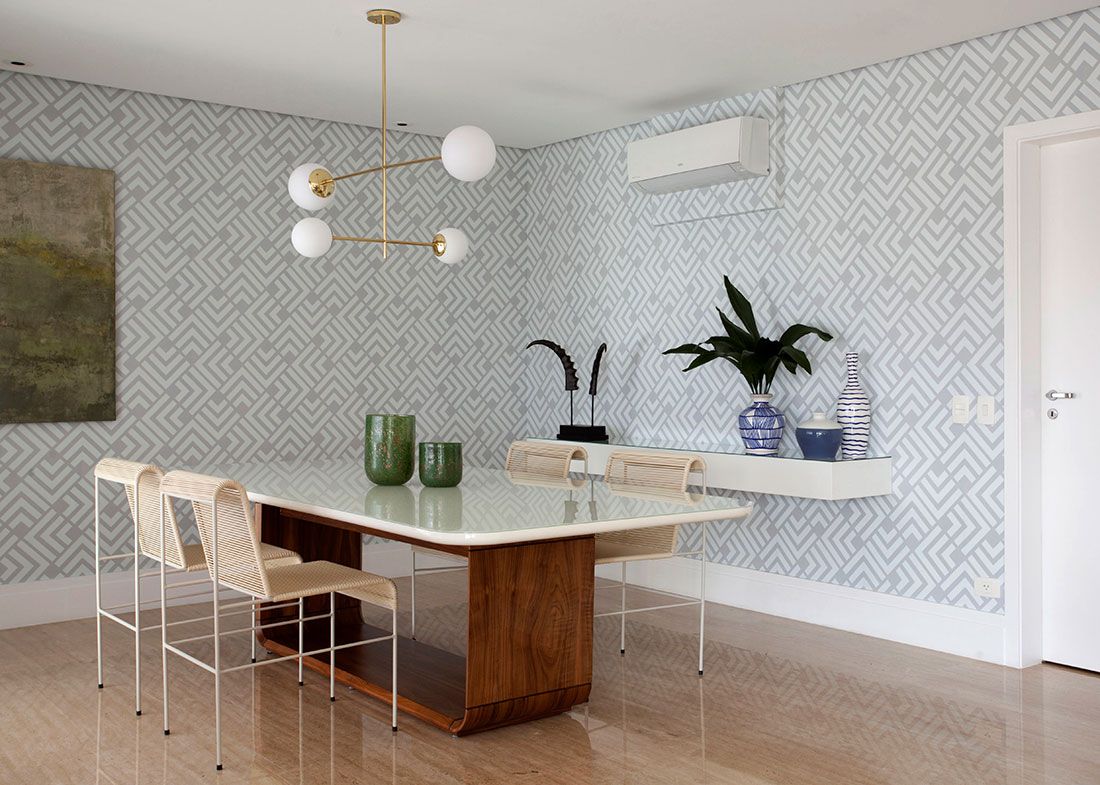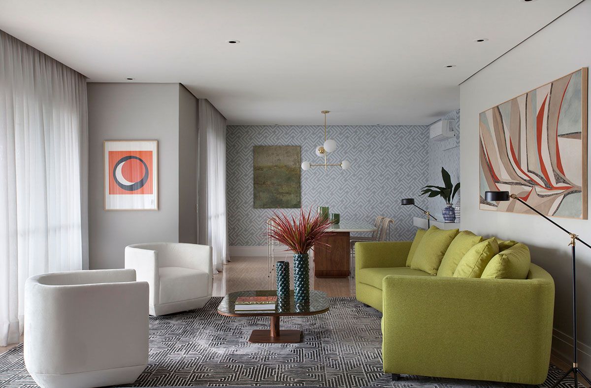 Para conseguir fazer essa mudança um tanto brusca entre um visual puxado para o marrom para uma proposta iluminada e colorida, o Robert trouxe como principal referência a natureza em suas diversas nuances cromáticas. O mix do verde intenso com tons mais delicados estabeleceu um clima alegre sem ser invasivo ou enjoativo. Os elementos naturais aparecem também nas obras de arte, como o lindo painel inspirado em Burle Marx que adorna a parede onde fica o sofá curvo. Já o mood 70’s, outra marca registrada do arquiteto, foi traduzido principalmente nas peças curvilíneas e nos padrões geométricos que se repetem por todo apartamento.