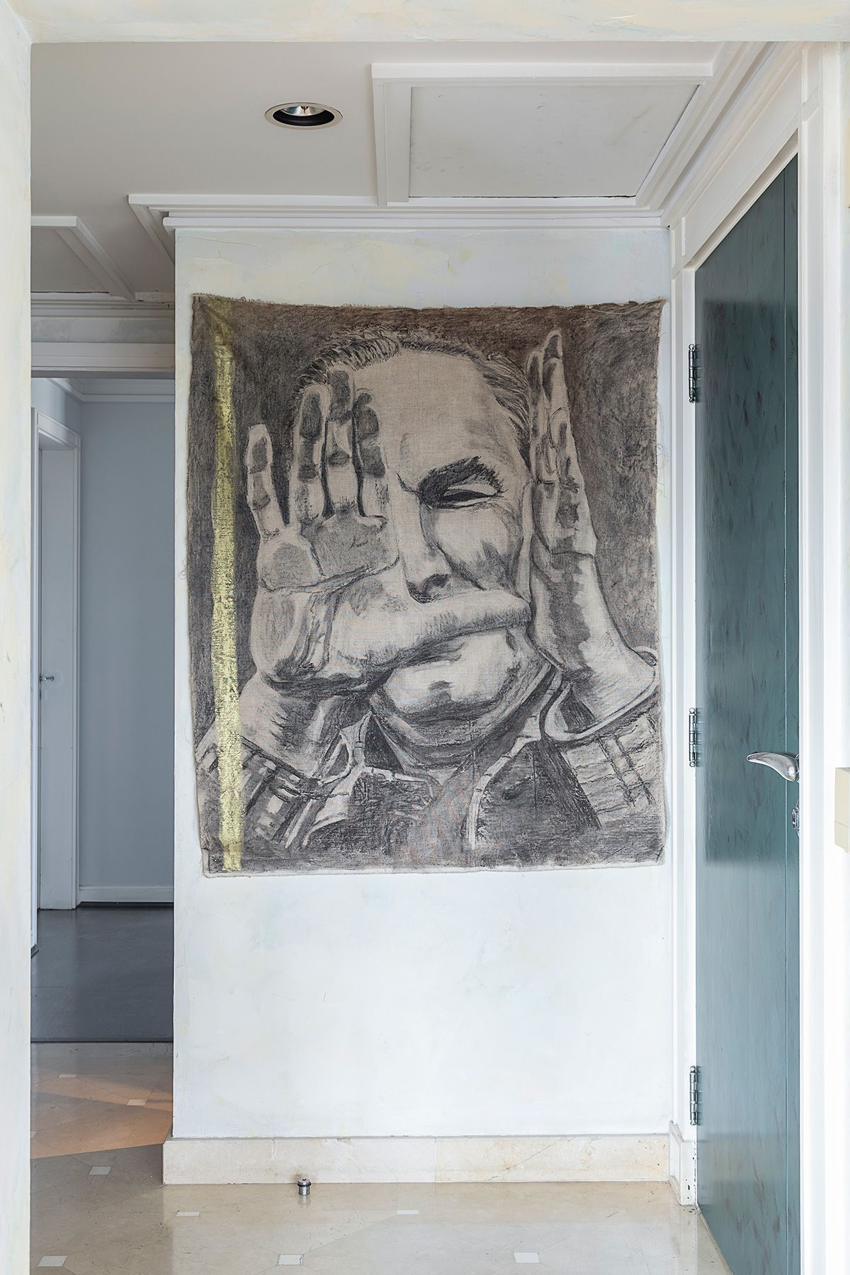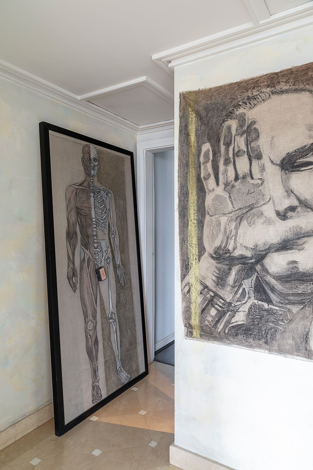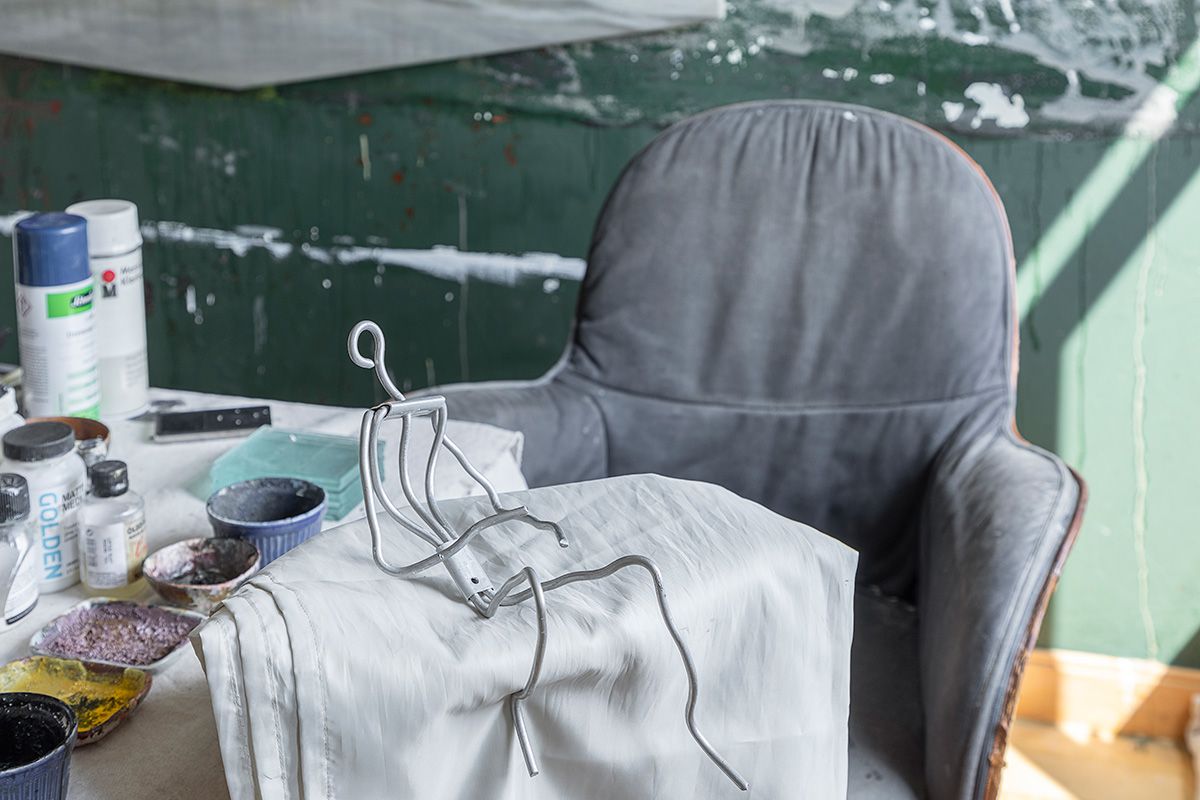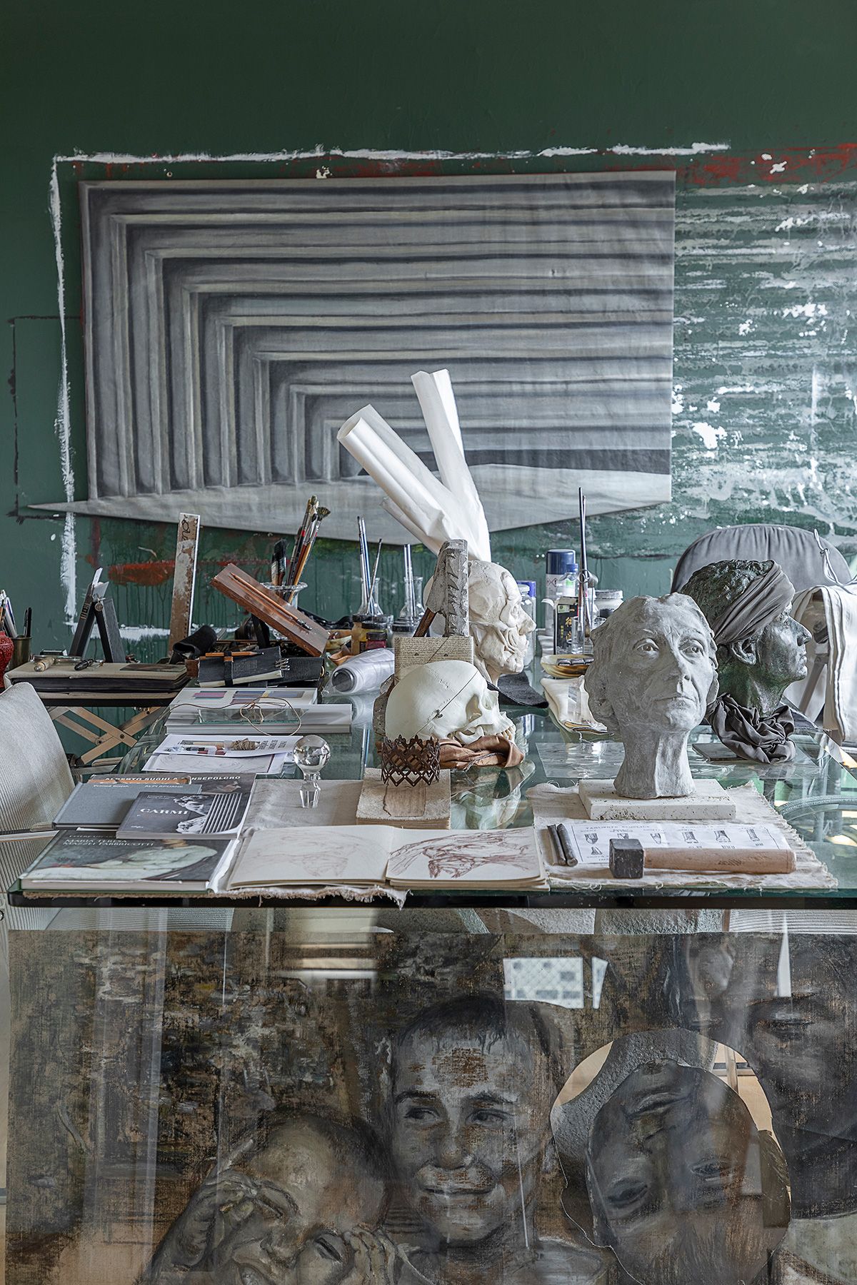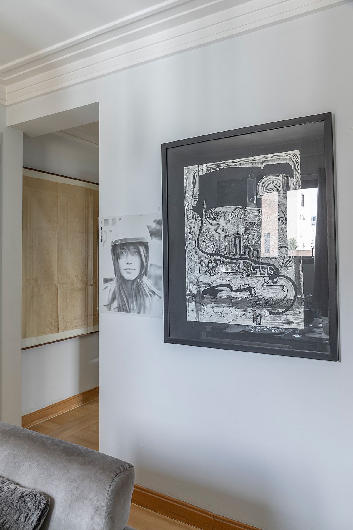 O apê é tomado pelas obras da artista, todo e qualquer tipo de espaço pode virar uma peça ou apoio para criação, inclusive o mobiliário, que muitas vezes é parte da instalação. A sala de estar é um ótimo exemplo disso, fiquei encantada quando me deparei com mais uma opção de estação de trabalho da artista, já que os materiais para esculpir e pintar ficam ali, junto aos moldes e peças acabadas. Por mais que a parede verde seja escura, ela contrasta com as paredes claras perfeitamente, permitindo que as obras sobressaiam e que o espaço fique inspirador para trabalhar.