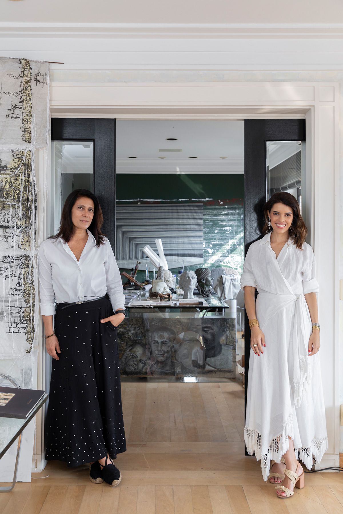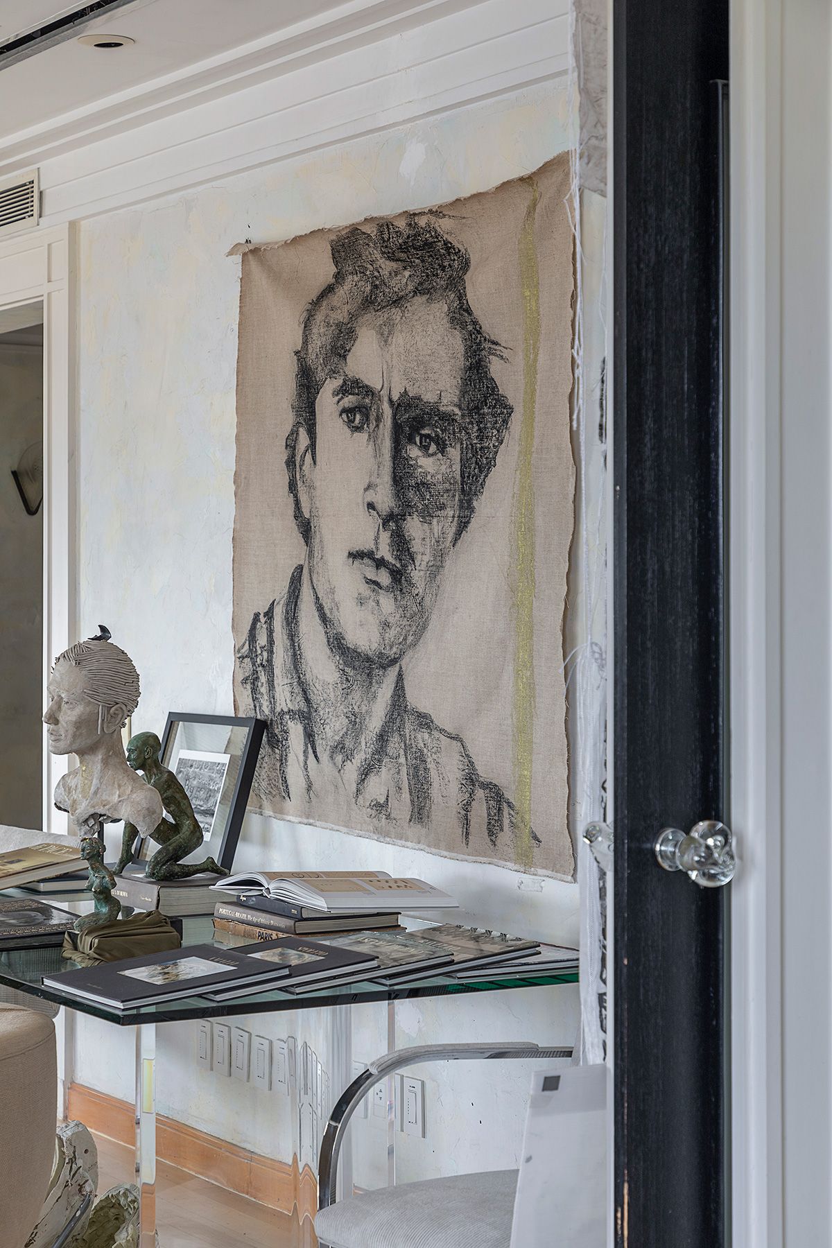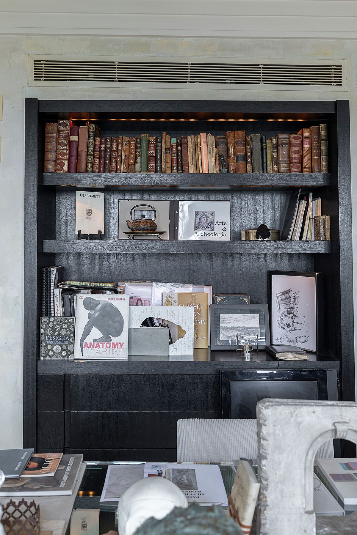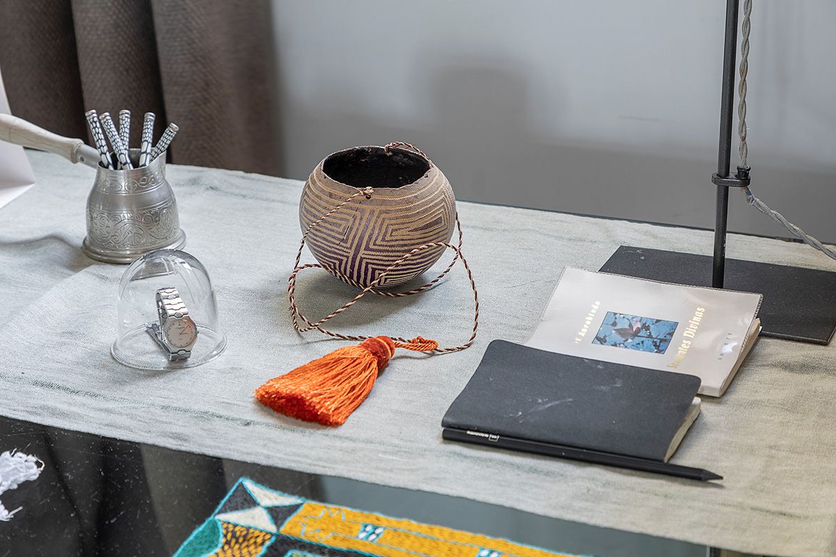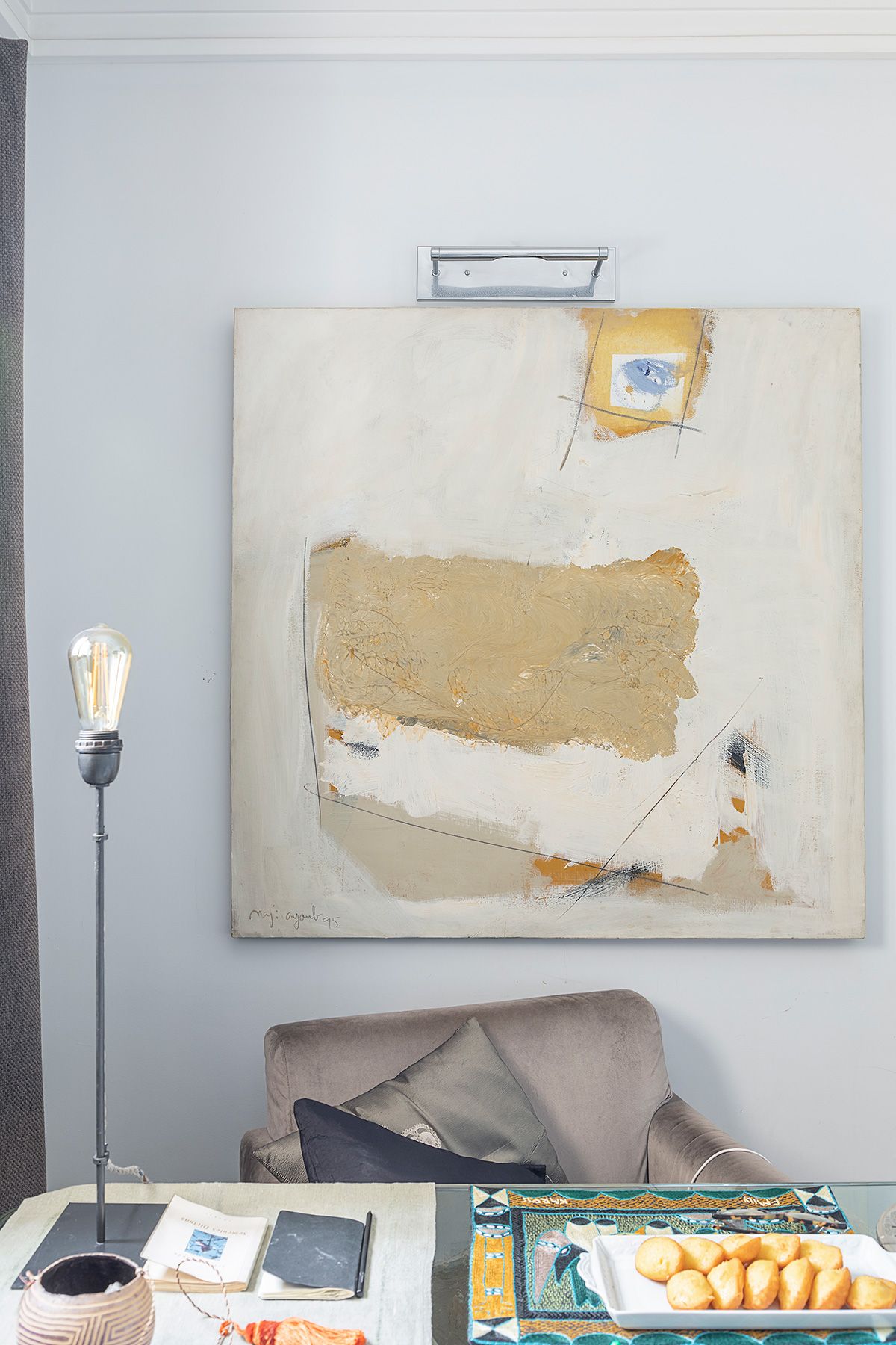 Perguntei à Luciane qual cômodo ela mais gostava no apartamento e a resposta foi a biblioteca, onde, além de seus livros, ficam peças de família, rascunhos e também seu objeto predileto da casa que, pasme, não é uma obra de arte, é o vasinho de trevo de quatro folhas do neto, que ela cuida religiosamente no mesmo horário todos os dias. Esse trecho da nossa conversa terminou de uma maneira bem especial: