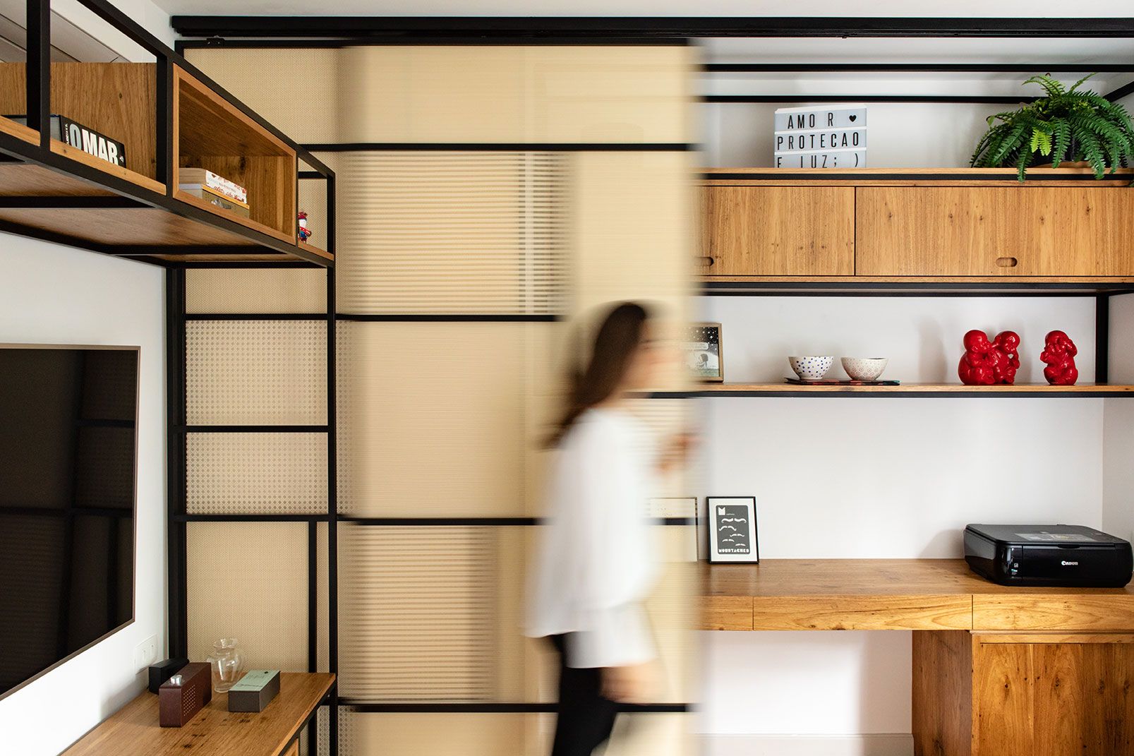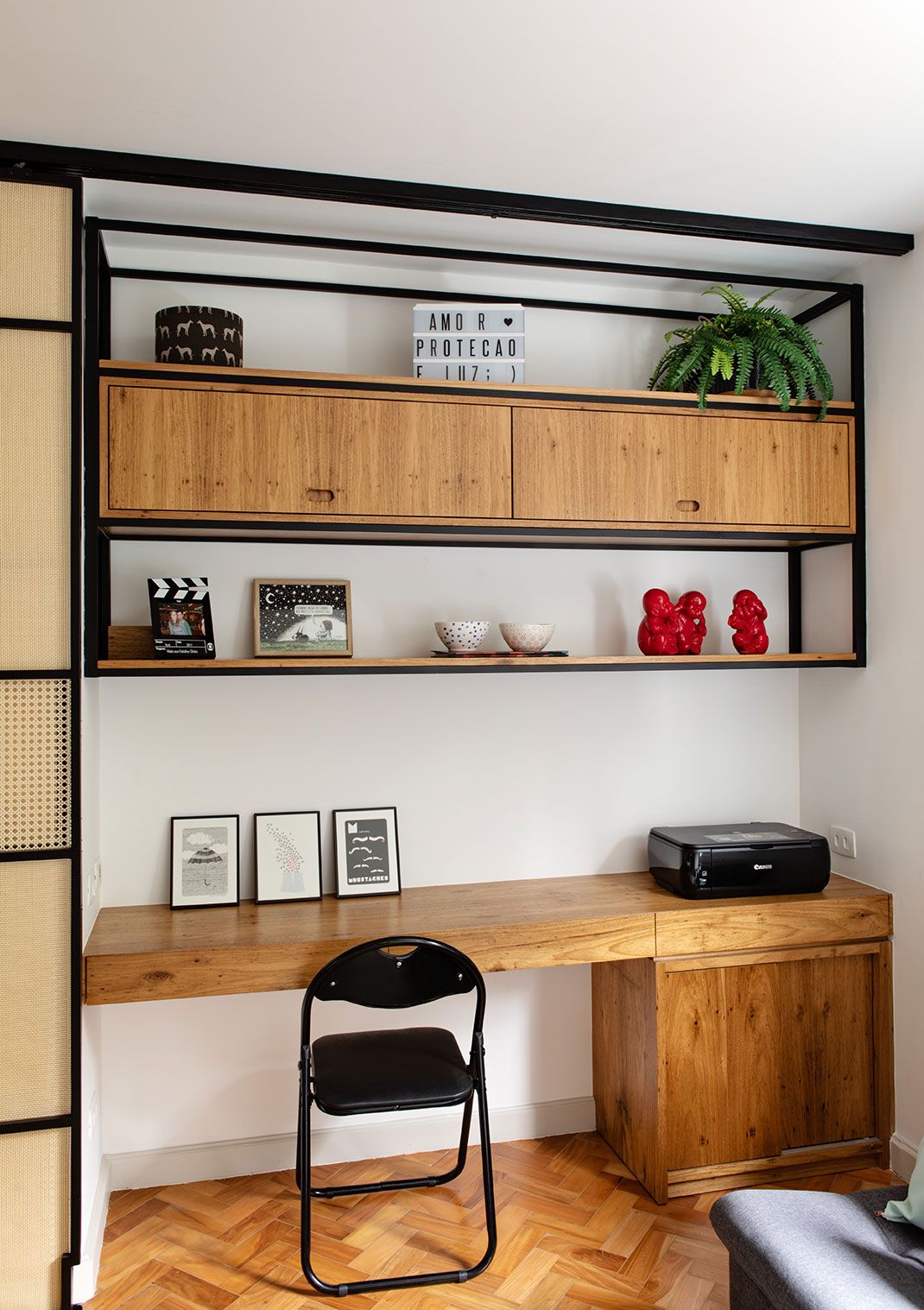 Peças queridas tem de monte por lá, como é o caso do kimono enquadrado e disposto de forma despojada, apoiado na parede ao lado do sofá da sala. O uniforme pertence ao Akira que é faixa preta de Jiu-jítsu: “a gente queria alguma referência da cultura japonesa e do esporte na decoração. Com o quadro, encontramos um bom balanço, sem contar que meu marido ficou superfeliz e a sala ganhou esse toque divertido também”. comenta. Além dos detalhes pessoais, algumas soluções de arquitetura também caíram nas graças dos moradores. Uma delas é a porta de correr de palhinha instalada no escritório que serve para esconder o espaço da mesa de trabalho, caso ele esteja bagunçado demais. “Ele fica parecendo um painel. Quando vou receber visitas, simplesmente fecho essa porta e o ambiente fica instantaneamente mais organizado e lindo. É superprático, usamos bastante esse recurso!”.