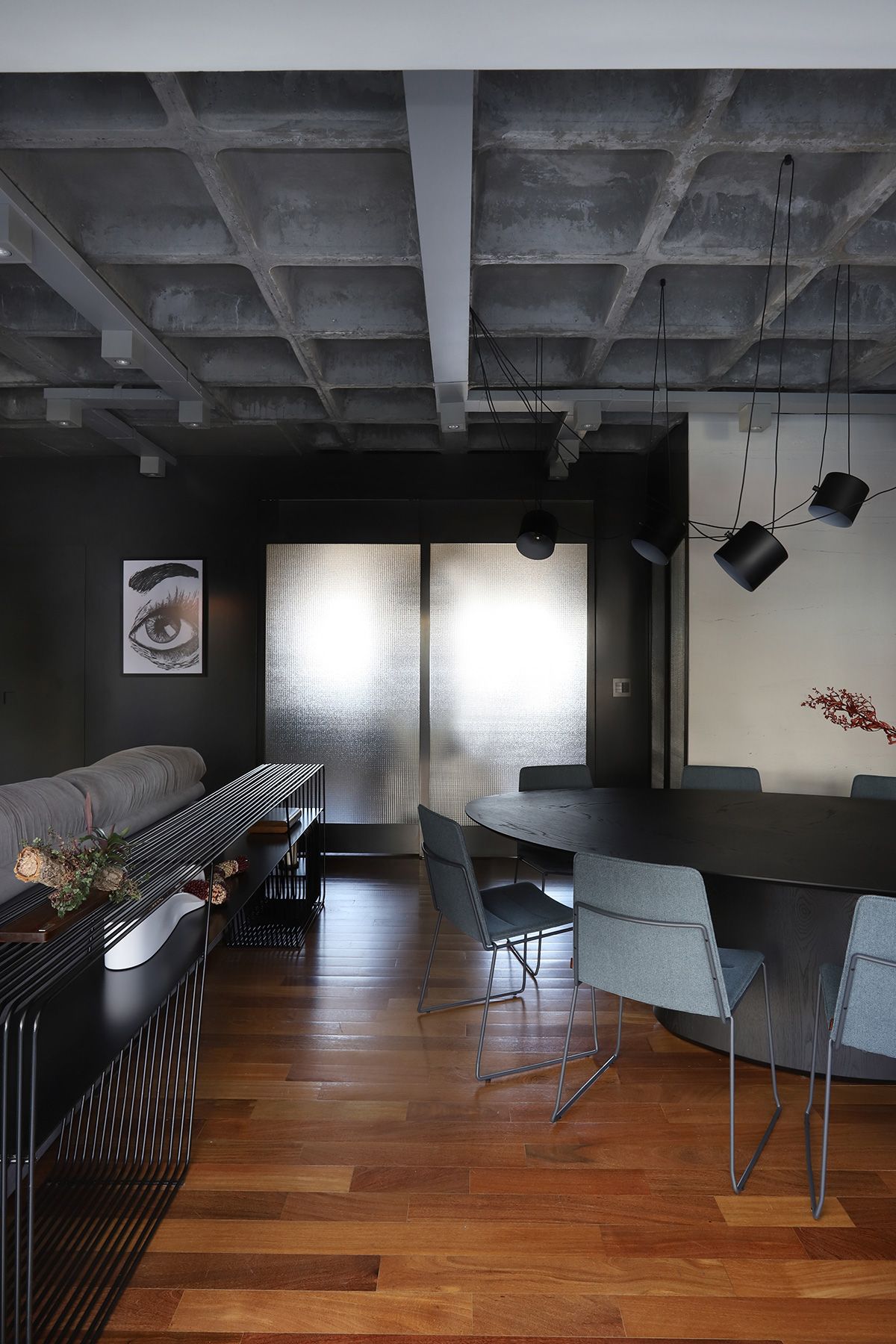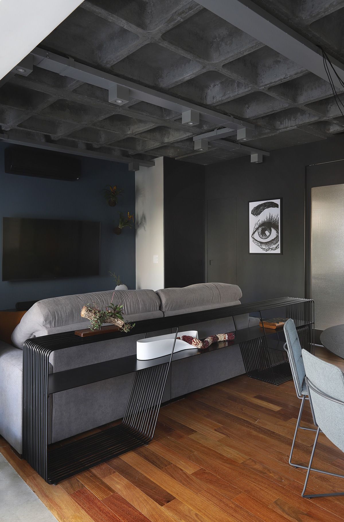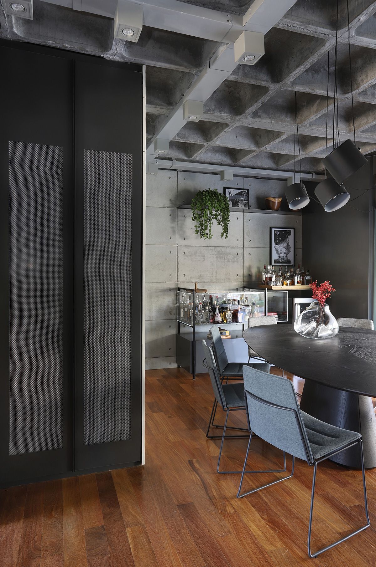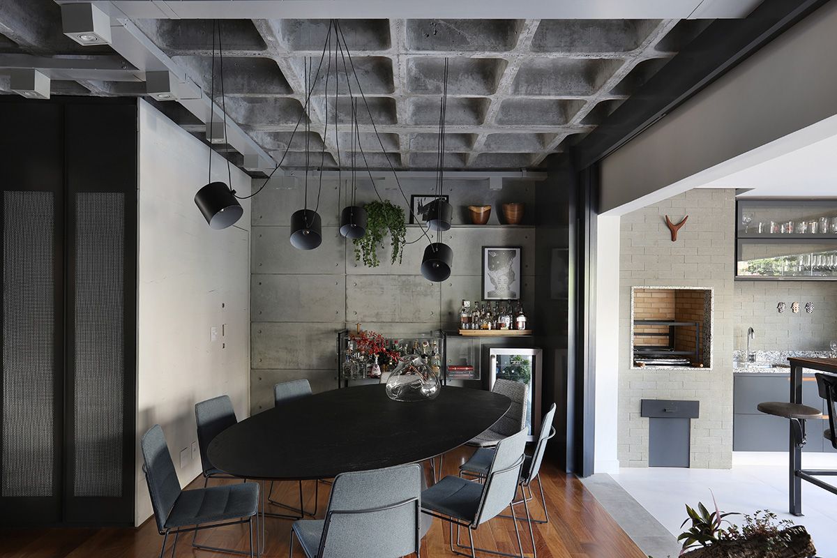 RSA: Inicialmente os clientes não queriam fazer muitas modificações, mas se animaram com as intervenções e fizemos melhorias em todos os ambientes. O conceito do projeto previa elementos industriais, mas foi durante uma visita técnica com o engenheiro da obra, que descobrimos que a laje em concreto nervurado, e refizemos o projeto luminotécnico, com a certeza que o elemento estrutural ficaria aparente.