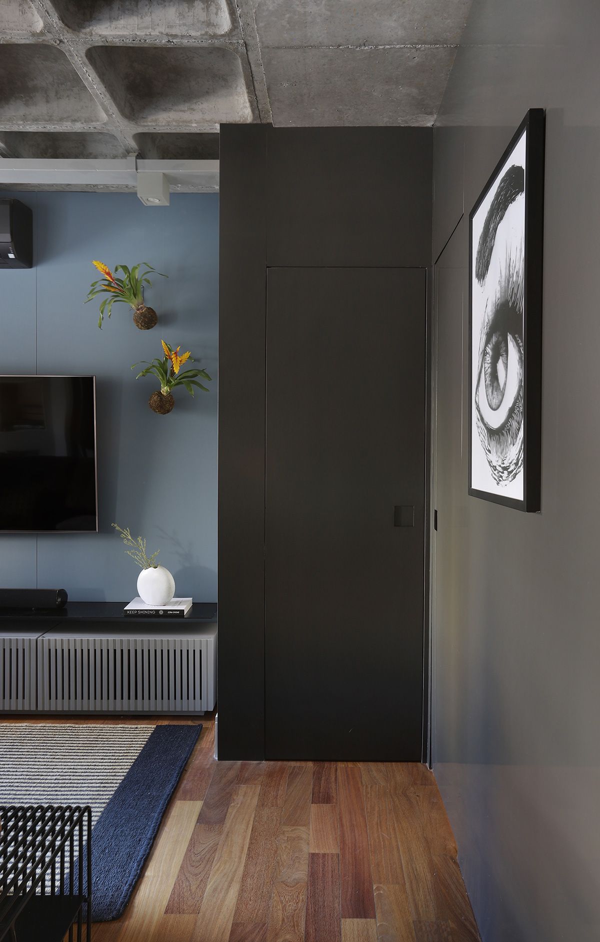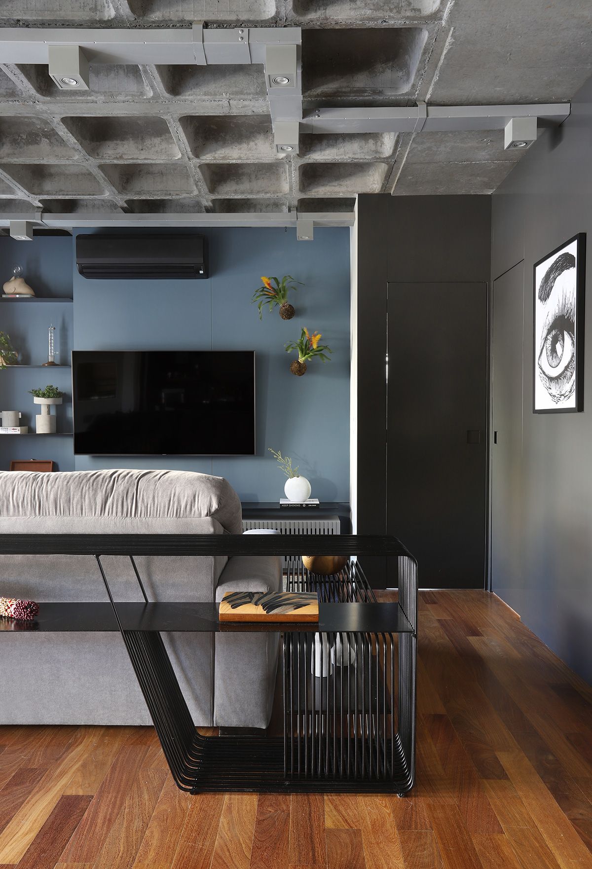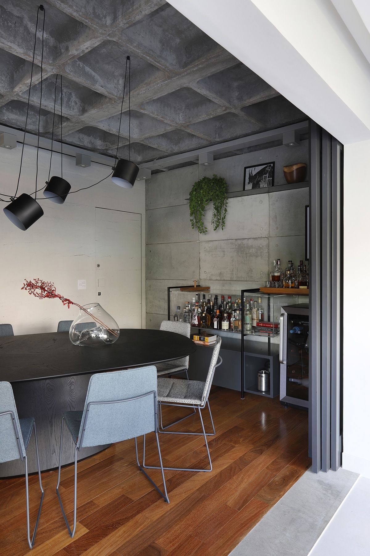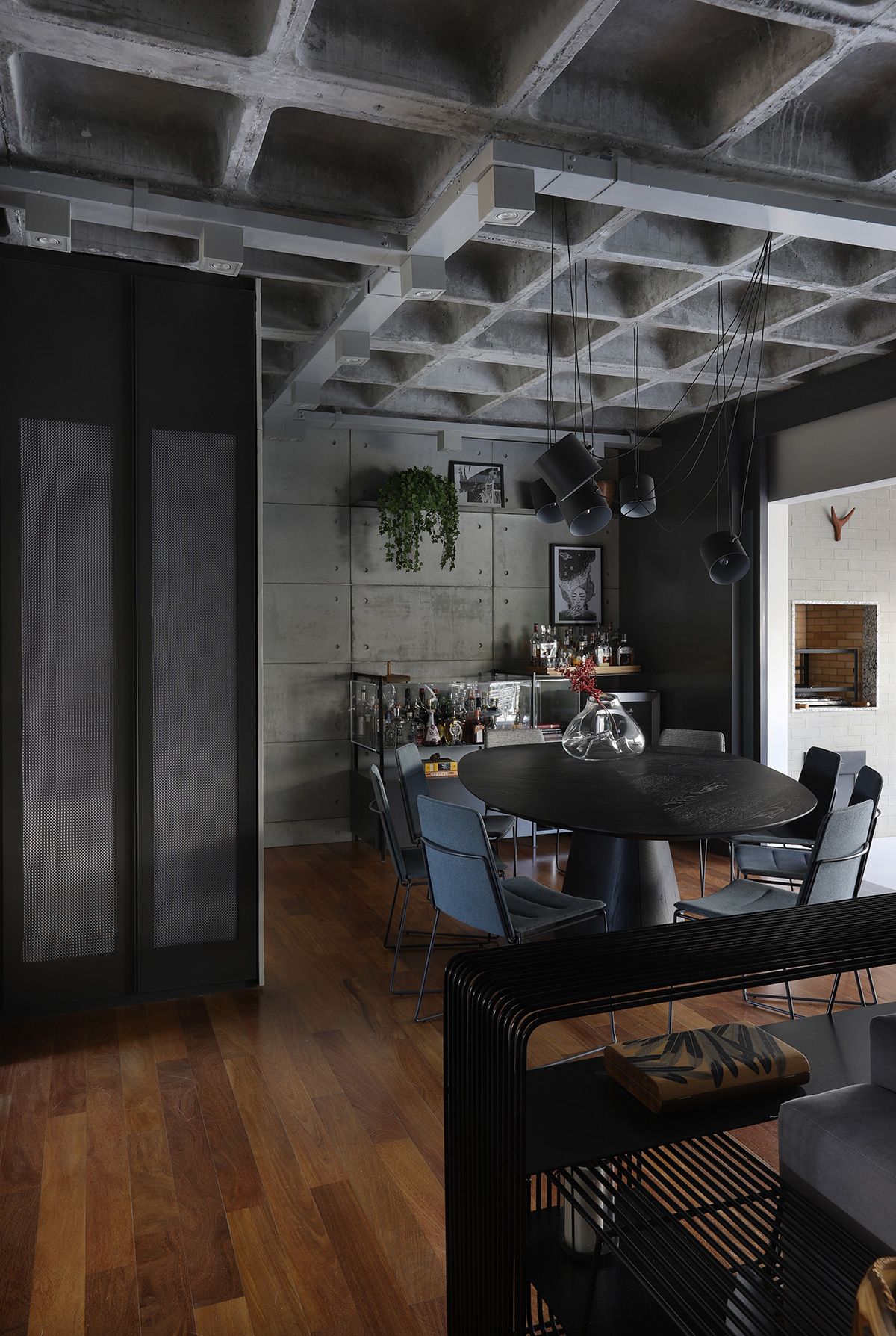 RSA: Inicialmente os clientes não queriam fazer muitas modificações, mas se animaram com as intervenções e fizemos melhorias em todos os ambientes. O conceito do projeto previa elementos industriais, mas foi durante uma visita técnica com o engenheiro da obra, que descobrimos que a laje em concreto nervurado, e refizemos o projeto luminotécnico, com a certeza que o elemento estrutural ficaria aparente.
