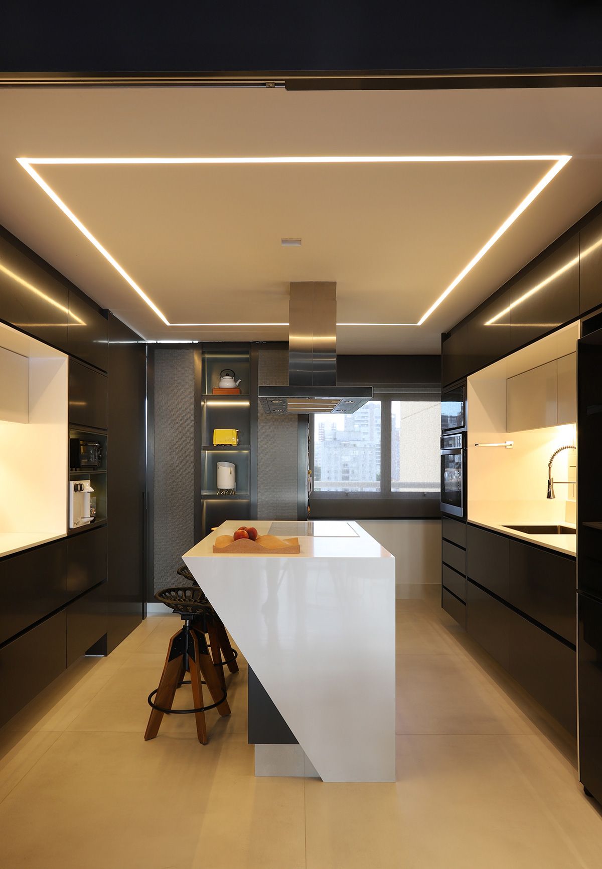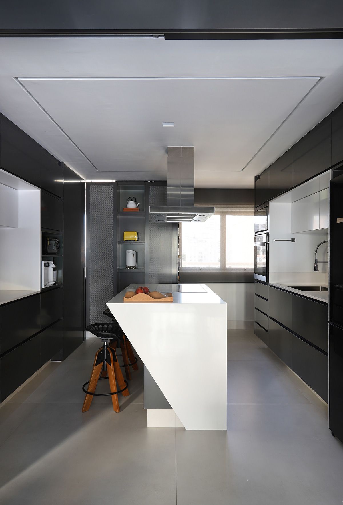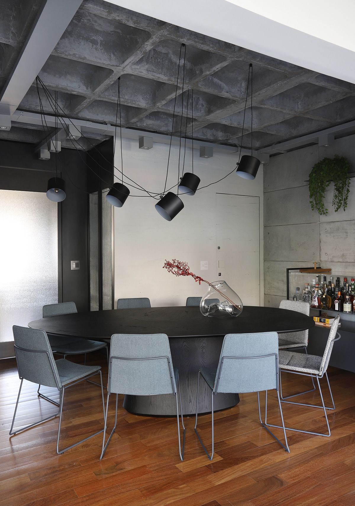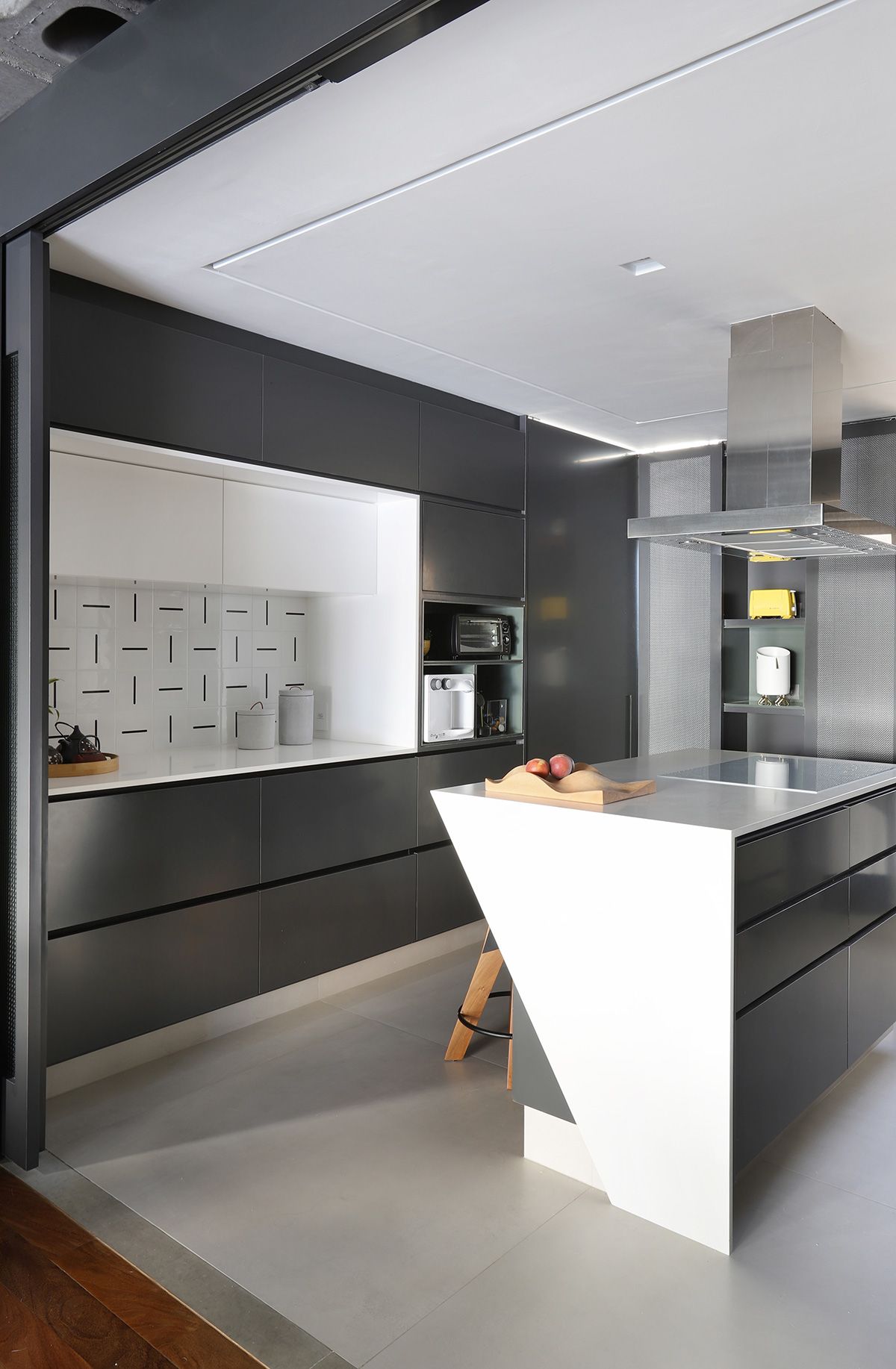 RSA: Inicialmente os clientes não queriam fazer muitas modificações, mas se animaram com as intervenções e fizemos melhorias em todos os ambientes. O conceito do projeto previa elementos industriais, mas foi durante uma visita técnica com o engenheiro da obra, que descobrimos que a laje em concreto nervurado, e refizemos o projeto luminotécnico, com a certeza que o elemento estrutural ficaria aparente.