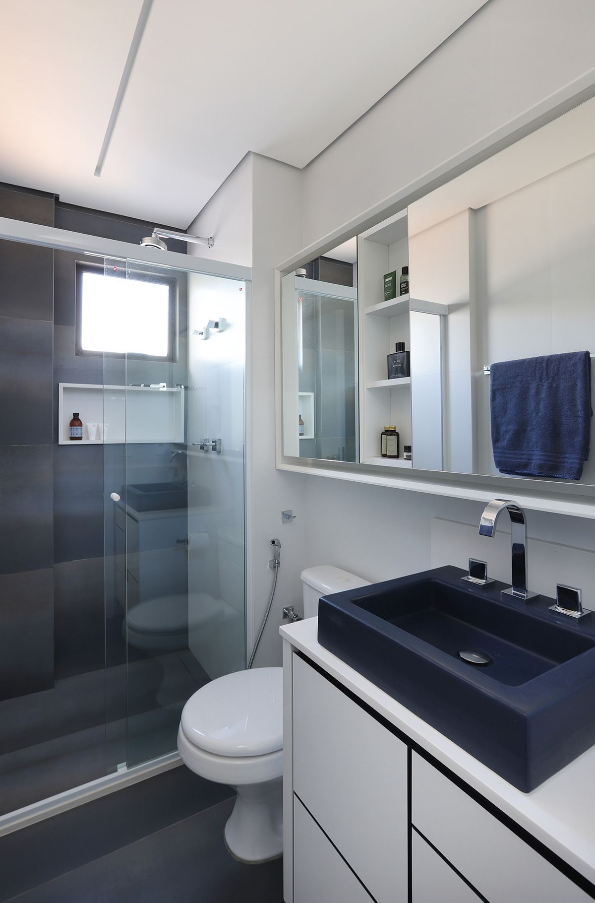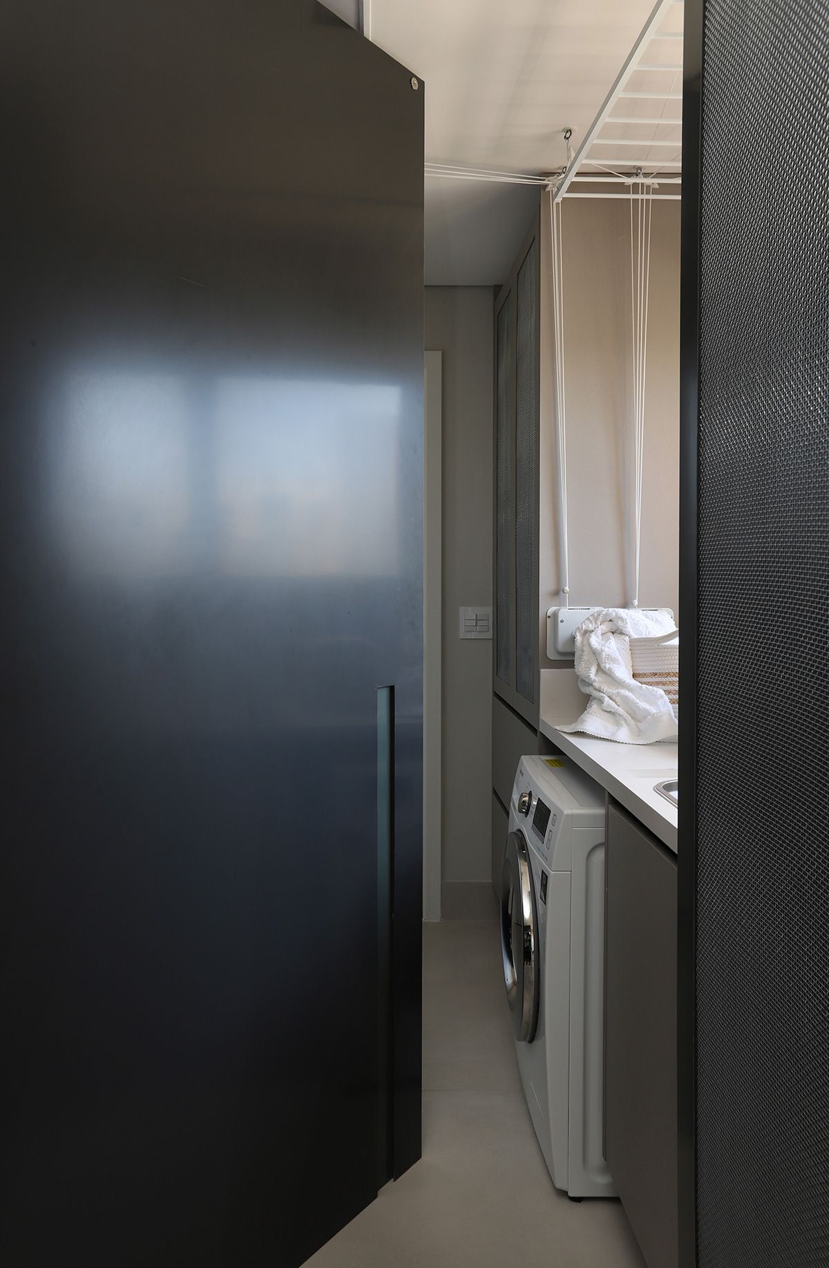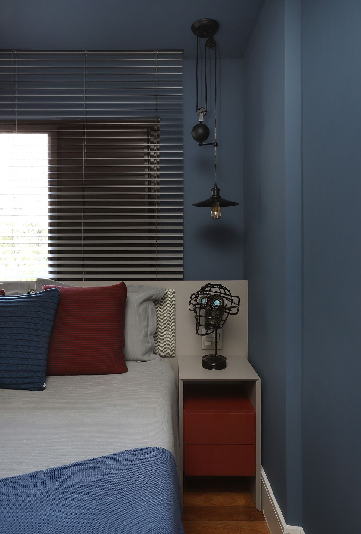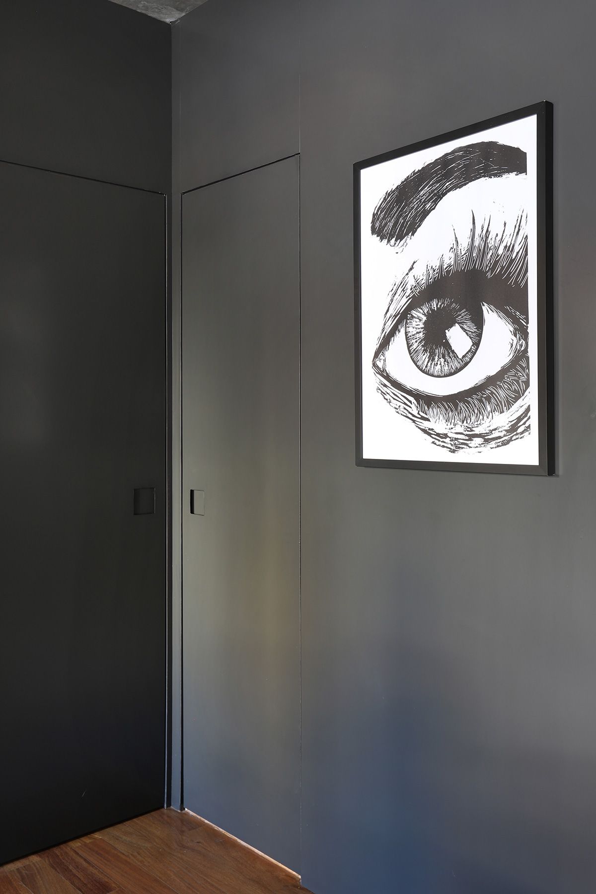 RSA: Inicialmente os clientes não queriam fazer muitas modificações, mas se animaram com as intervenções e fizemos melhorias em todos os ambientes. O conceito do projeto previa elementos industriais, mas foi durante uma visita técnica com o engenheiro da obra, que descobrimos que a laje em concreto nervurado, e refizemos o projeto luminotécnico, com a certeza que o elemento estrutural ficaria aparente.