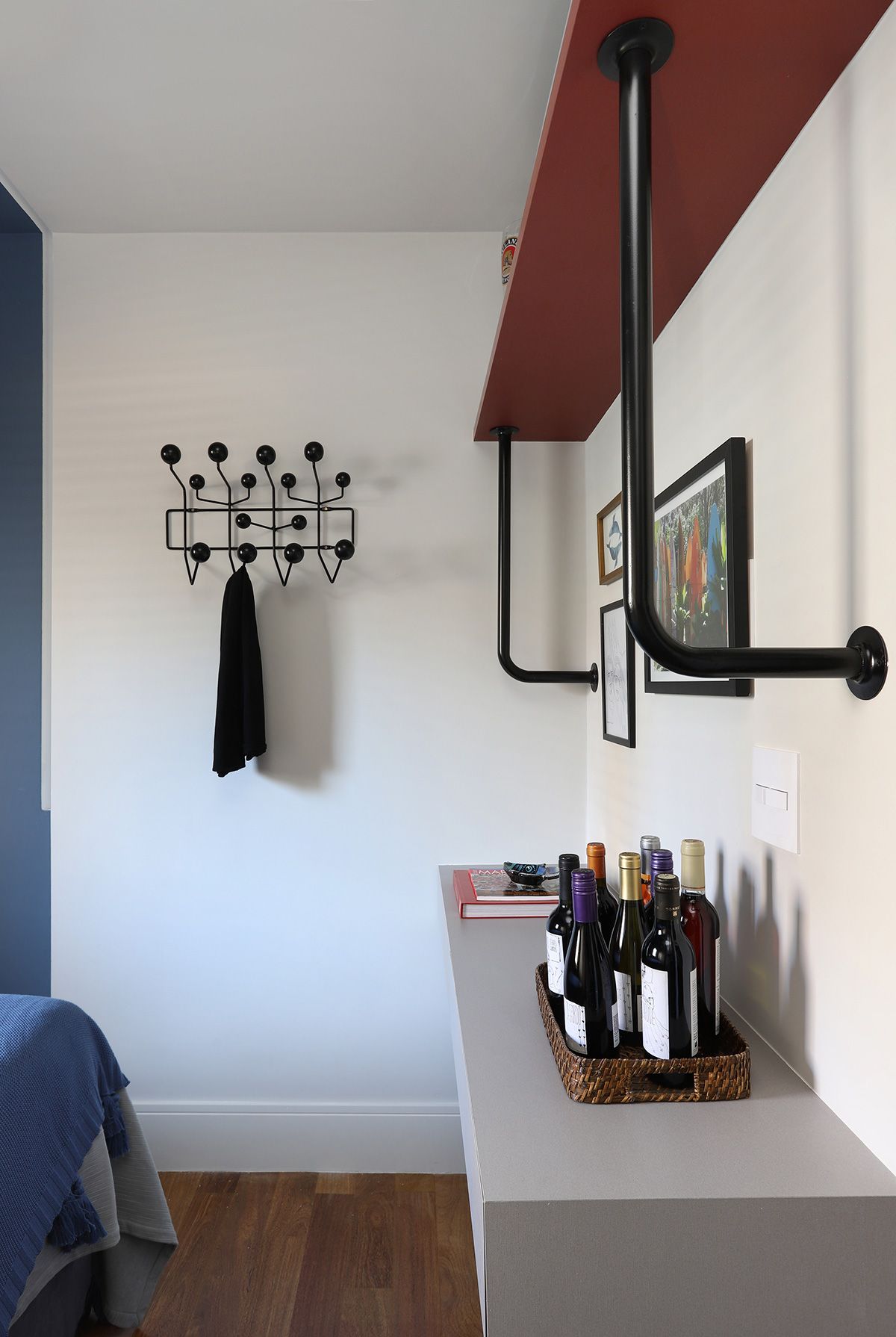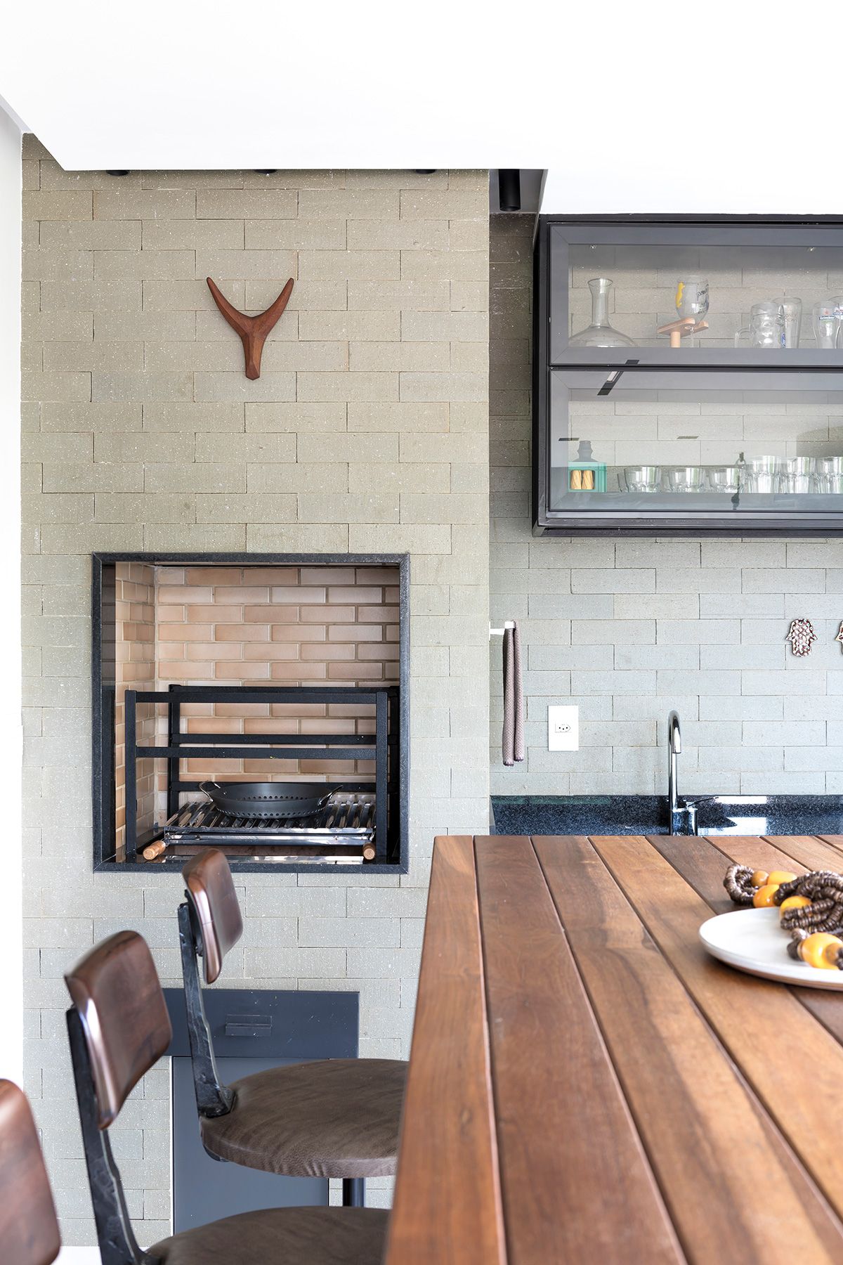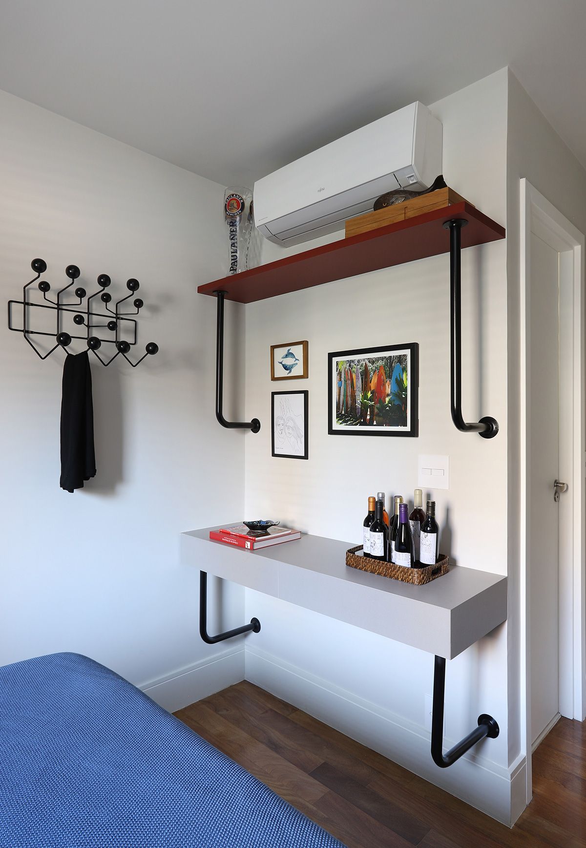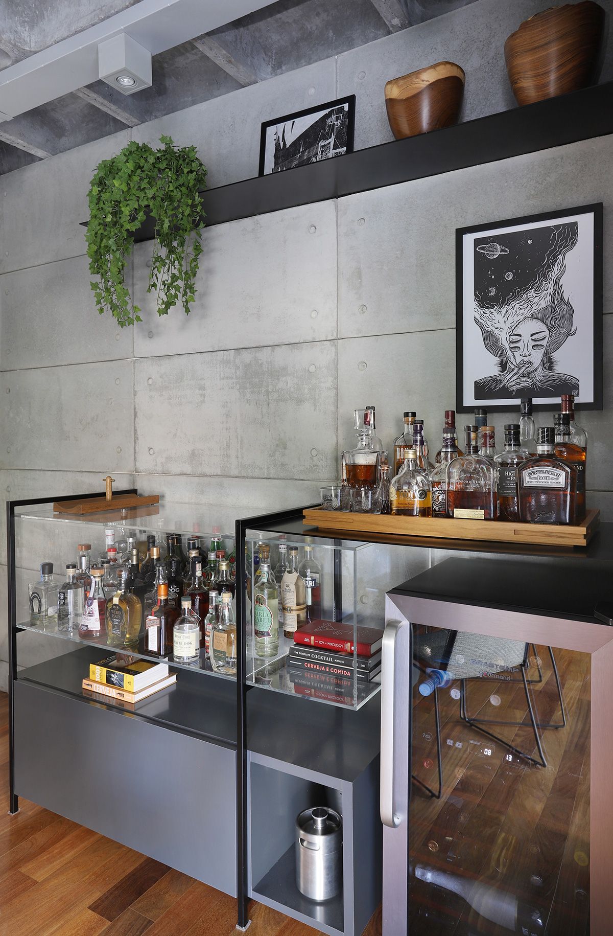 RSA: Atender as demandas estéticas da família mantendo um ambiente prático e funcional para a rotina da família, que gosta muito de receber em casa. Outro desafio foi encontrar um serralheiro que executasse com qualidade as peças que desenhamos para itens importantes para eles, como a estante de livros da Marília, aparador do sofá e bar para a coleção de bebidas do Marcelo.