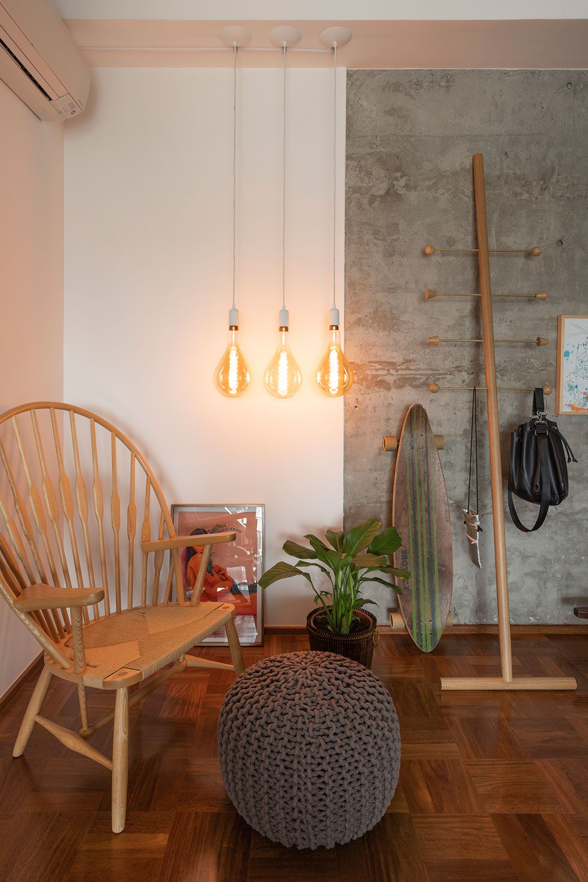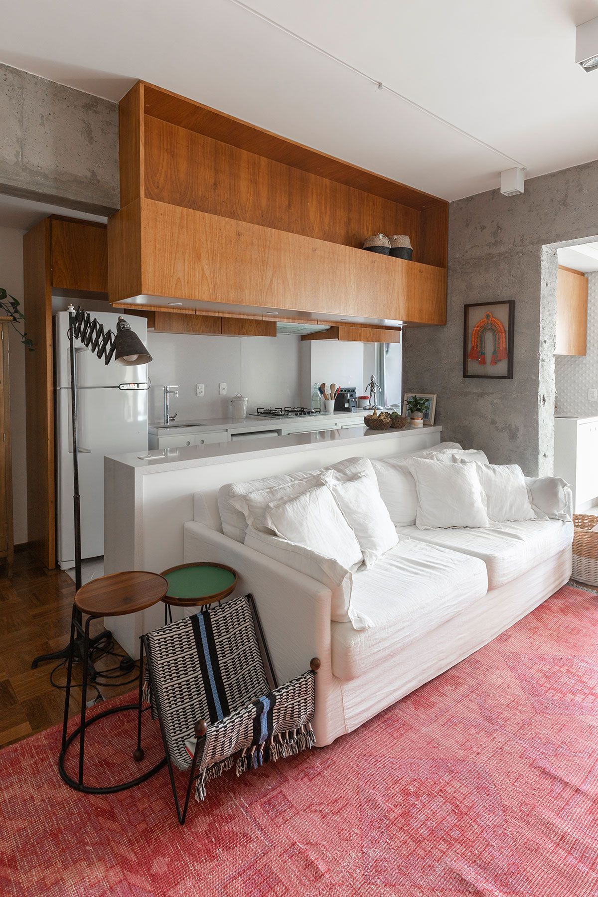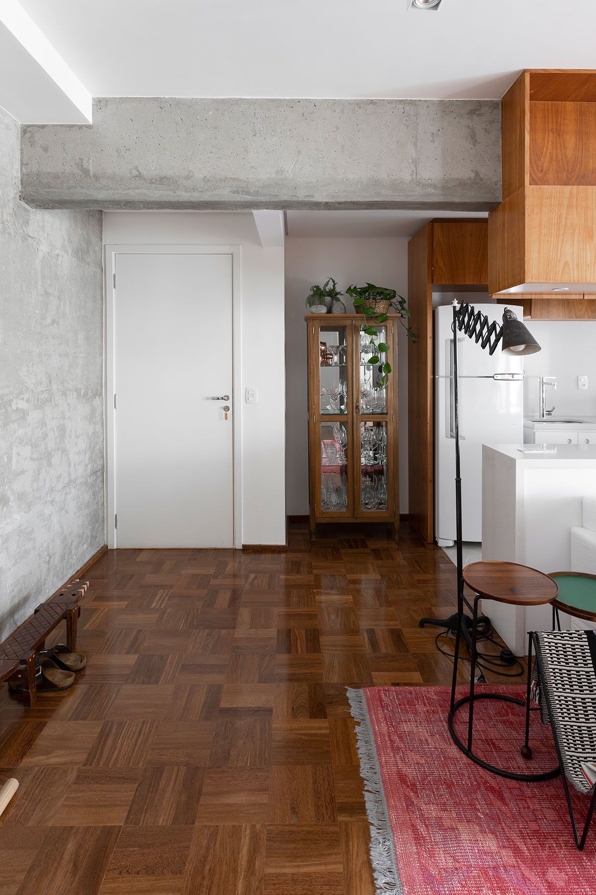 O conceito partiu da mistura de materiais urbano com a sensação de familiaridade e aconchego que só a casa dos nossos avós nos proporciona – praticamente linguagens opostas que precisariam ser trabalhadas de maneira harmoniosa. O cimento aparente foi o elemento chave que veio para quebrar um pouco da nostalgia dos elementos antigos e dos materiais mais nobres, como a madeira do taquinho, trazendo um toque moderno e jovem para esse lar. O mais incrível foi a maneira com que a Carol resolveu utilizá-lo: o elemento arquitetônico passou a ser destaque da decoração! A parede logo na entrada do apê revela a beleza orgânica do material que fala por si só.