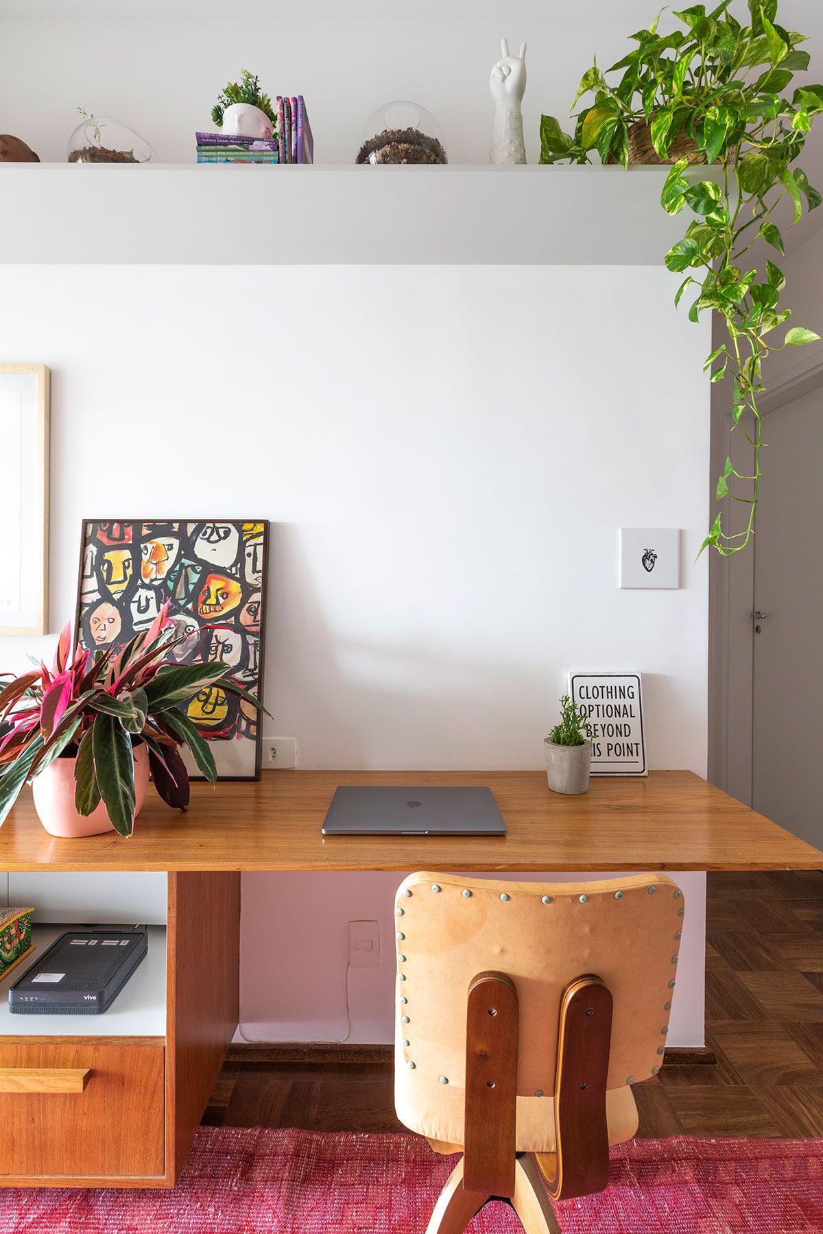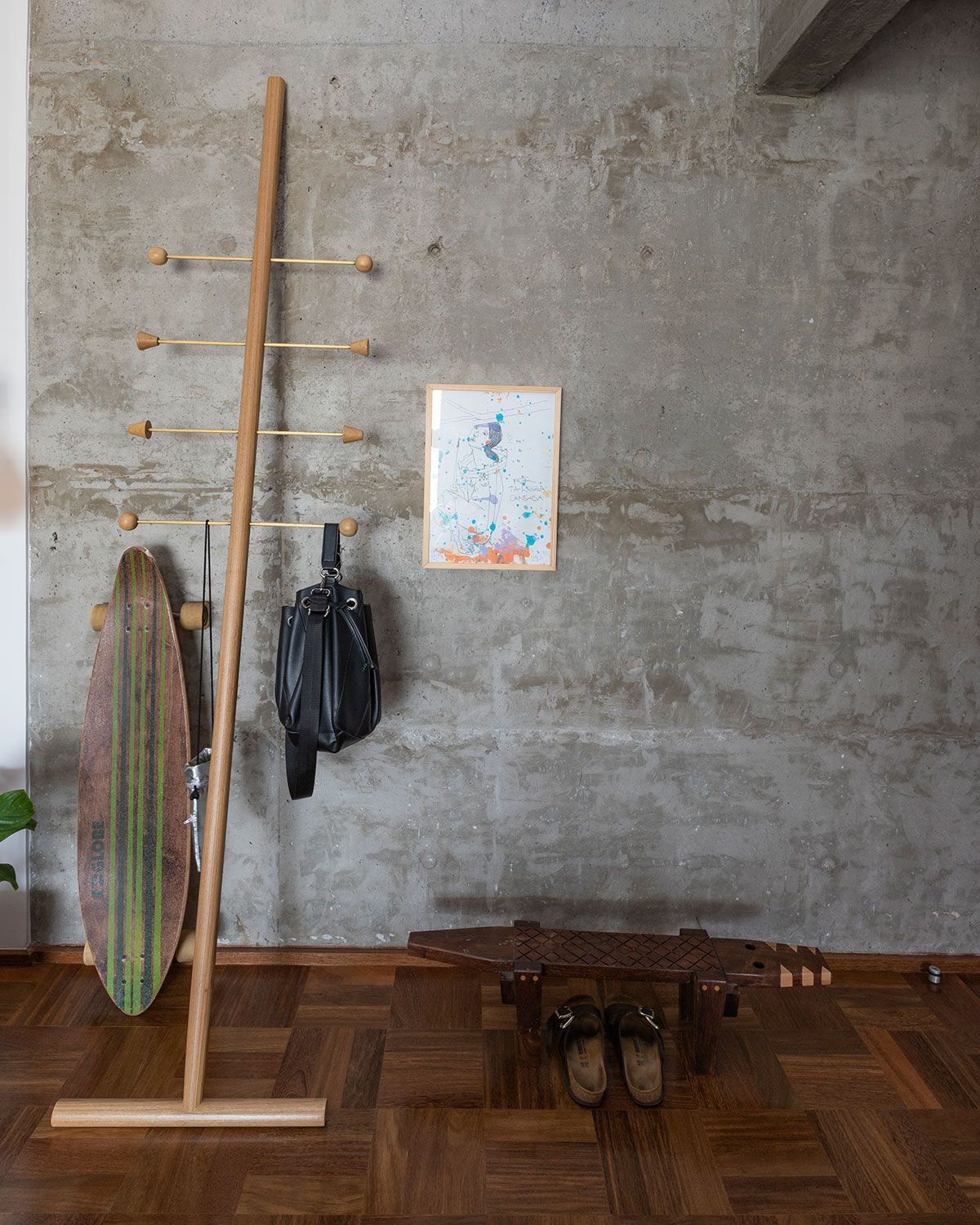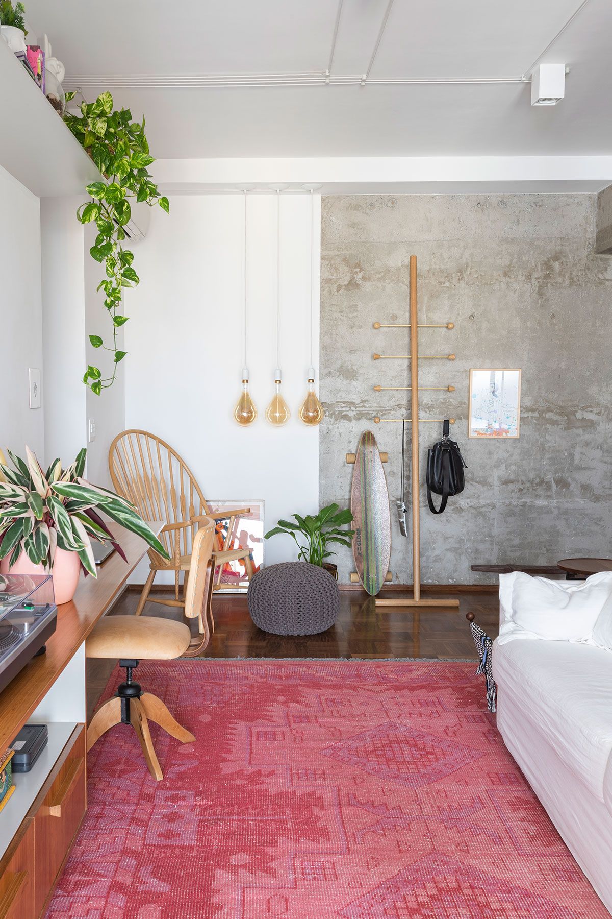 O conceito partiu da mistura de materiais urbano com a sensação de familiaridade e aconchego que só a casa dos nossos avós nos proporciona – praticamente linguagens opostas que precisariam ser trabalhadas de maneira harmoniosa. O cimento aparente foi o elemento chave que veio para quebrar um pouco da nostalgia dos elementos antigos e dos materiais mais nobres, como a madeira do taquinho, trazendo um toque moderno e jovem para esse lar. O mais incrível foi a maneira com que a Carol resolveu utilizá-lo: o elemento arquitetônico passou a ser destaque da decoração! A parede logo na entrada do apê revela a beleza orgânica do material que fala por si só.