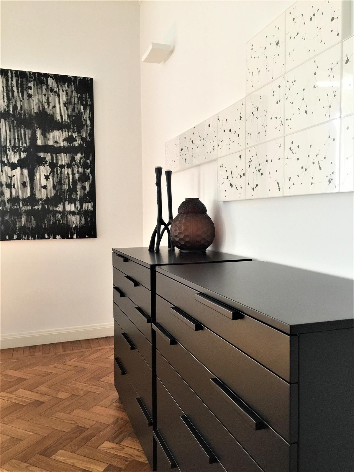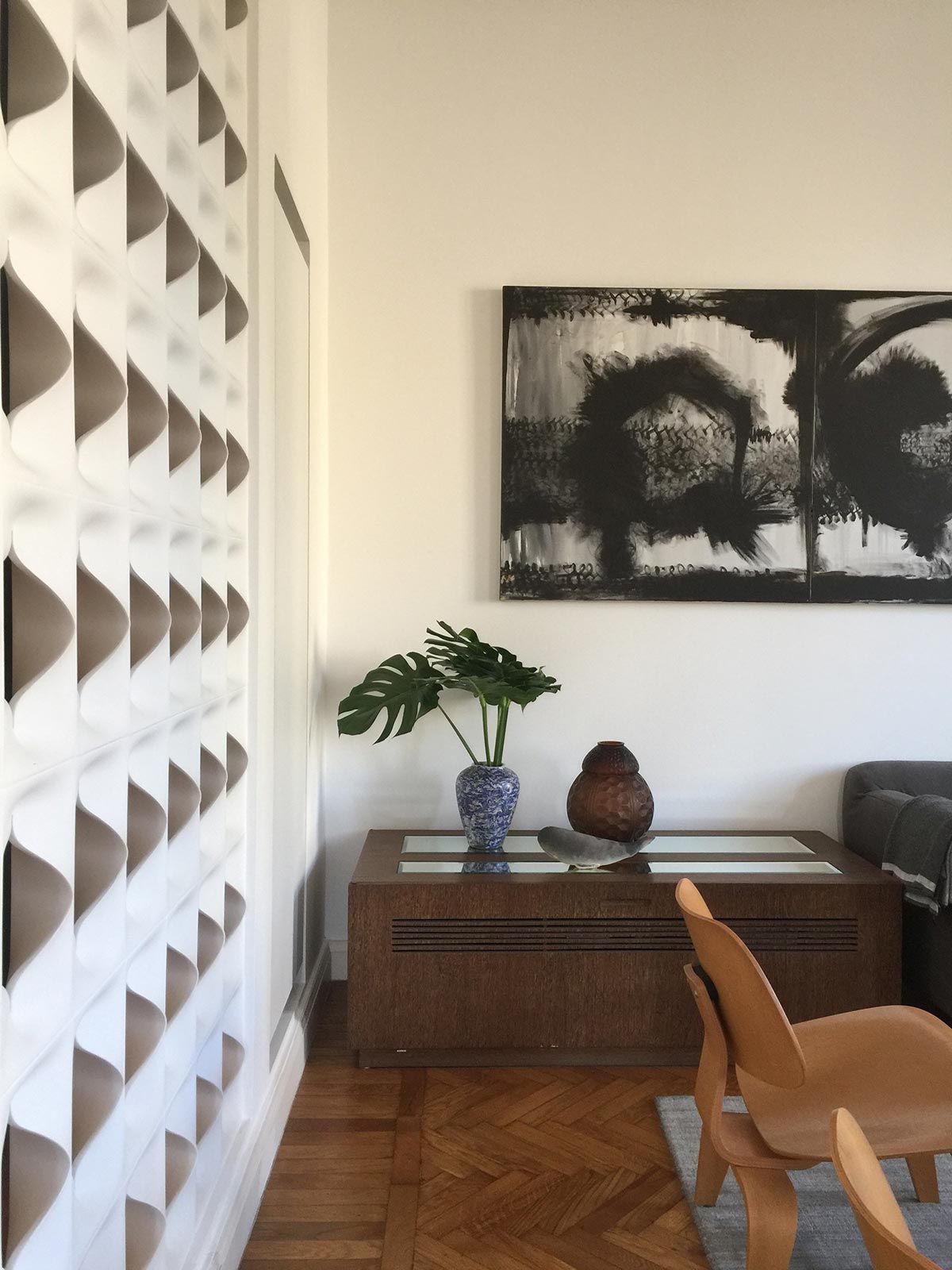 Nem preciso te falar que você vai encontrar peças lindas nesse tour, né? hahah O apartamento de 230m² fica em um prédio de 1920, bem em frente ao MUBA, numa rua linda e pitoresca. A estrutura antiga tipicamente italiana quase não sofreu interferências, com ares rústicos, portas e janelas duplas, pé direito de 3,50m, piso de madeira e palladiana na cozinha. A casa se ambientou a partir dos móveis das duas marcas da moradora e de seus objetos pessoais, que você vai ver, a Monica se empolga – e não é para menos – ao falar de cada um deles e, se não bastasse tudo isso, ela ainda adora pintar, então a maioria dos quadros do apê trazem sua assinatura também.
