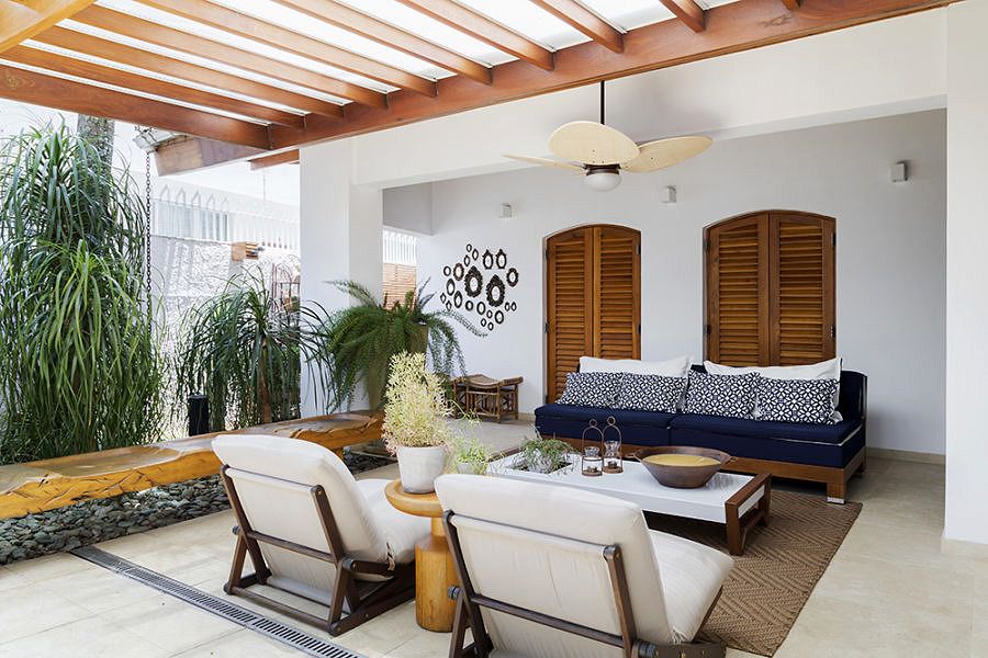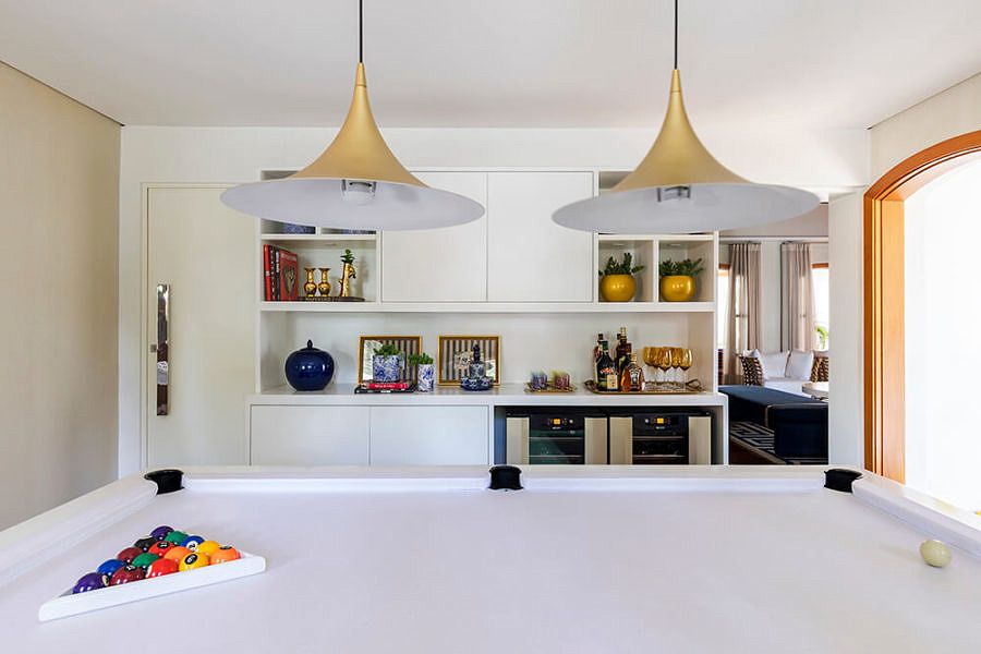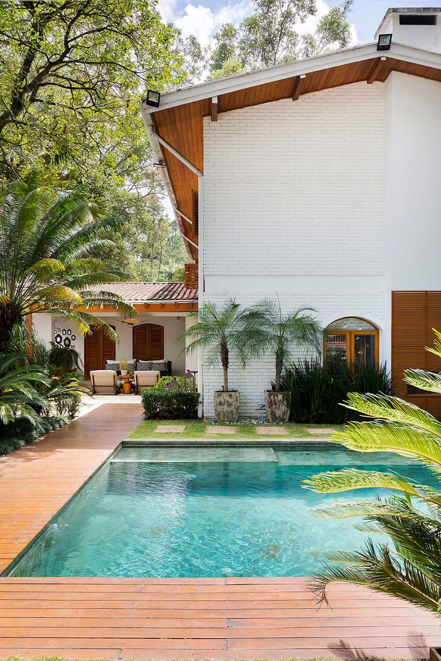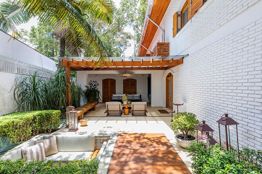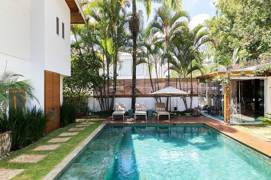 Foram dois longos anos de espera até que o sobrado ficasse do jeitinho que a Natália imaginava. Afinal, ela precisou trocar todos os acabamentos antigos que já estavam fora de moda e deteriorados demais – com exceção do piso de madeira que foi restaurado e incorporado à nova proposta de décor. “Integramos diversos ambientes, como por exemplo a cozinha que antes tinha despensa e louçaria separadas. A área externa foi toda reformulada e o espaço gourmet também integrado a área da piscina”, afirma. Apesar da mudança radical que tomou conta dos espaços internos, a arquitetura original não sofreu alterações, preservando a sua linguagem tão característica.