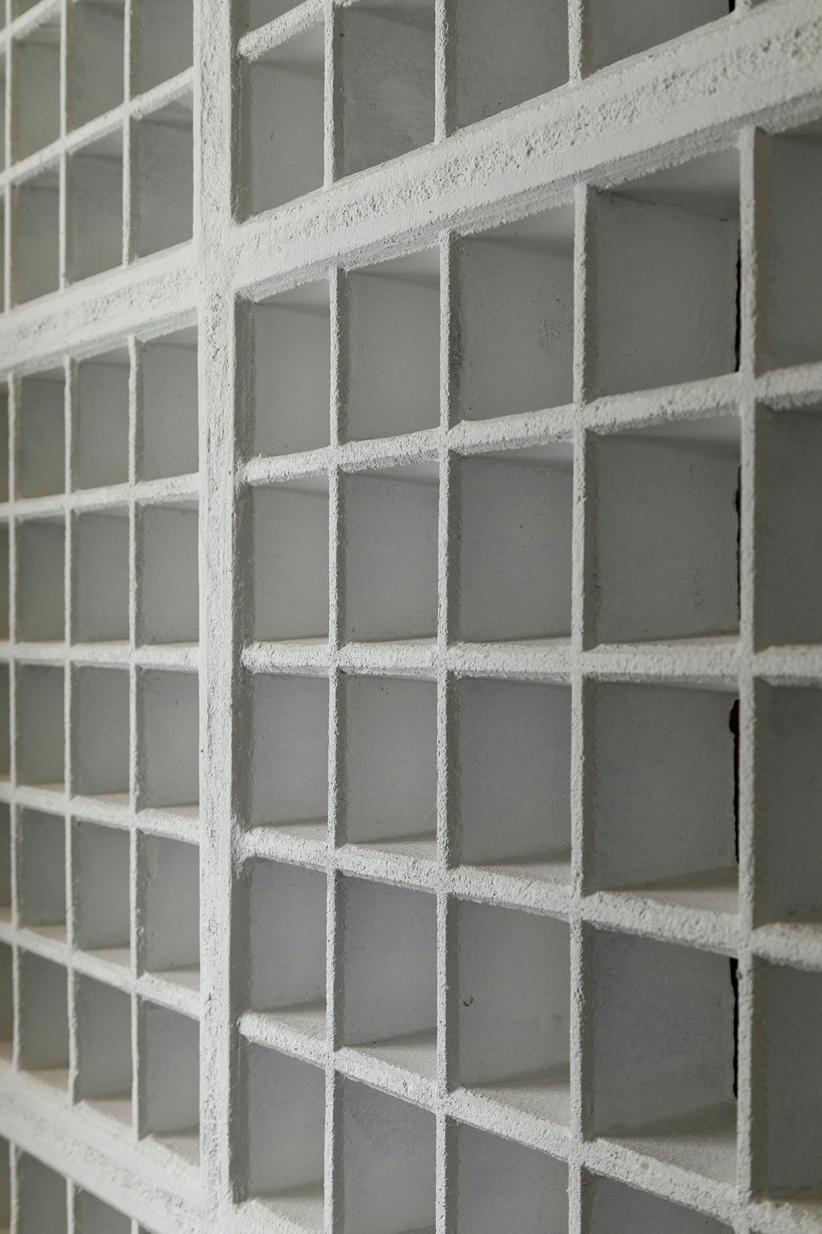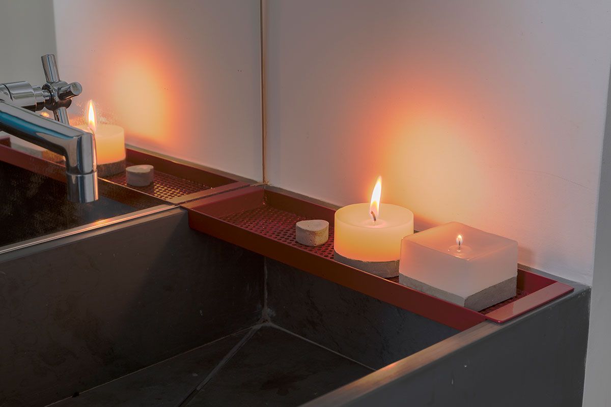 Para quebrar a sobriedade do entorno todo branco e cinza e deixar o ambiente mais acolhedor, a arquiteta resolveu brincar com alguns pontos de cor. Na cozinha, a marcenaria ganhou portas e prateleiras em um tom de vinho fechado, enquanto a cristaleira recebeu detalhes em azul. O mesmo azul também foi utilizado no ladrilho da varanda e no lavabo, garantindo uniformidade ao projeto. Aliás, foi no lavabo que a Nathália resolveu colocar os porta-velas de concreto que eu fiz especialmente para o apê dela – o passo a passo está no vídeo junto com a entrevista. Dá só uma olhadinha: