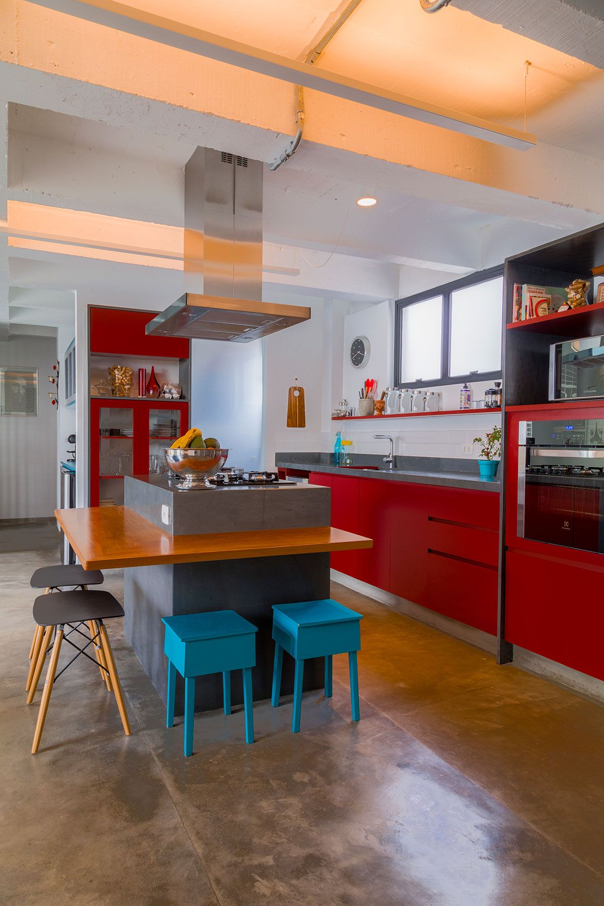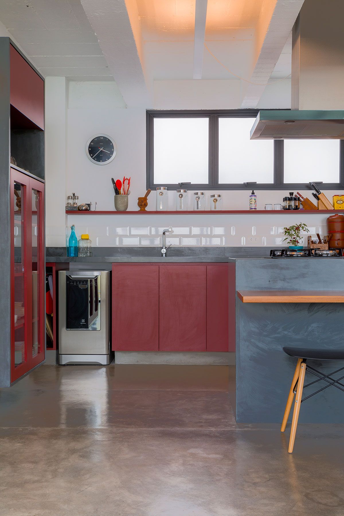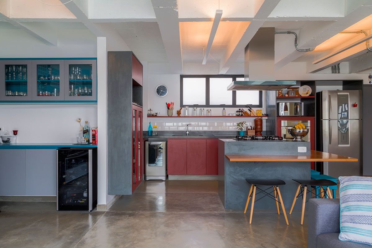 Além do piso e dos cobogós que separam o home theater no home office, o concreto também foi parar na cozinha, um dos ambientes mais charmosos do projeto – e com certeza, um dos mais utilizados pela Nathália. Anfitriã assídua, desejava que os ambientes do living se comunicassem, enfatizando o clima de receber e o convívio entre todos no dia a dia também. O espaço completamente aberto para as salas de estar e jantar ganhou uma ilha com cooktop e balção para refeições, um verdadeiro convite à convivência: enquanto ela prepara as refeições, pode bater um papo com o marido e o filho ou com seus convidados.