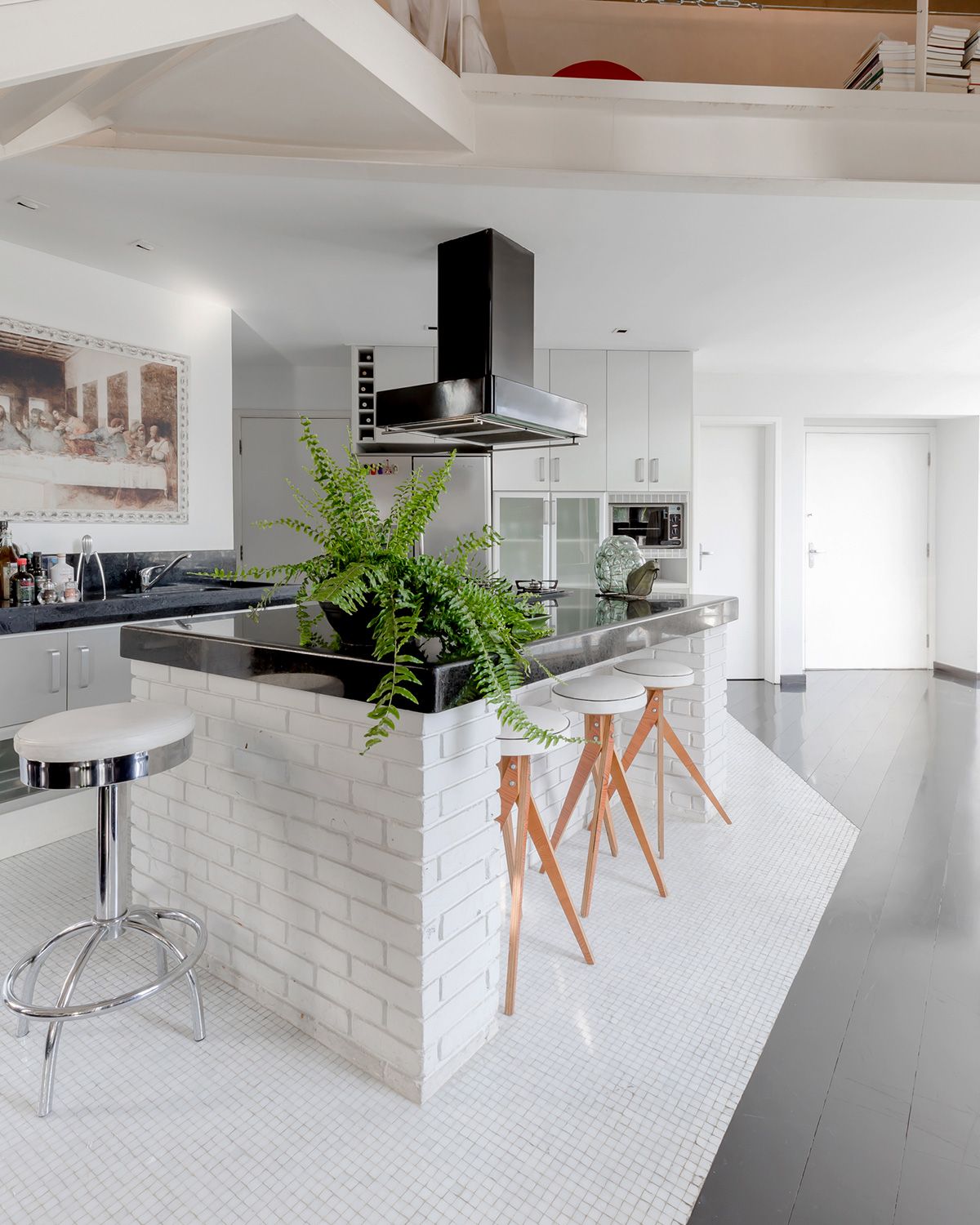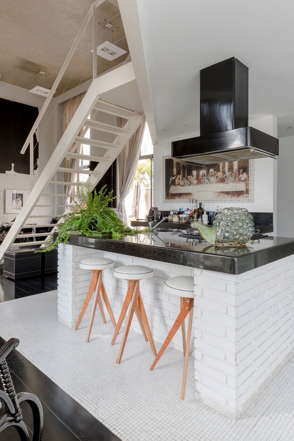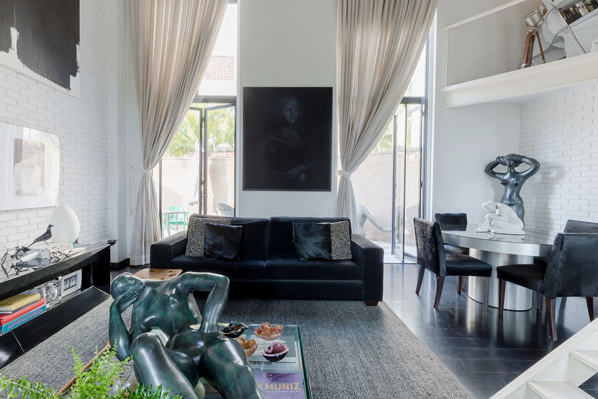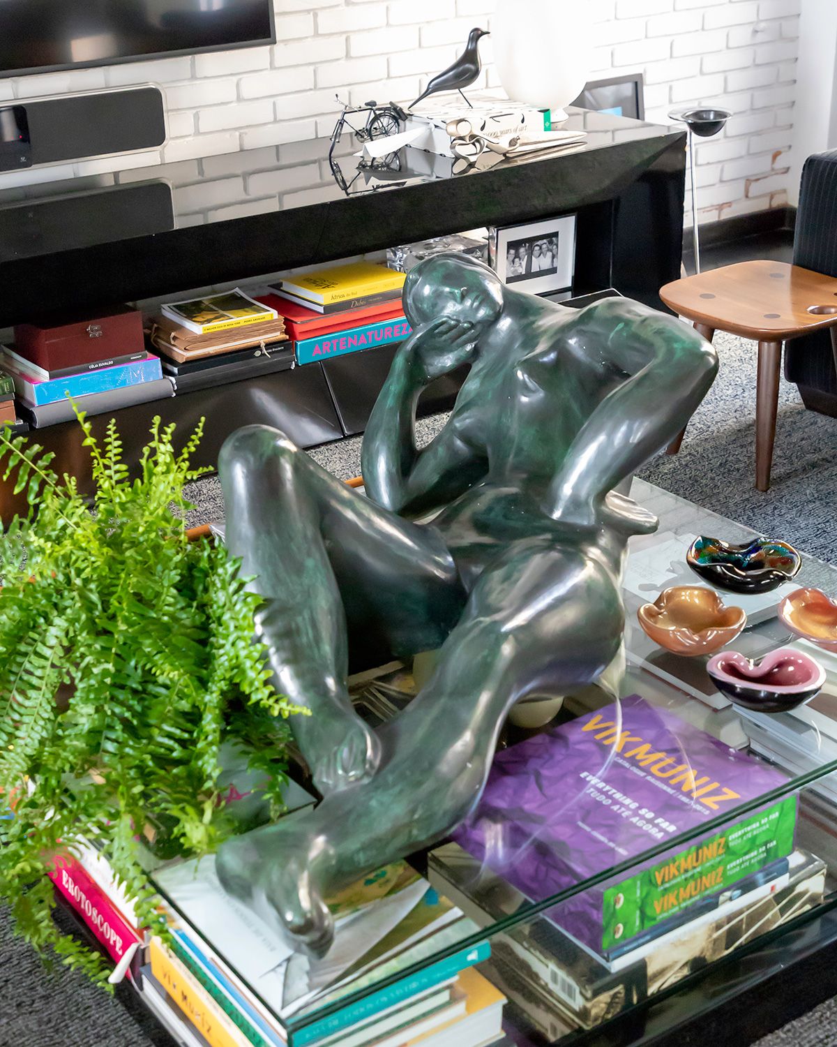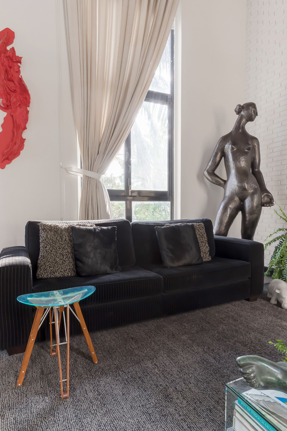 O décor que gira em torno do branco, preto e cinza funciona como base para as obras de arte se destacarem no espaço, a maioria da artista Sonia Ebling, além dos objetos pessoais cheios de história, como a cadeira de balanço que era da bisavó da moradora. Por mais que a arquiteta seja do interior, ela vive em São Paulo há 15 anos e a atmosfera urbana da cidade a encanta demais; receber e aproveitar o apartamento nos fins de semana está entre seus favoritismos: