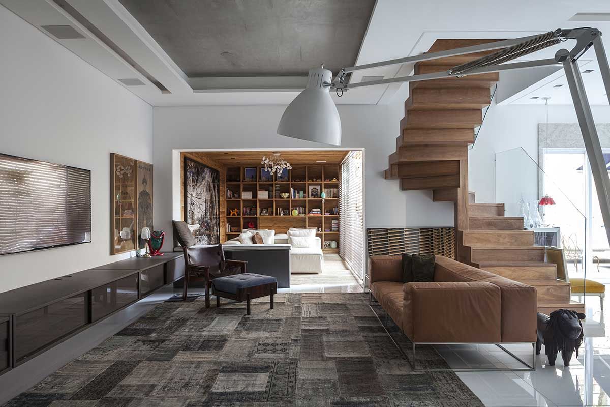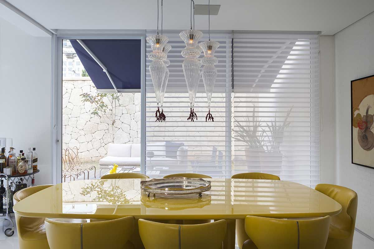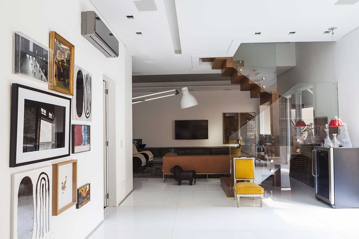 Existem diversos apartamentos que lembram casas, mas esta aqui é realmente uma casa incrustada dentro de um prédio. O apartamento/casa que o arquiteto Olegário de Sá escolheu para chamar de seu fica no primeiro andar de um predio de 4 andares no bairro da Vila Nova Conceição que, não por coincidência também é o bairro que também abriga o seu escritório, que fica há alguns passos deste endereço.