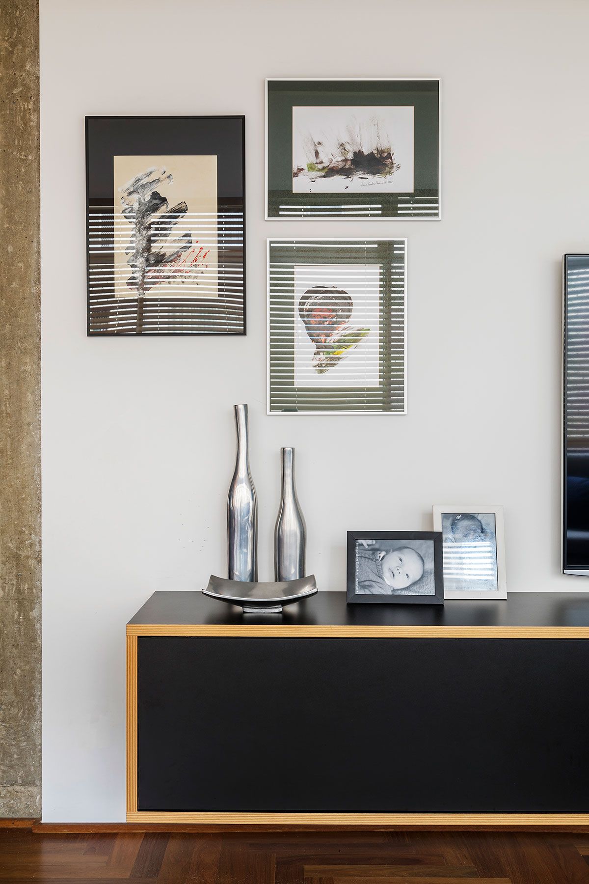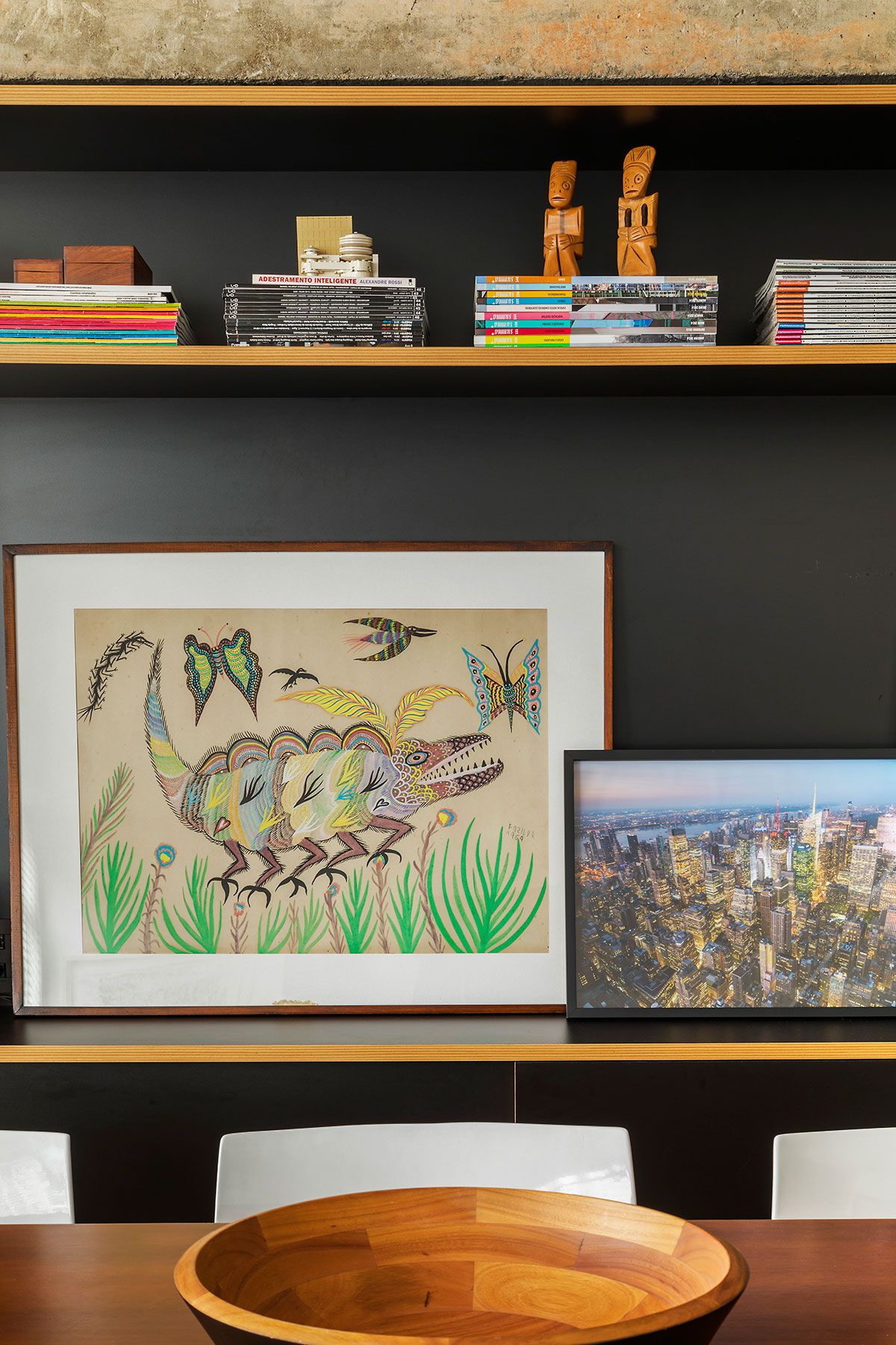 Renato: Eu toco guitarra e violão, tocava com maior frequência na adolescência, gostava e ainda gosto bastante de heavy metal, hoje em dia é mais difícil tirar eles da parede mas eventualmente ainda brinco um pouco, as crianças também pedem para “tocar a guitarra do papai”, obviamente só para tirar onda, ainda são muito pequenos. A marcenaria sob a guitarra abriga um pequeno amplificador e a pedaleira de efeitos.
