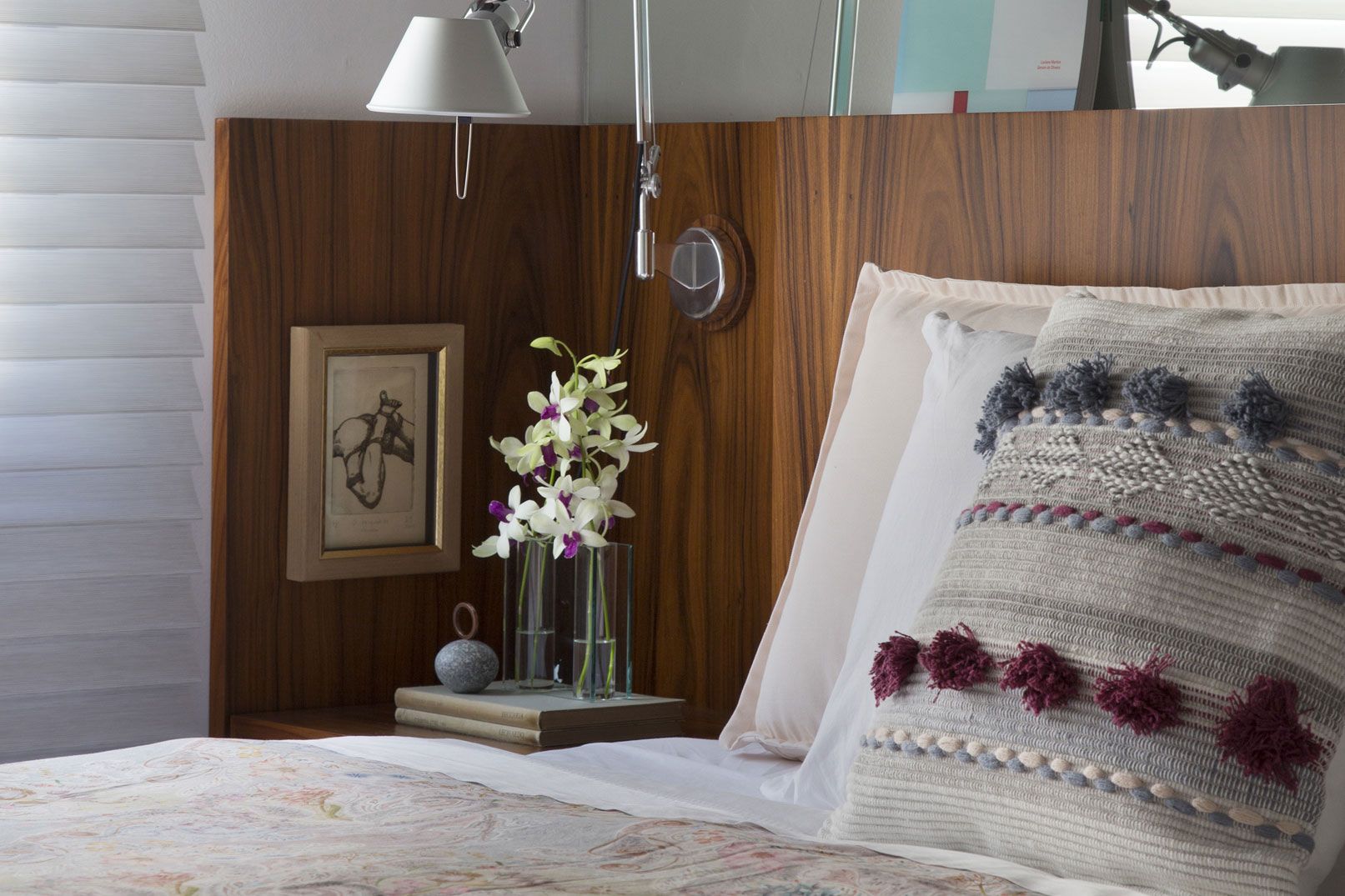 Para o Thiago, decorar o seu ninho paulista foi uma tarefa deliciosa. Ele desejava enfatizar a sua conexão com a Bahia, onde mora, nos detalhes decorativos. Na estante, além de obras de artistas baianos, desenhos de amigos e objetos garimpados, colocou a miniatura da mesma poltrona de palha que possui em tamanho real na sua morada em Salvador. Até o tapete em padrão geométrico faz referência ao seu lar oficial, mas de uma maneira inusitada: enquanto lá ele usou uma composição de almofadas coloridas e tapete preto e branco, aqui inverteu a proposta deixando a cor para o tapete.
