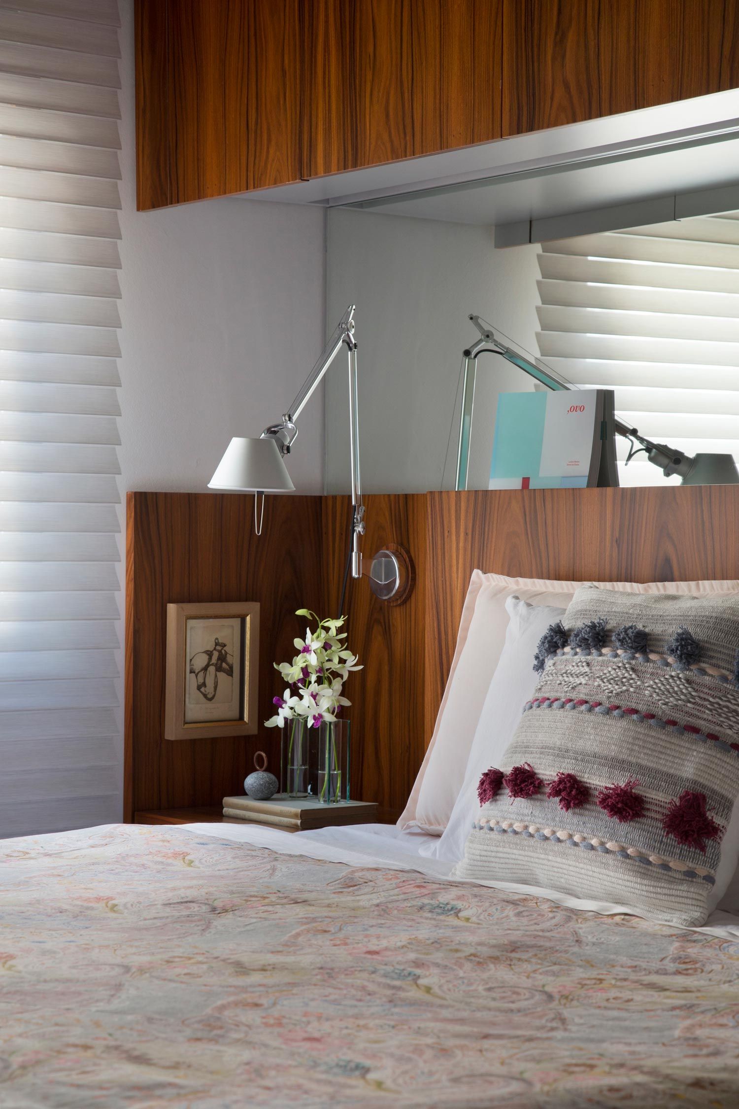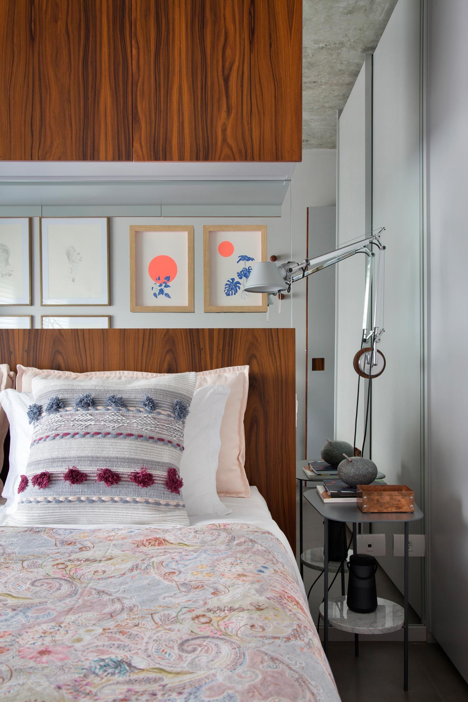 Não é à toa que o espirito do apê é o mesmo de um longo braço apertado cheio de história. Cada canto guarda uma surpresa, um acúmulo de objetos meticulosamente escolhidos e dispostos de uma maneira quase poética. “Casa com cara de lar vai além do físico, é a atmosfera que ela tem. A varanda, as plantas, a maneira que produzi as superfícies, tudo isso junto revela esse jeito de casa”, comenta. São tantos objetos de valor sentimental que o Thiago não consegue eleger apenas um predileto. Do relógio de parede da Vitra pendurado a cima da porta de entrada ao pendente da sala de jantar, verdadeiro sonho de consumo, todos guardam uma história e foram escolhidos com propósito e destino certos. Como é o caso do cabideiro Stand By, de Claudia Moreira Salles, que reina soberano no quarto do arquiteto. “Não penduro nada nele porque pra mim ele é uma escultura. O desenho é de uma sutileza única, a tradução da elegância na simplicidade. Essa peça é realmente especial”.