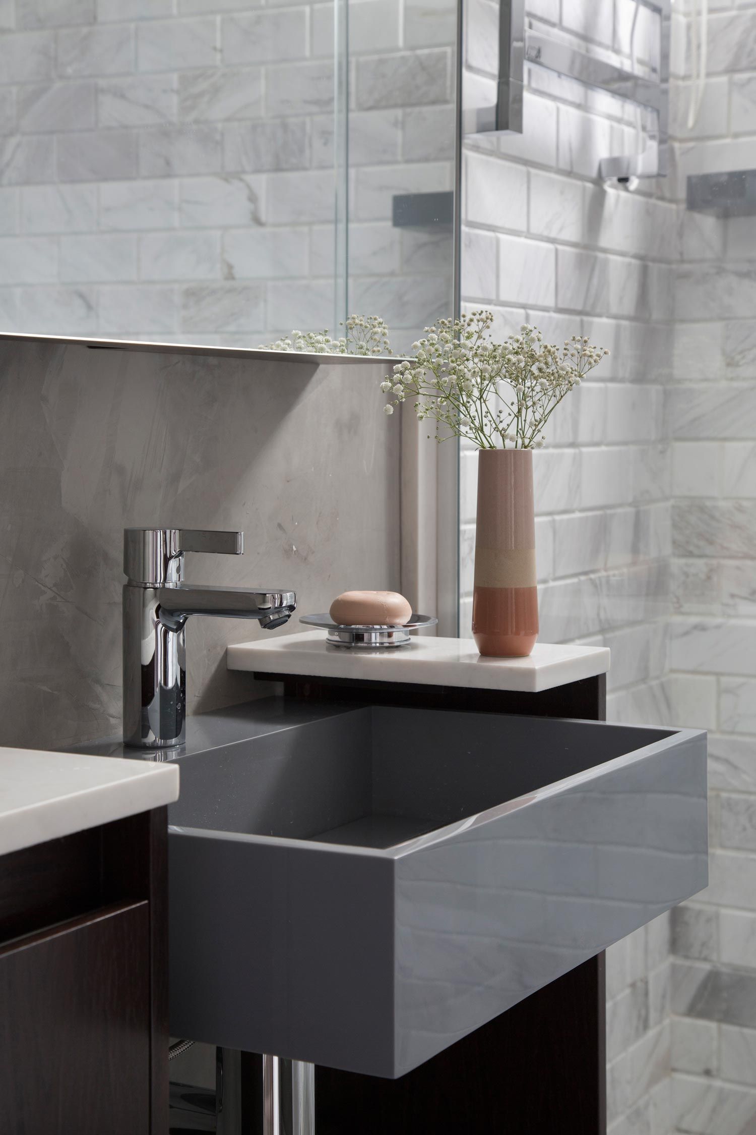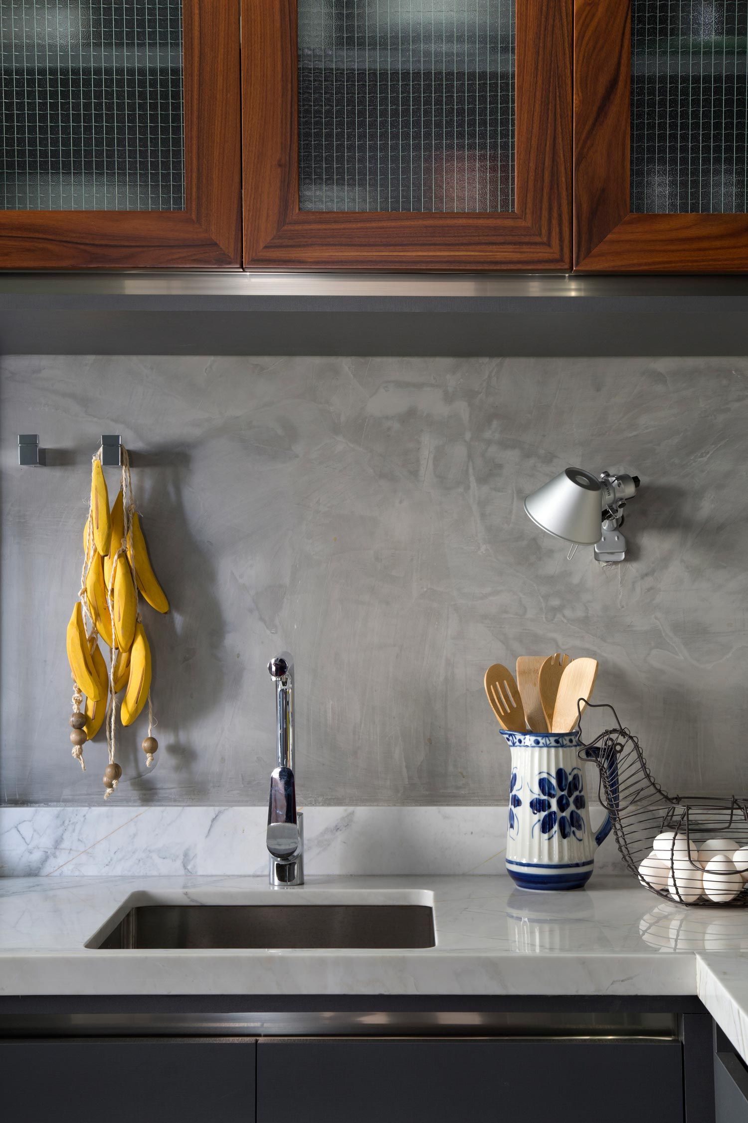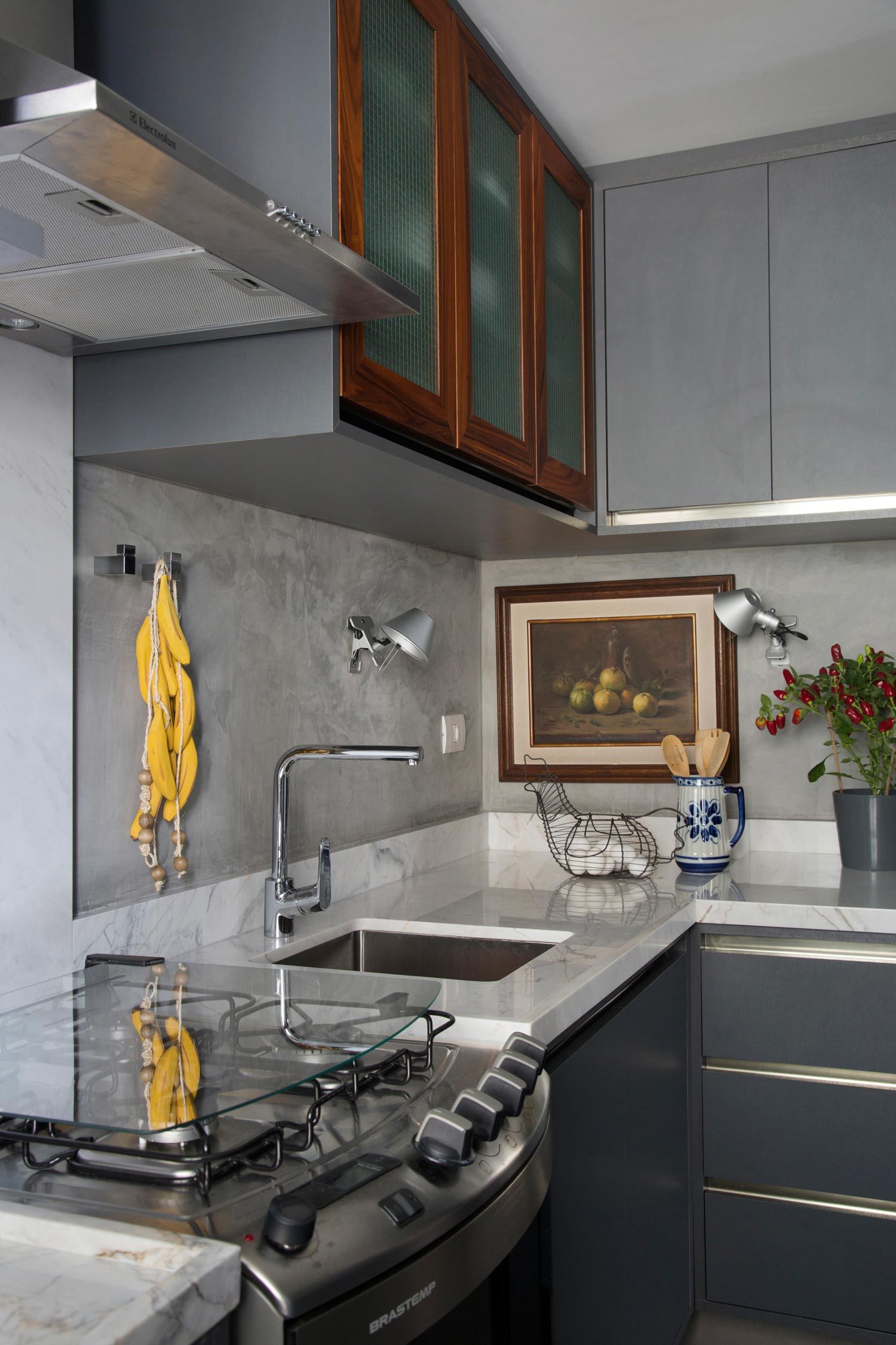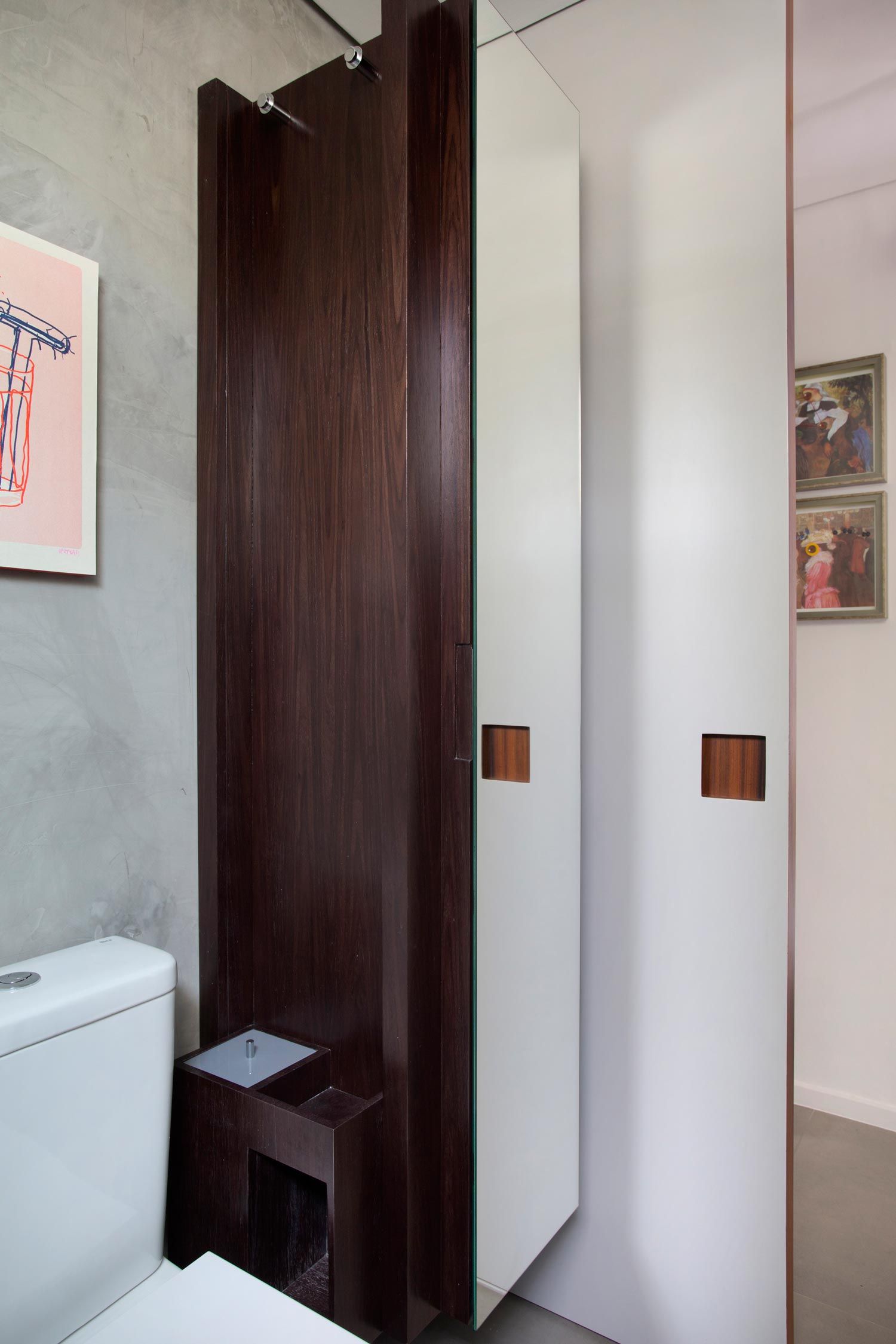 O processo de criação do arquiteto Thiago Manarelli não depende apenas de escolhas estéticas e práticas. Ele, que é sócio do escritório Manarelli Guimarães Arquitetura, prefere ir além e produzir espaços sem um estilo definido, mas que traduzem na junção de elementos as características da construção e das pessoas que nela habitam. “É como se o prédio falasse com a gente”, resume com muito bom humor. E foi assim que ele começou a desbravar a arquitetura do seu próprio apartamento em São Paulo à procura de pistas que o inspirasse na concepção do novo projeto. Como contei pra vocês na primeira parte deste Open House, o Thiago descobriu ao acaso a existência da laje de concreto e a partir dela, foi costurando referências de cores e revestimentos. O resultado foi um entorno super neutro em tons de cinza que valoriza todo e qualquer objeto inserido nos ambientes.
