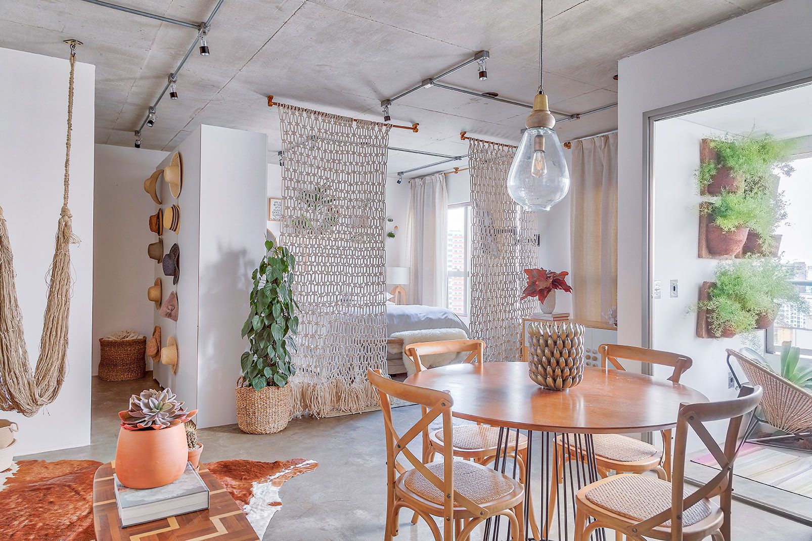 Um apartamento com jeito de casa, composto por ambientes abertos pra lá de convidativos que servem de cenários para recepções superdespojadas. Um lugarzinho todo revestido de cimento, mas que mesmo assim é cheio de aconchego graças ao emprego das texturas naturais e dos hangers e vasos que trazem a natureza para dentro. O lar da decoradora Tuca Benetti é tudo isso e mais: também funciona como seu escritório e espaço para reuniões onde seus clientes são sempre bem-vindos!