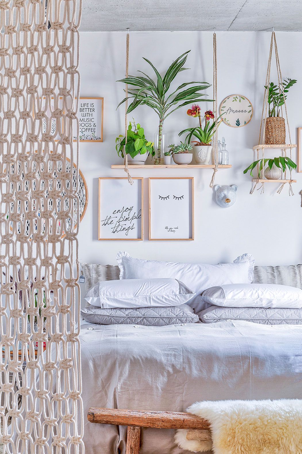 Na primeira parte deste Open House – se você ainda não viu, te aconselho a começar por ele! – mostrei principalmente a área social do apartamento, mas como ele tem o layout integrado, deu para matar um pouquinho da curiosidade e espiar o quarto da Tuca lá se longe. Pois é, esse cômodo que fica aberto para a sala é um dos mais charmosos, muito em razão da cortina de macramê que o delimita de forma discreta e moderninha. A moradora se empenhou de verdade para deixar o quarto acolhedor, incluindo alguns quadrinhos inspiradores nas paredes e muitas plantinhas – as suculentas são presença garantida! Tanto esforço valeu a pena, já que hoje ela passa a maior parte do seu tempo livre lá, lendo um livro ou assistindo alguma série na televisão.