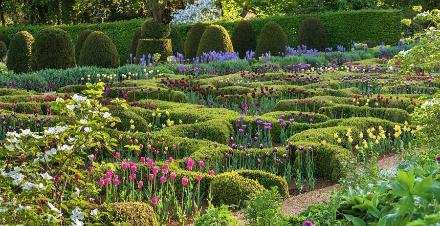 O parterre criado por ele em Broughton Grange com formas orgânicas é deslumbrante, em contraste com os parterres tradicionais em jardins formais. Quando os canteiros delimitados pelas cercas-vivas baixas se enchem de tulipas, o resultado é realmente sensacional. Na realidade, são como vários jardins em um, com diferentes espécies usadas dependendo da estação. E mesmo no inverno, com os canteiros nus, as formas orgânicas cobertas de neve sobressaem espetacularmente.