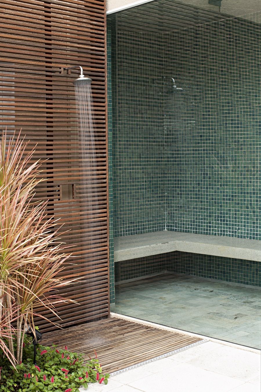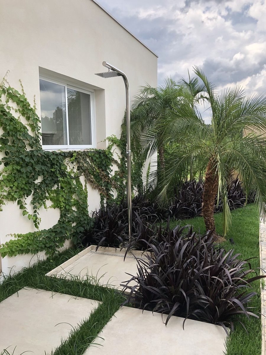 Usando essa tal criatividade e muita vontade de criar ambientes diferentes, já inventei ducha que sai do meio das plantas, chuveiro que é destaque no jardim e tem o paisagismo apenas como moldura ou pelo contrário, fica bem discreto no meio de um ripadinho de madeira, enfim, para mim o importante é não ser óbvio e ter um charme a mais.