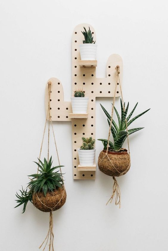 Prateleira divertida em formato de cacto com plantas apoiadas e penduradas – fonte via Pinterest