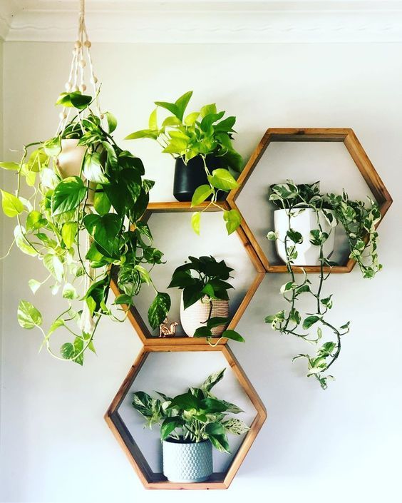 Nichos de madeira em formato colmeia com plantas apoiadas – fonte via Pinterest