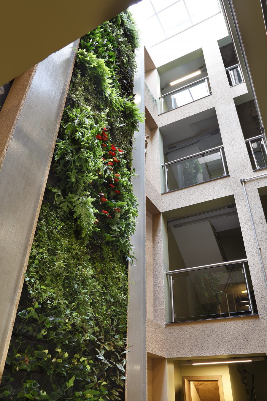 Jardim vertical de 15 m de altura que fiz para a sede de uma empresa em SP – Biofilia em ambientes comerciais.