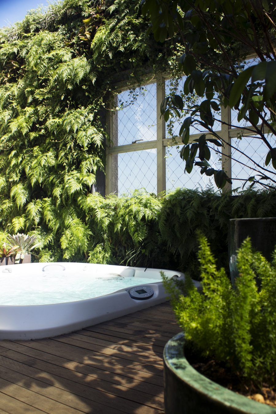 Rooftop em São Paulo onde utilizei parede verde para criar um ambiente aconchegante para o spa, o chuveirão sai do meio das plantas
