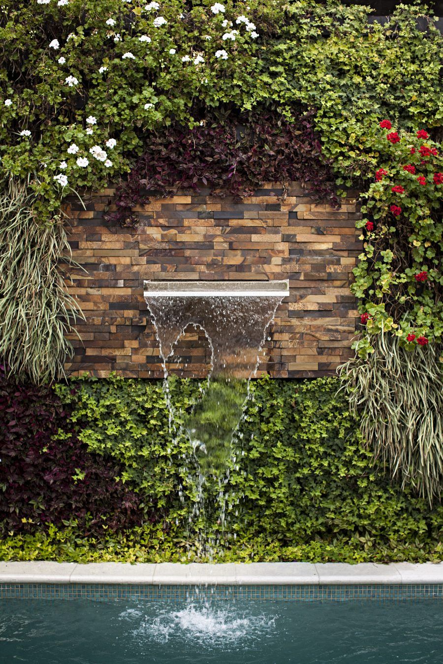 Nesse jardim vertical coladinho com a piscina aproveitei para criar uma cascata e abusei das cores na escolha das espécies.