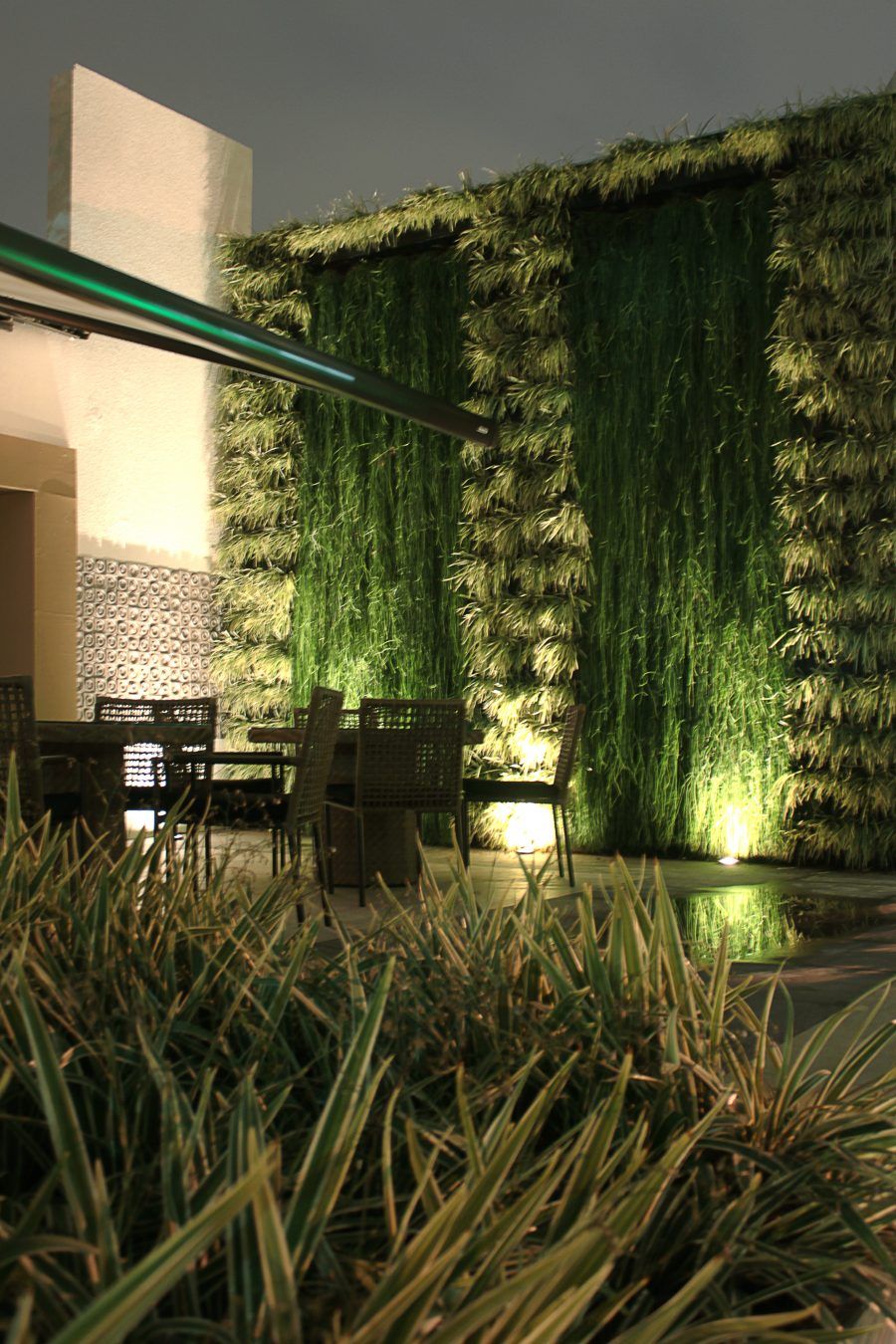 Uma parede verde onde usei apenas 2 espécies criando uma textura interessante ainda mais valorizada pela iluminação – projeto em parceria com a Wall Plant para um restaurante com uso noturno importante