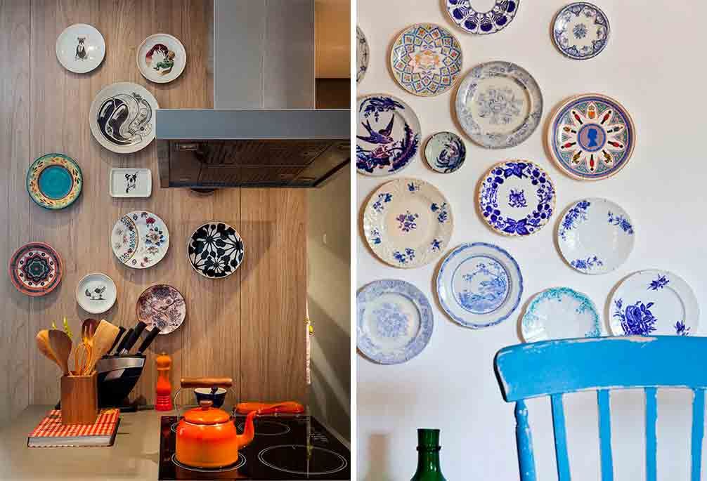 estou terminando uma reforma em casa e os pratos que trouxe das viagens vão p parede junto aos quadros pintados a guache ;