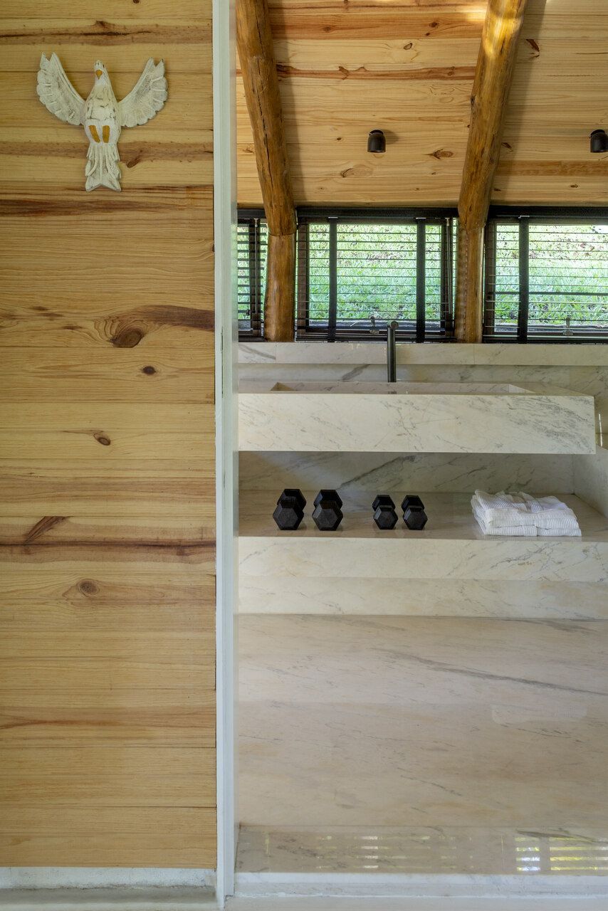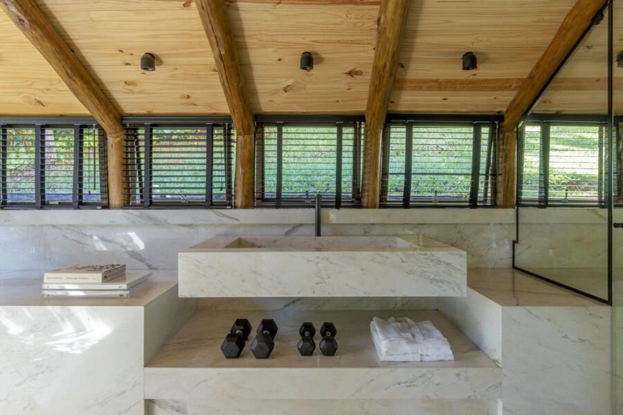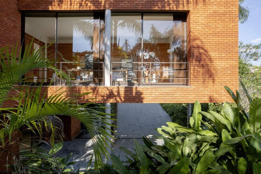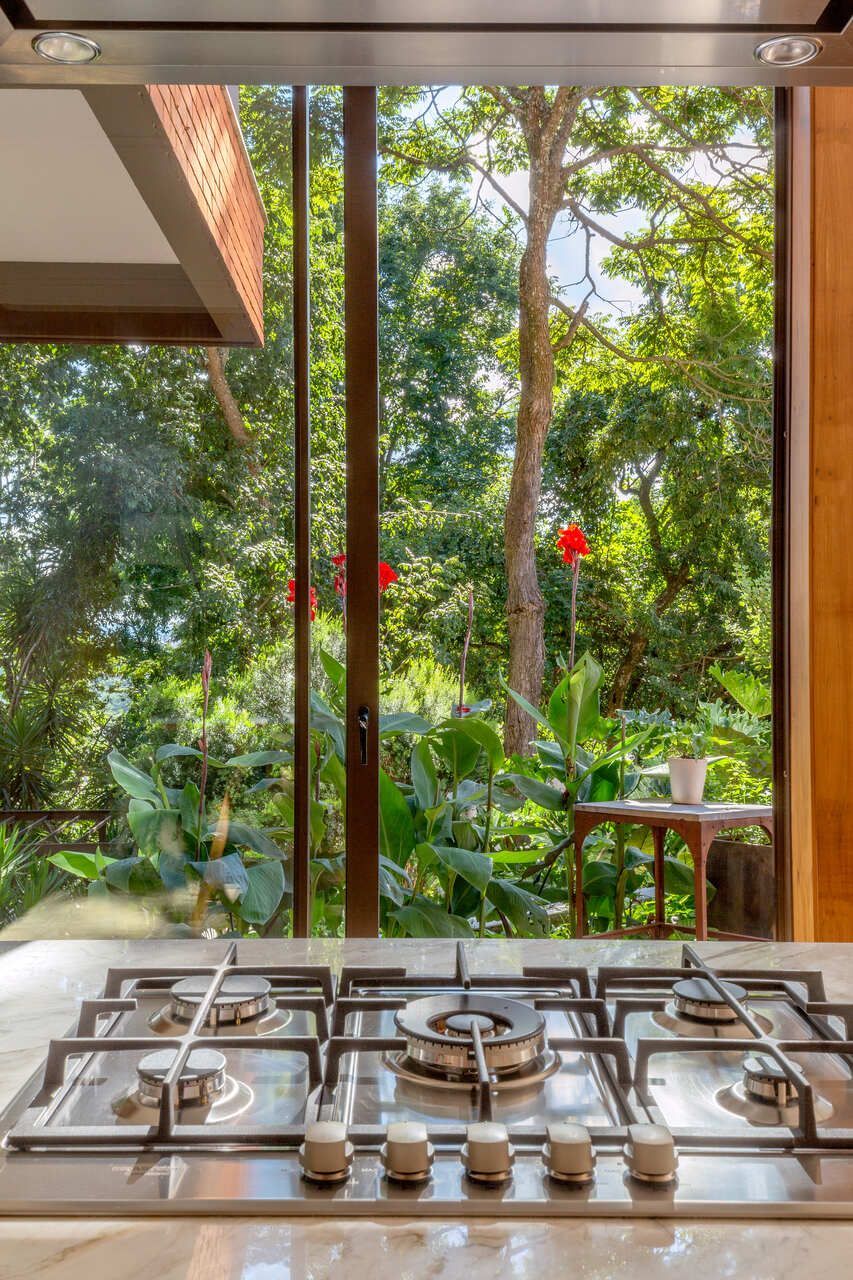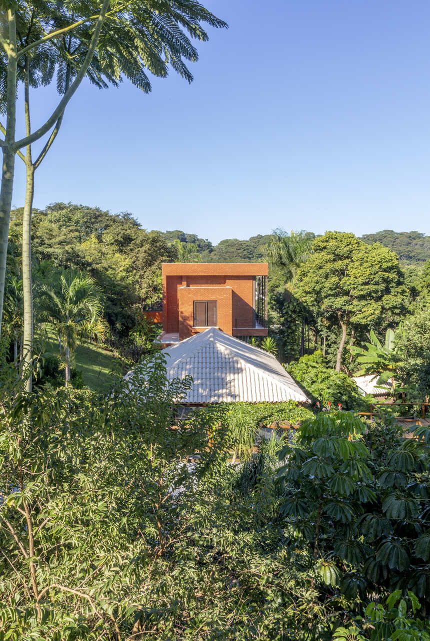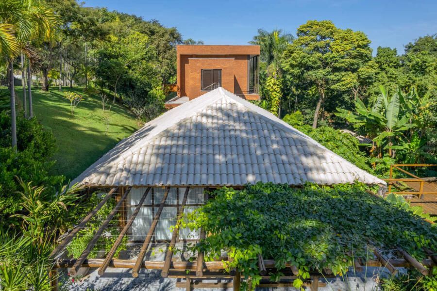 Com 323m² distribuídos em dois pavimentos, a casa se abre completamente para a paisagem. No andar superior estão a sala, uma suíte e o escritório; no inferior, a garagem, a cozinha e a sala de estar, que se integram de forma fluida ao jardim, um espaço vivo, repleto de árvores frutíferas e animais que circulam livremente. É ali que o arquiteto passa os finais de tarde, observando o crescimento das plantas e o ritmo tranquilo da natureza.