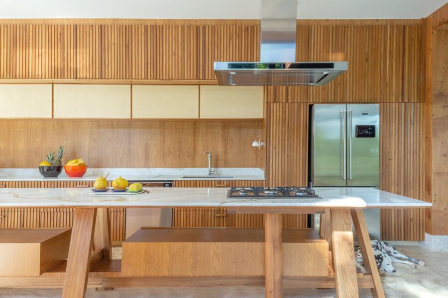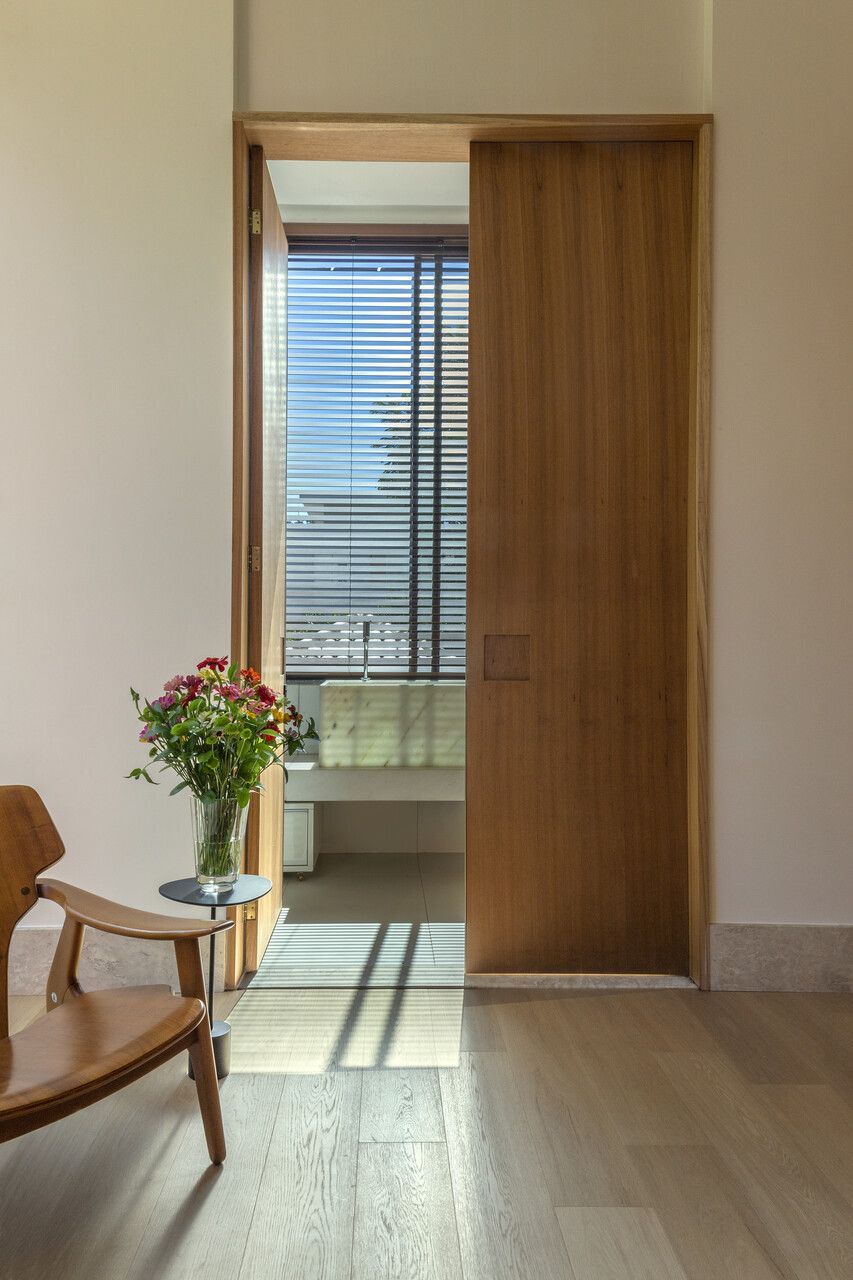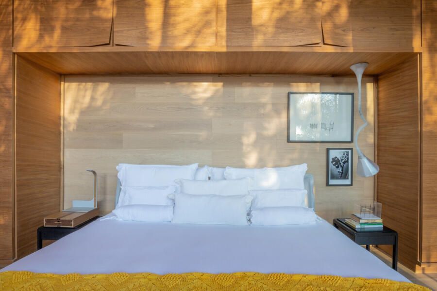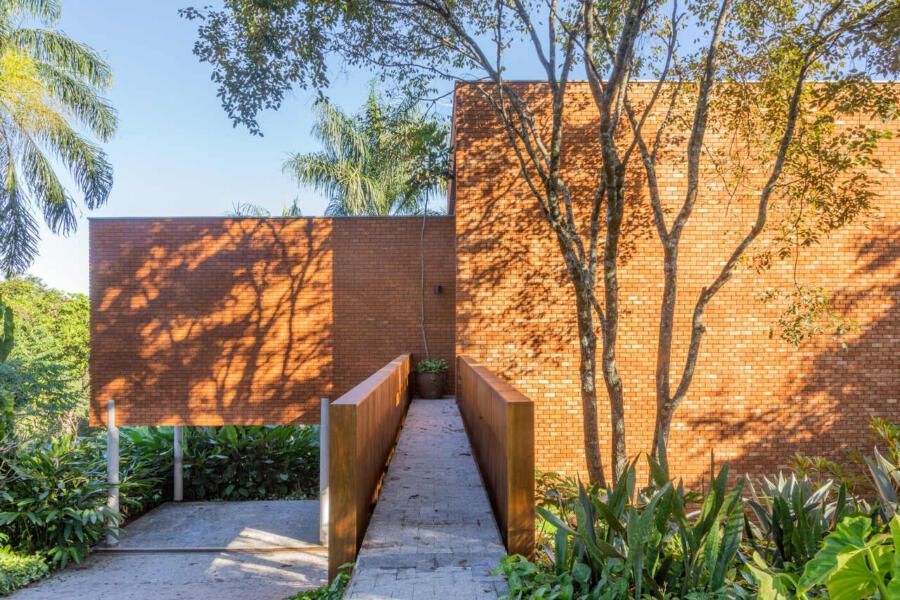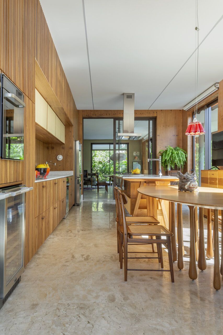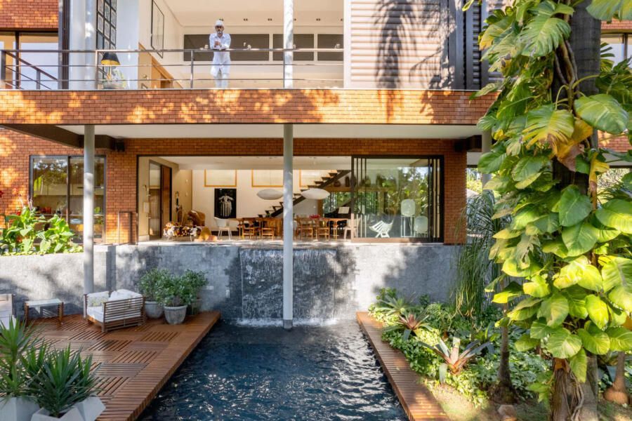 A Casa da Ponte é quase como um retrato íntimo e profissional de Leo: um espaço prático, sem muitas regras, que celebra a liberdade criativa, o conforto, a arte e o tempo. A fachada principal, sem aberturas, preserva a privacidade e cria uma surpresa para quem entra: lá dentro, a casa se revela por inteiro, banhada de luz natural e marcada por uma atmosfera acolhedora.