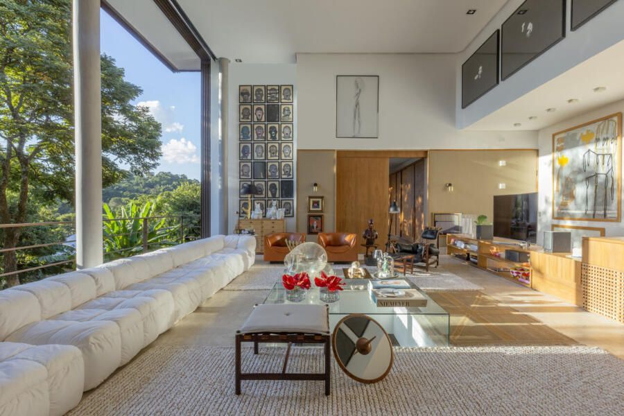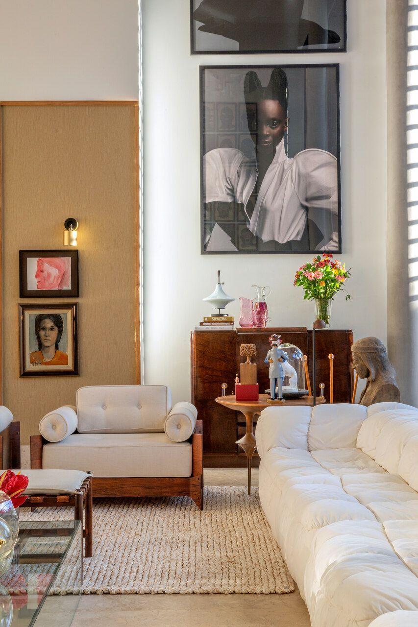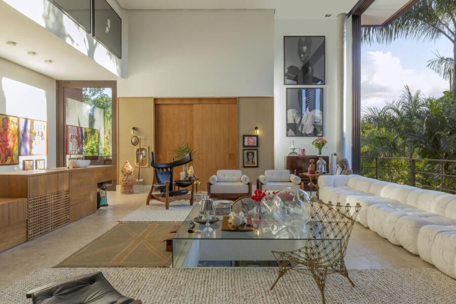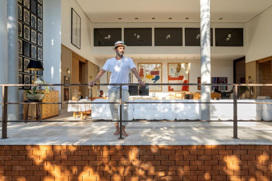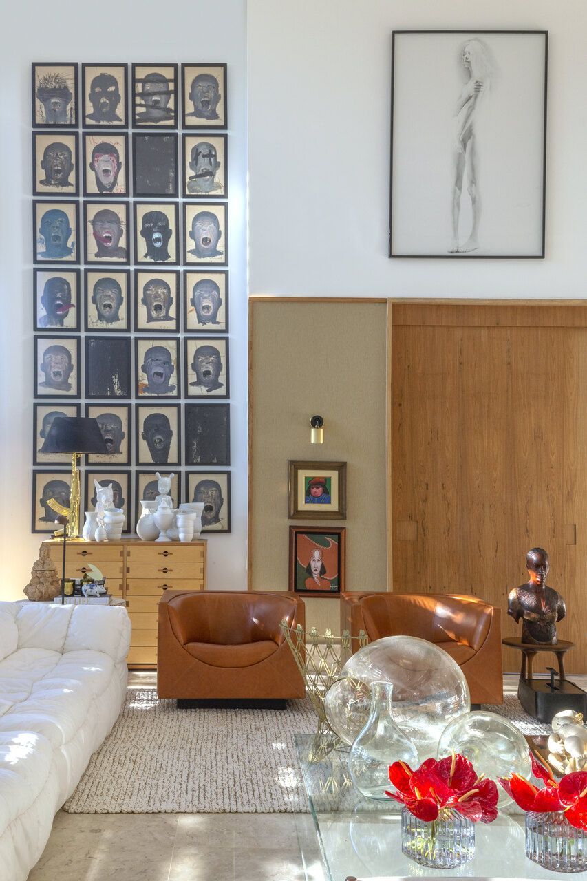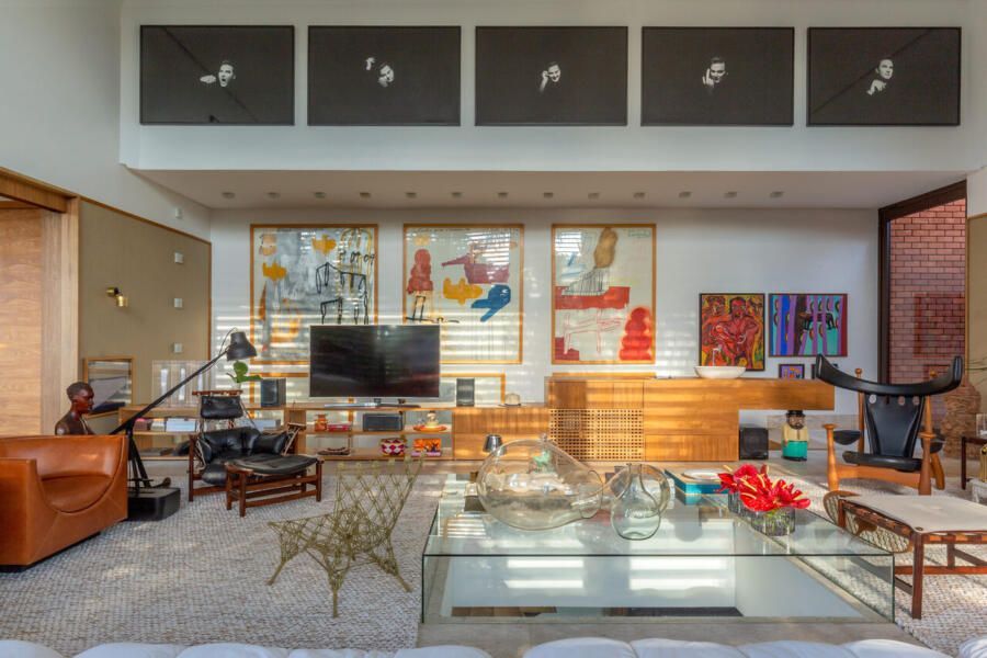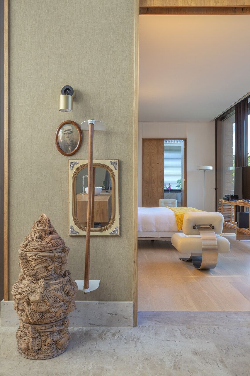 O interior é uma extensão do olhar curatorial do arquiteto. O mobiliário brasileiro divide espaço com obras de artistas de diferentes partes do mundo, compondo um ambiente que reflete sua sensibilidade estética e seu amor por tudo que é autêntico e cheio de história.