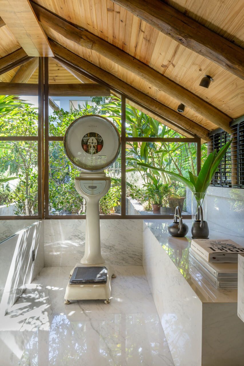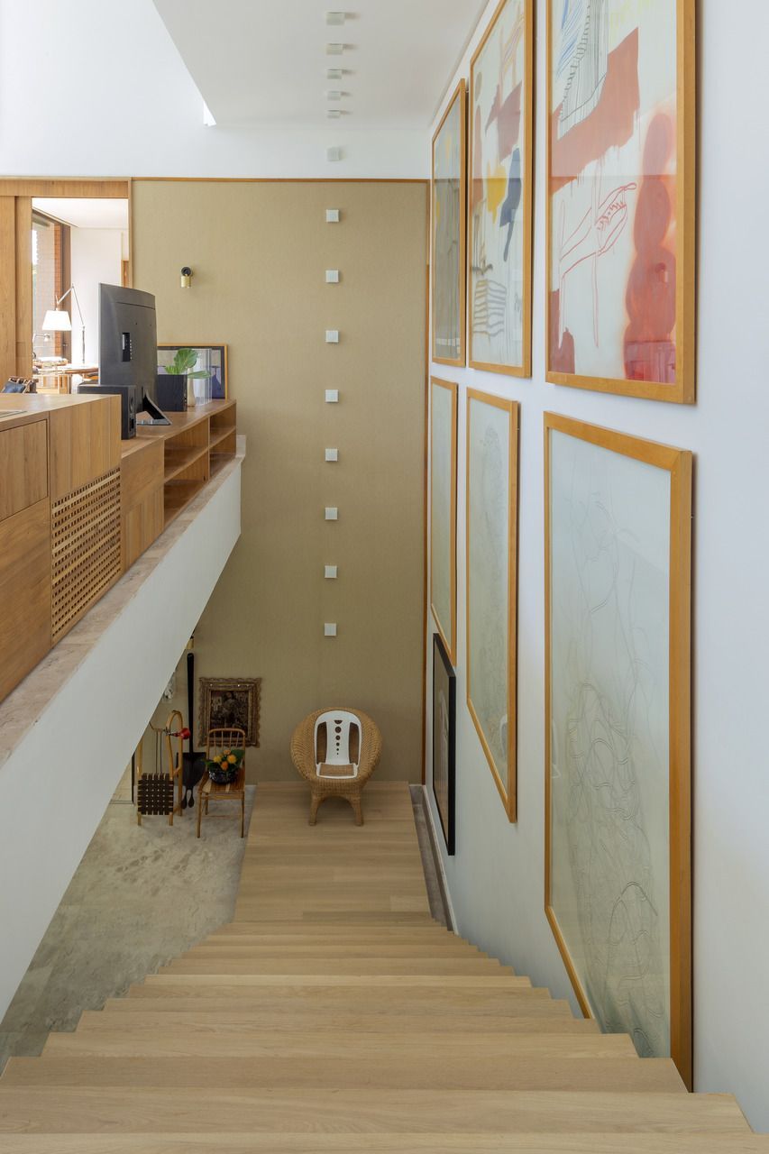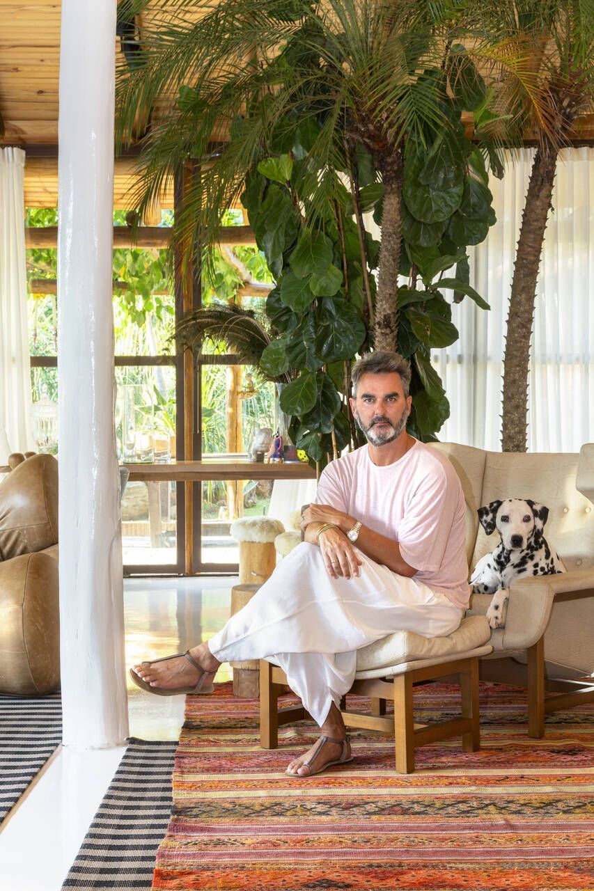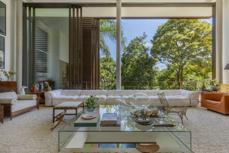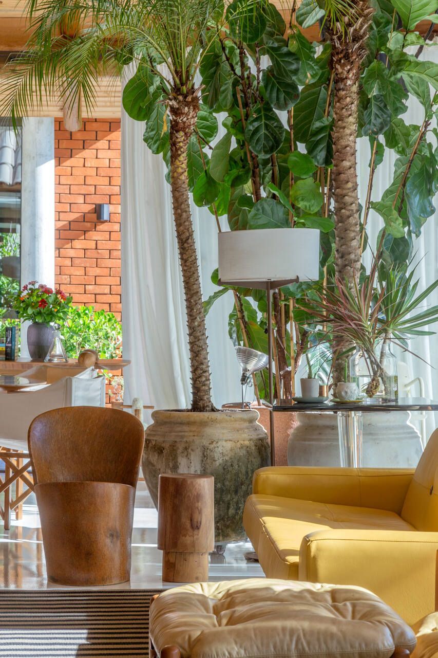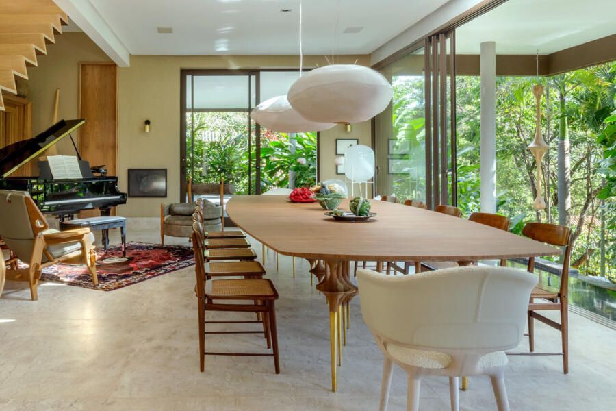O interior é uma extensão do olhar curatorial do arquiteto. O mobiliário brasileiro divide espaço com obras de artistas de diferentes partes do mundo, compondo um ambiente que reflete sua sensibilidade estética e seu amor por tudo que é autêntico e cheio de história.
