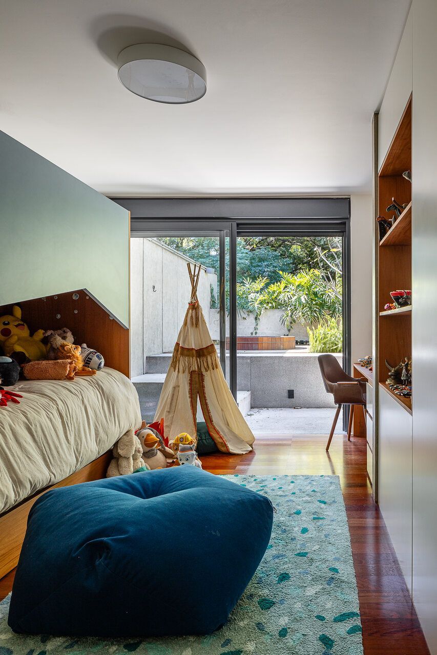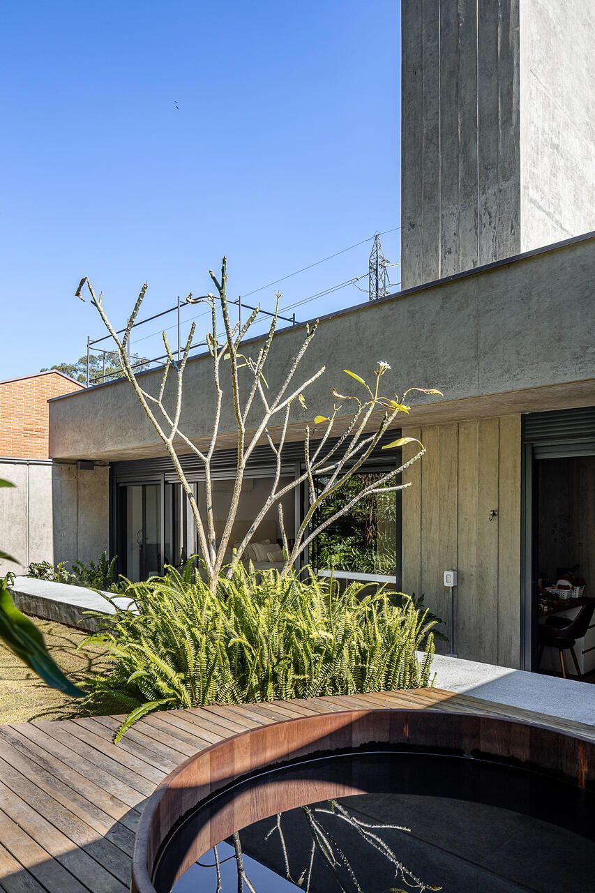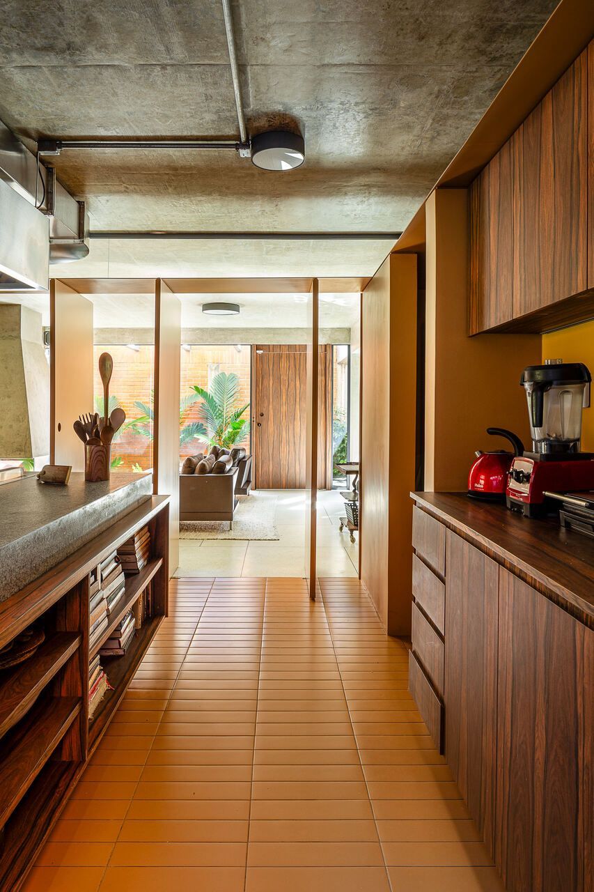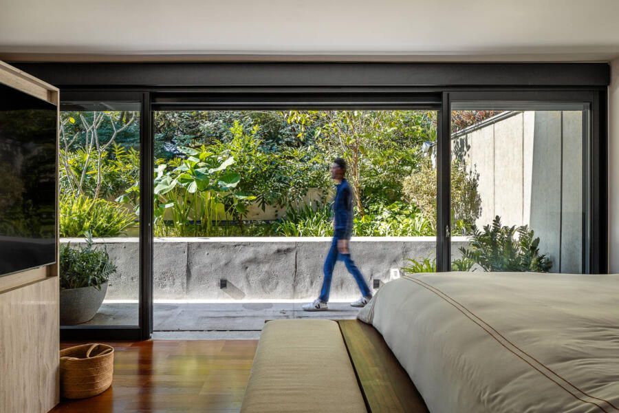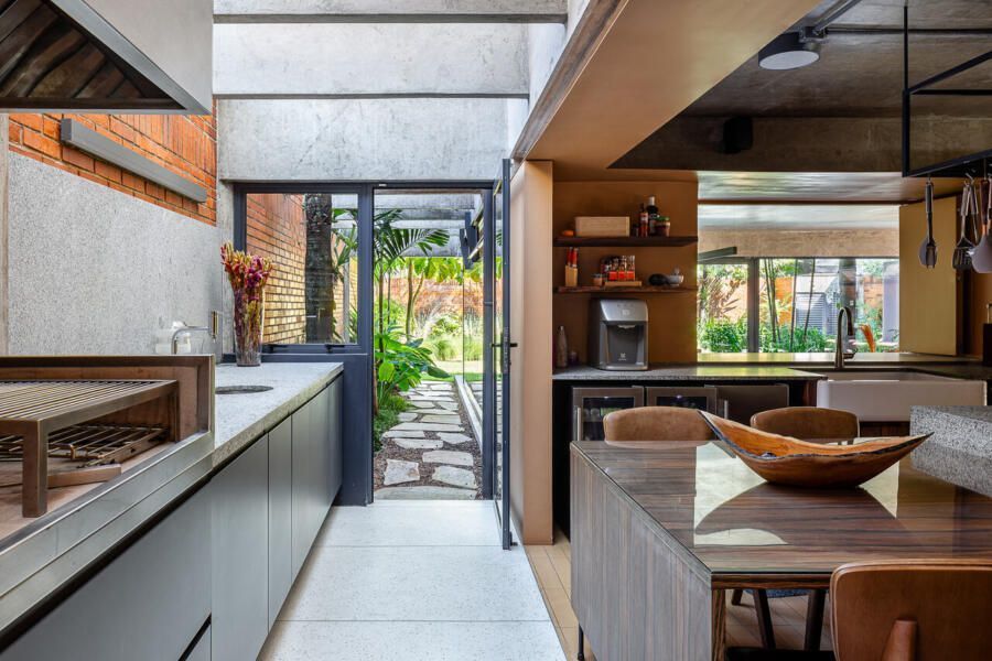 Entre os principais pedidos dos moradores estavam a criação de uma nova suíte e de uma sala de TV no piso superior, além de uma cozinha equipada, uma parrilla, um escritório e áreas de convivência generosas. O resultado é uma casa fluida, onde o térreo se abre para o jardim e as salas de estar, jantar e lareira convivem em harmonia com a cozinha, o verdadeiro coração do projeto. No andar superior, o jardim e o solário trazem uma atmosfera de refúgio urbano, sem romper com o espírito modernista original.