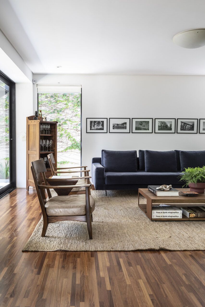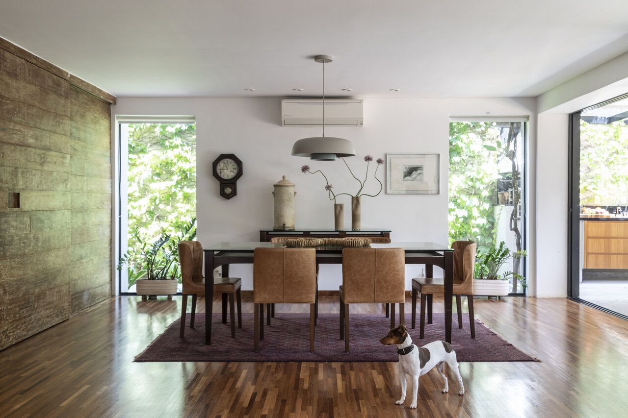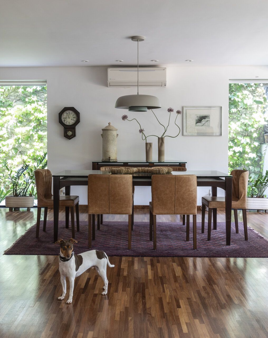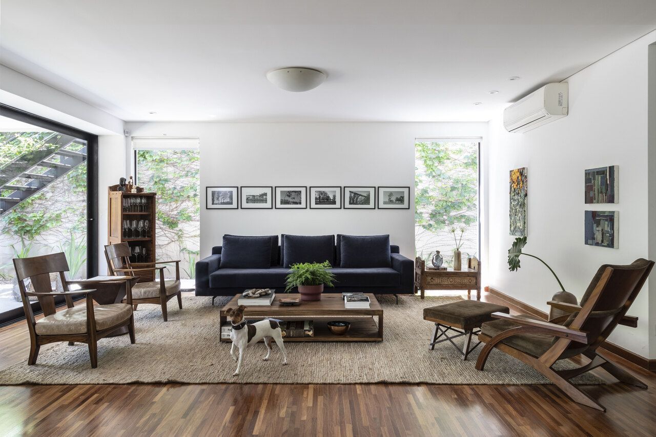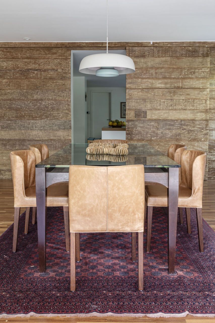 O projeto de interiores é um mix de estilos e épocas que reflete a personalidade e o gosto da moradora, sem a preocupação de seguir um padrão estético bem definido. No geral, as paredes são lisas, pintadas de branco, e o piso em madeira, por ser um material nobre, atemporal e trazer aconchego aos espaços.