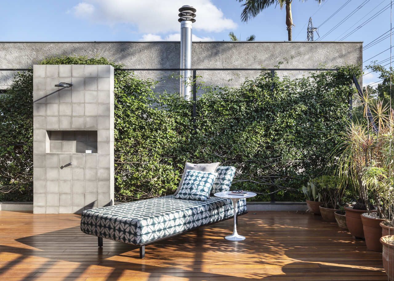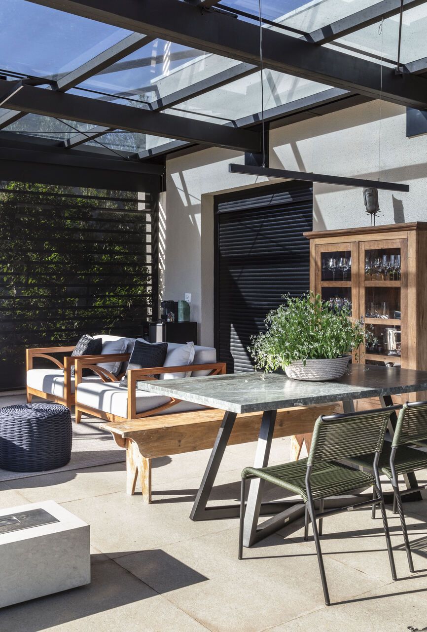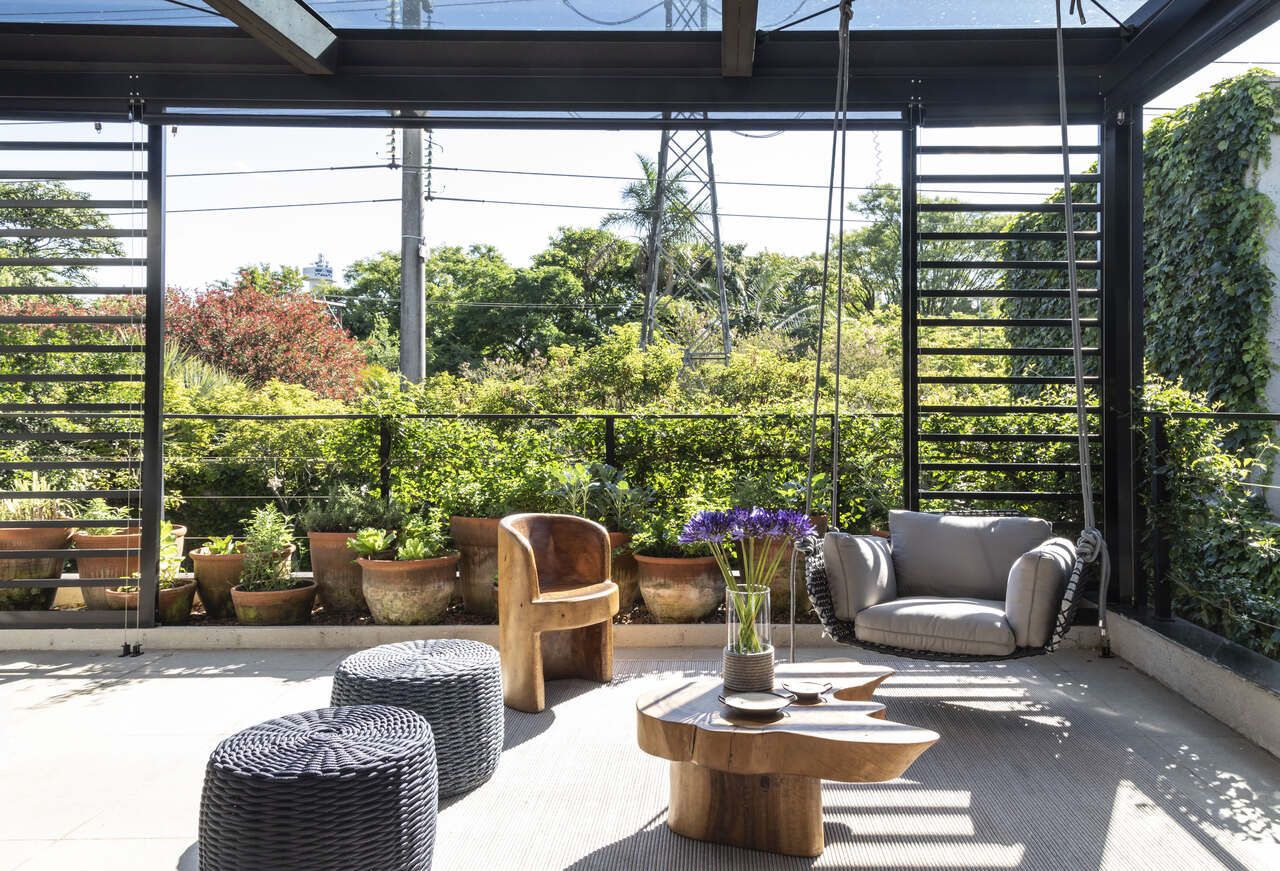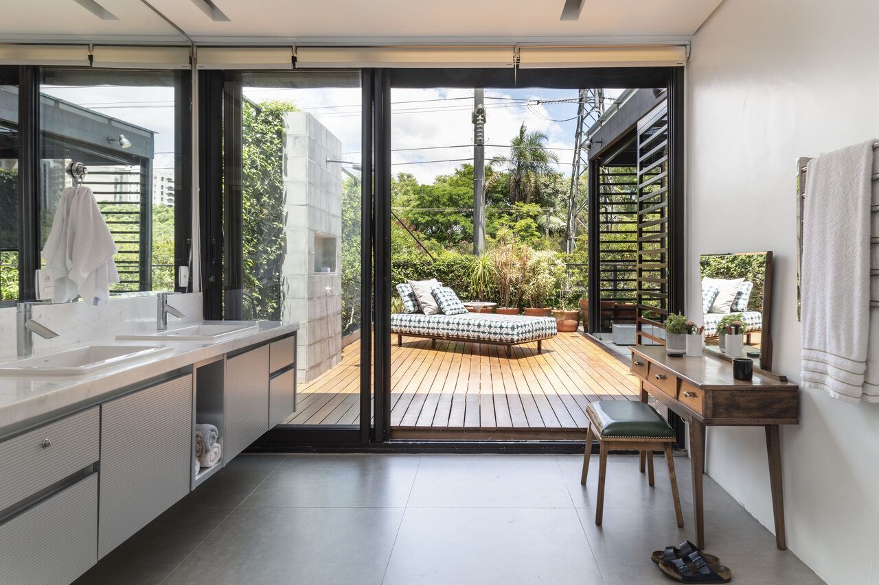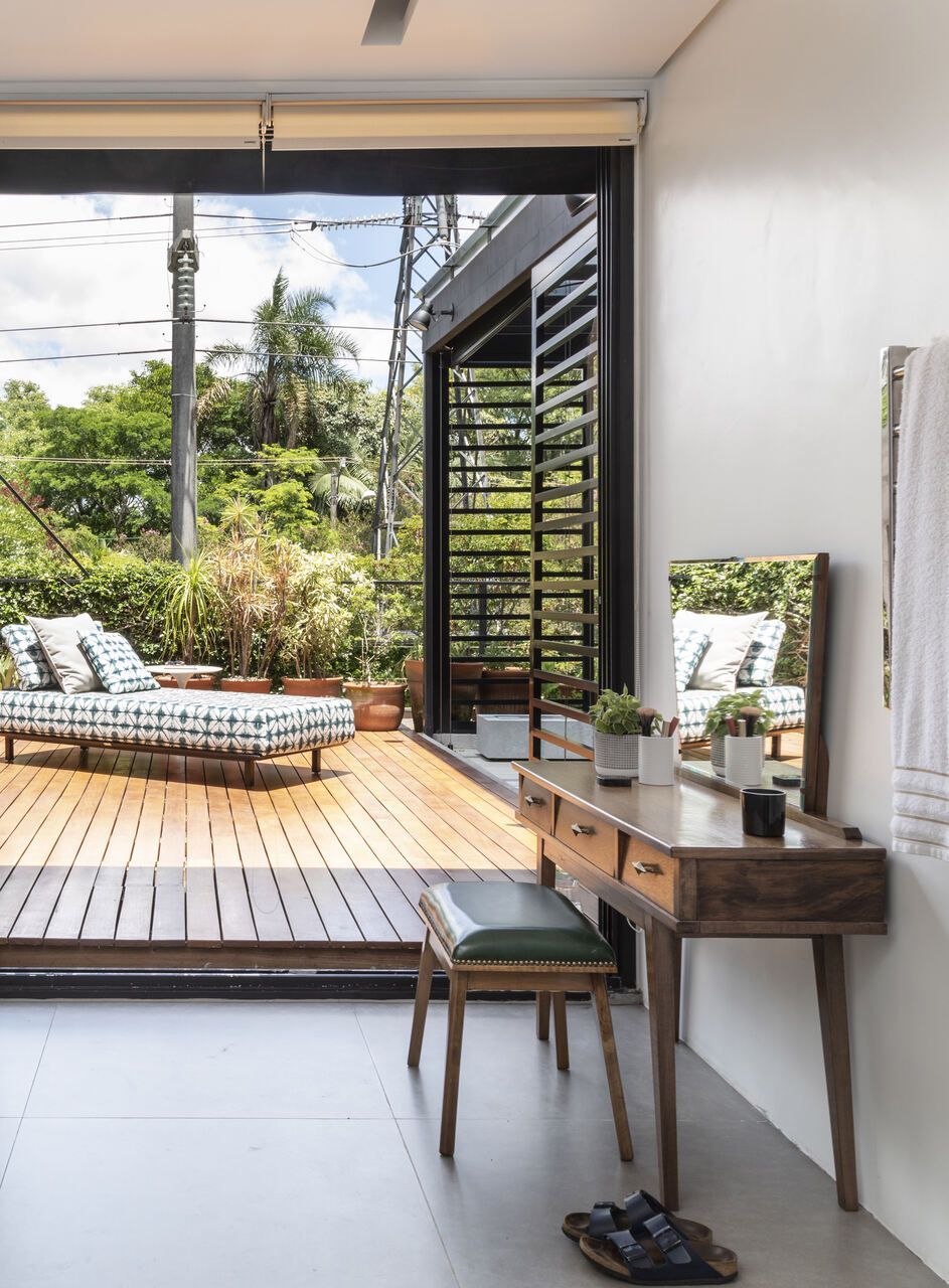 Com a reforma, a planta da casa sofreu algumas alterações. A suíte da moradora, por exemplo, dava para um terraço enorme subutilizado, que foi ocupado, de um lado, por uma estrutura metálica preta com teto de vidro transparente com ambiente de estar, balanço, mesa para refeições e lareira, e, do outro lado, por um deck de madeira com chaise longue e chuveirão, conectado ao banheiro.