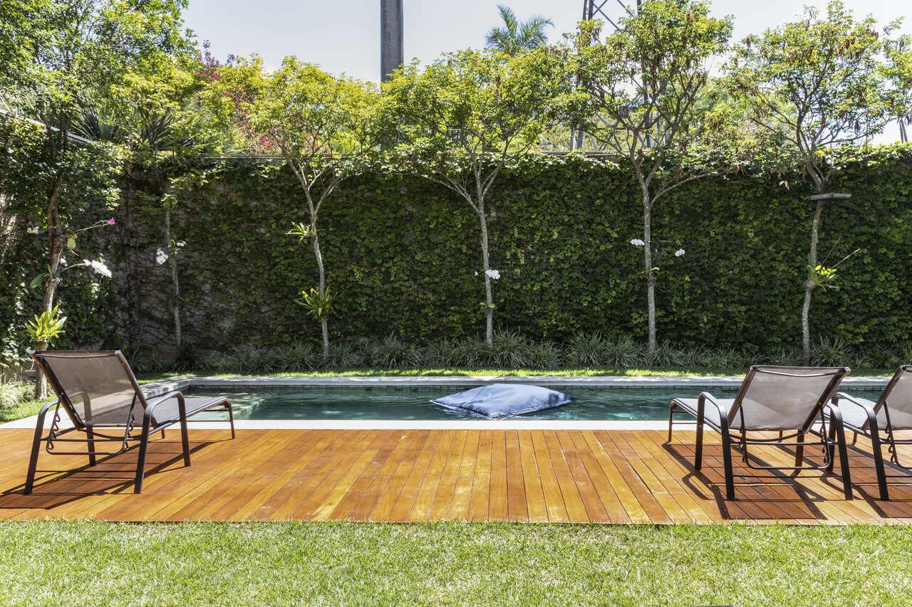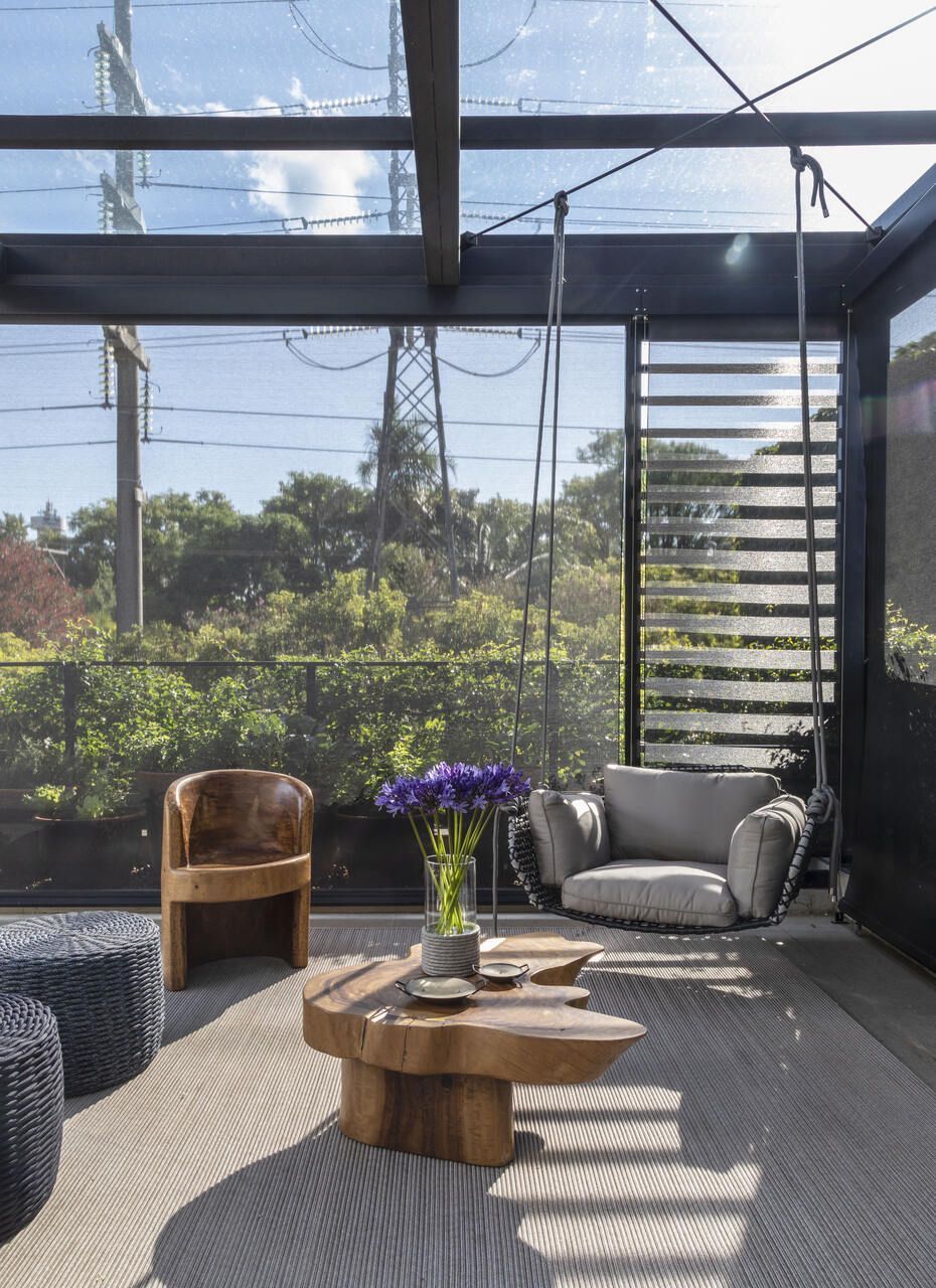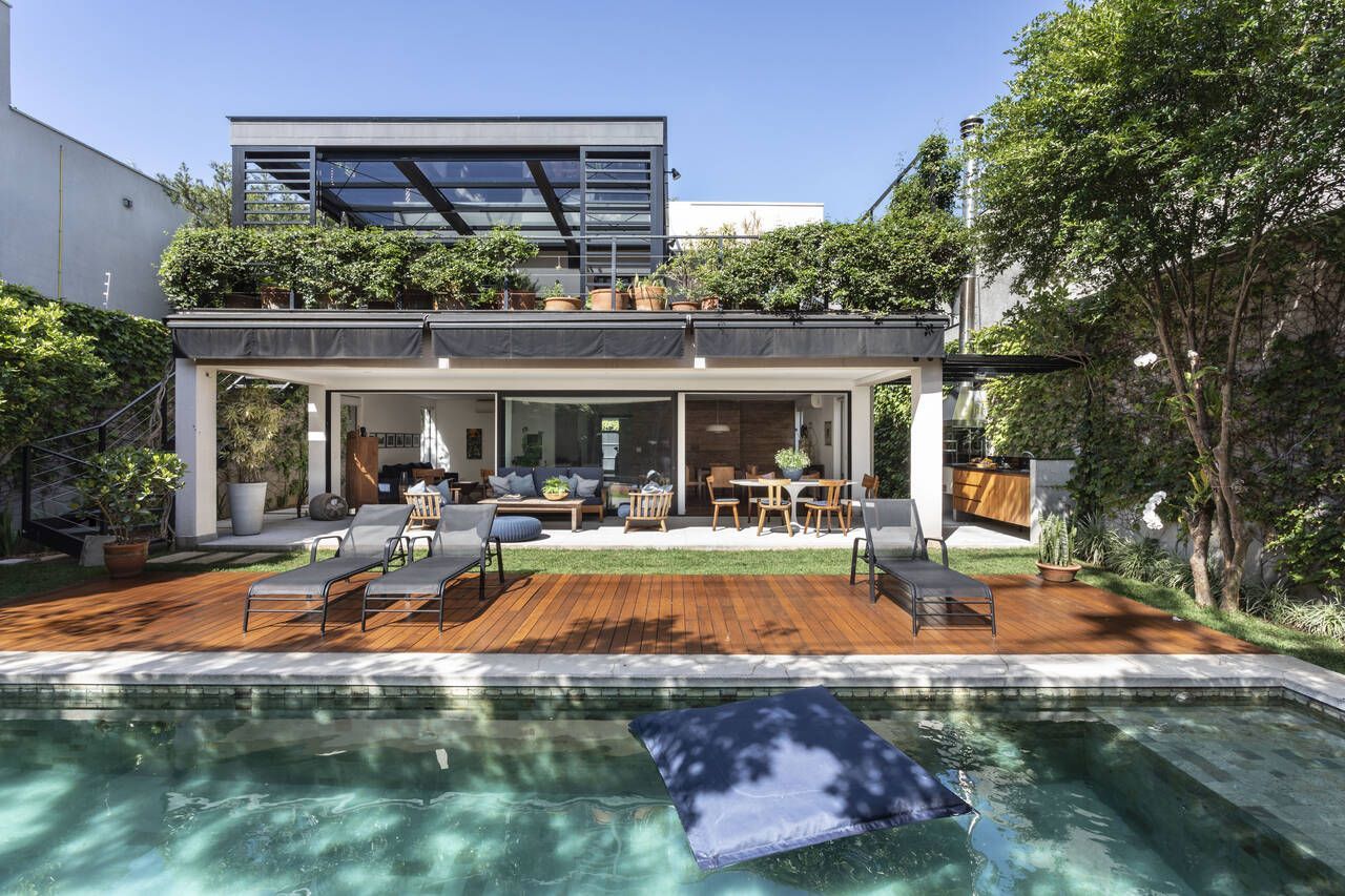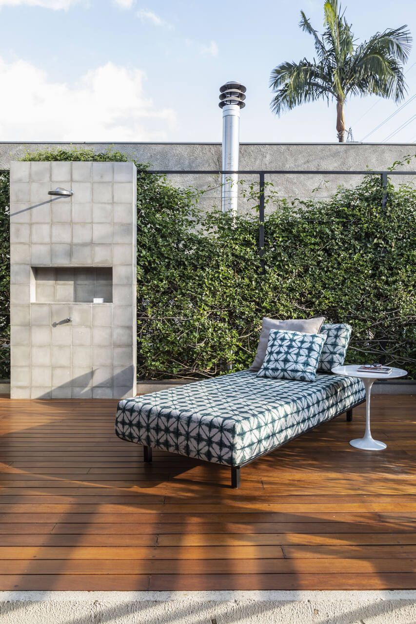 Com a reforma, a planta da casa sofreu algumas alterações. A suíte da moradora, por exemplo, dava para um terraço enorme subutilizado, que foi ocupado, de um lado, por uma estrutura metálica preta com teto de vidro transparente com ambiente de estar, balanço, mesa para refeições e lareira, e, do outro lado, por um deck de madeira com chaise longue e chuveirão, conectado ao banheiro.