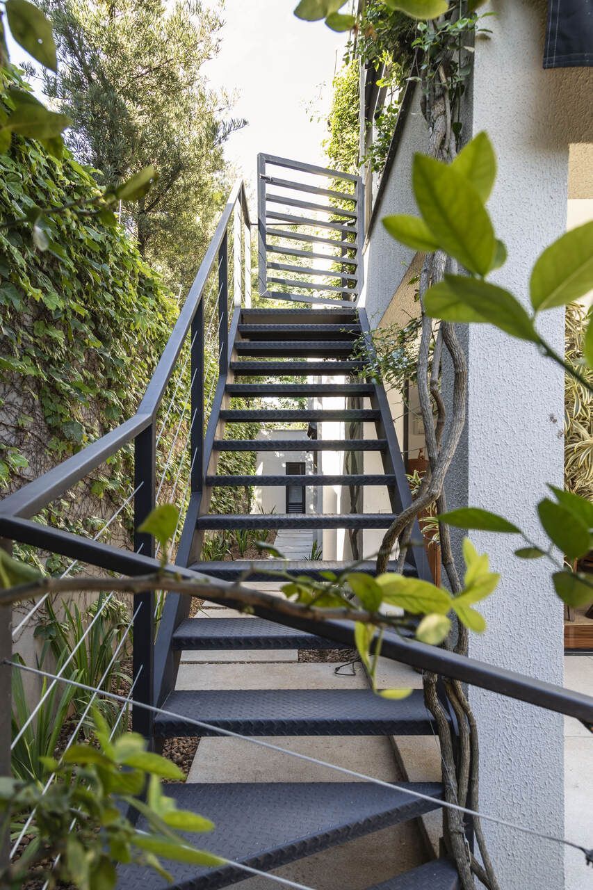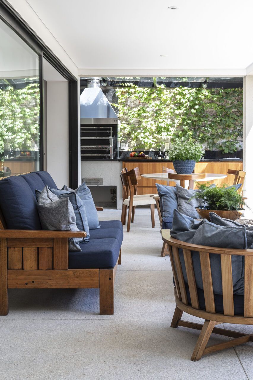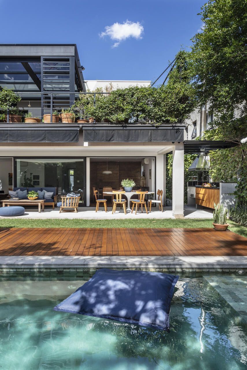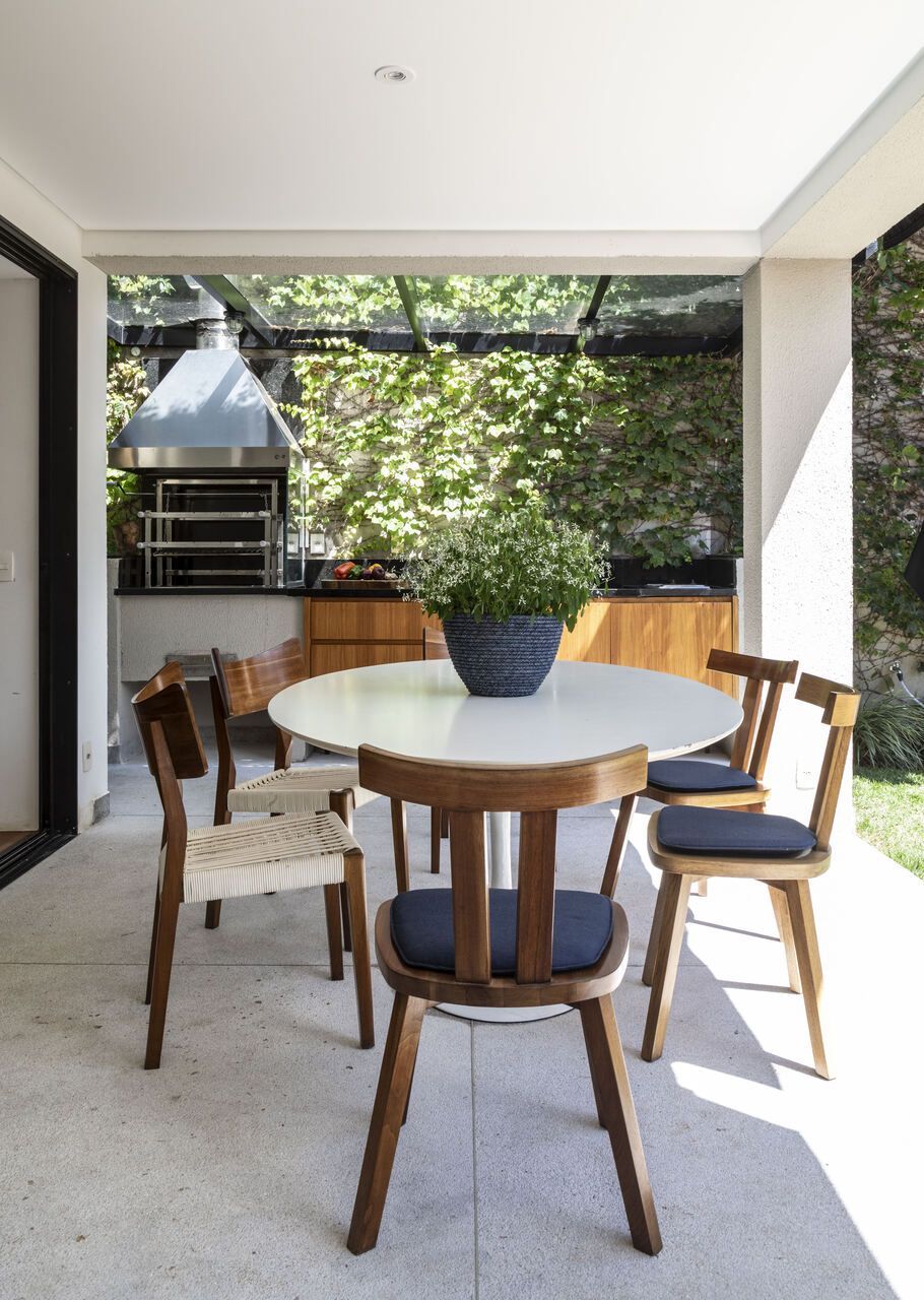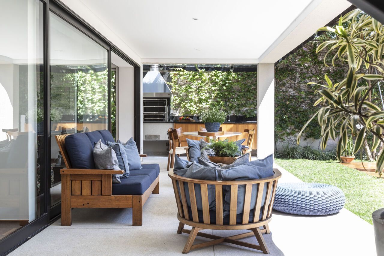 Com a reforma, a planta da casa sofreu algumas alterações. A suíte da moradora, por exemplo, dava para um terraço enorme subutilizado, que foi ocupado, de um lado, por uma estrutura metálica preta com teto de vidro transparente com ambiente de estar, balanço, mesa para refeições e lareira, e, do outro lado, por um deck de madeira com chaise longue e chuveirão, conectado ao banheiro.