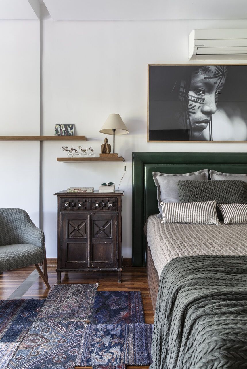 Nas salas de estar e jantar, entre as peças de acervo que foram reaproveitadas, Carolina destaca a cristaleira pequena, o par de poltronas, a poltrona com banqueta, a mesa de jantar e, sob ela, o tapete persa. Na suíte da moradora, a cômoda preta e as mesinhas também já existiam e foram mantidas.