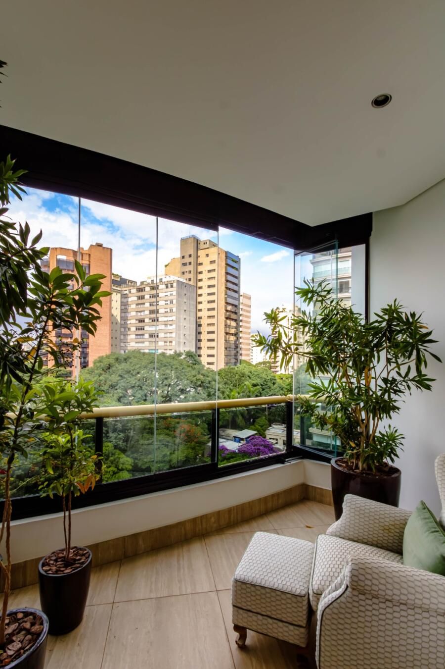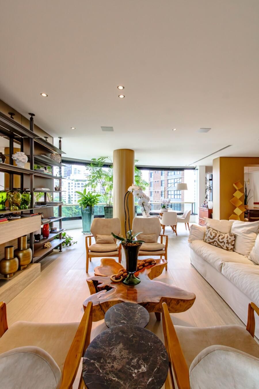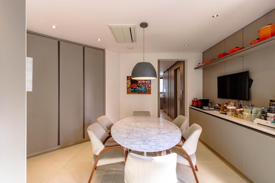 A integração com o terraço é um dos pontos altos do projeto. As antigas varandas foram incorporadas por meio de fechamento em vidro, criando uma área contínua que circula todo o apartamento. As esquadrias leves permitem abrir ou fechar os ambientes conforme o uso, e isso faz toda a diferença no dia a dia. A sensação é de liberdade: você pode receber com tudo aberto ou criar espaços mais reservados com poucos movimentos.