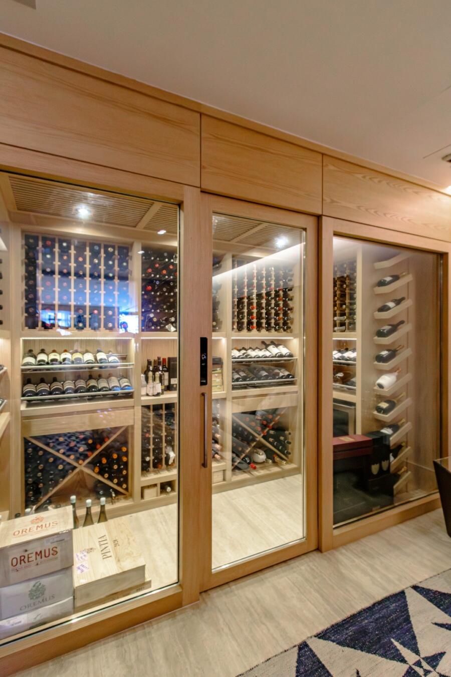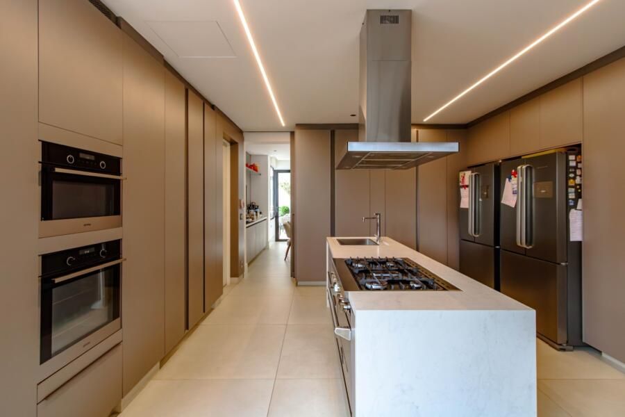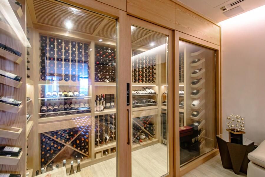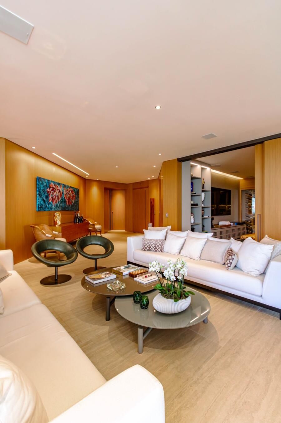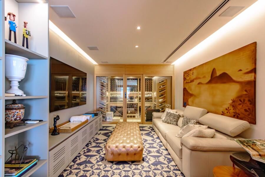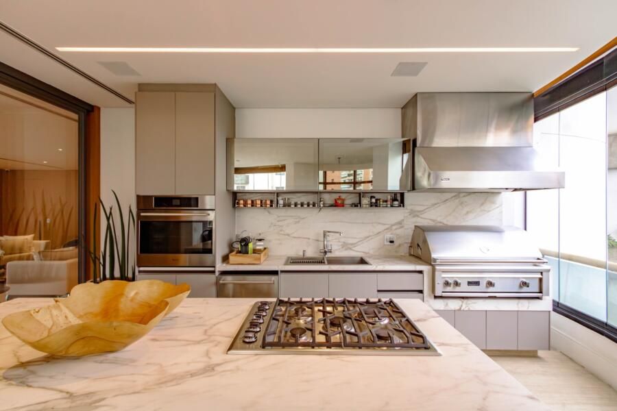 O espaço gourmet, aliás, merece destaque. Equipado com churrasqueira e forno a gás da Viking, ele foi pensado para quem realmente cozinha, com gavetas refrigeradas e infraestrutura cuidadosamente planejada. Ao lado, a adega climatizada se conecta ao home theater, podendo ficar integrada ou isolada conforme o momento, o que reforça essa flexibilidade do projeto.