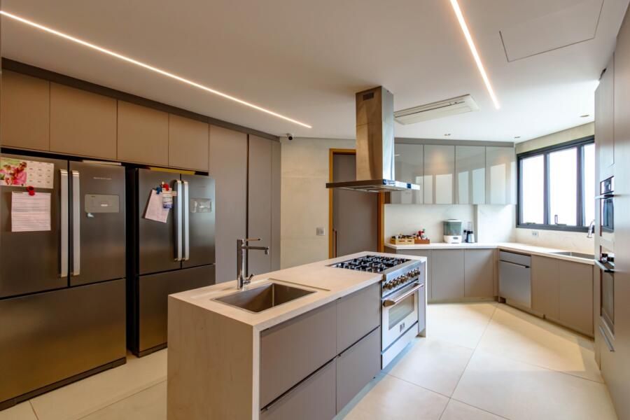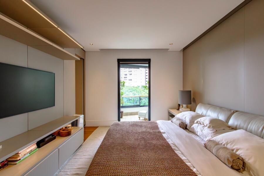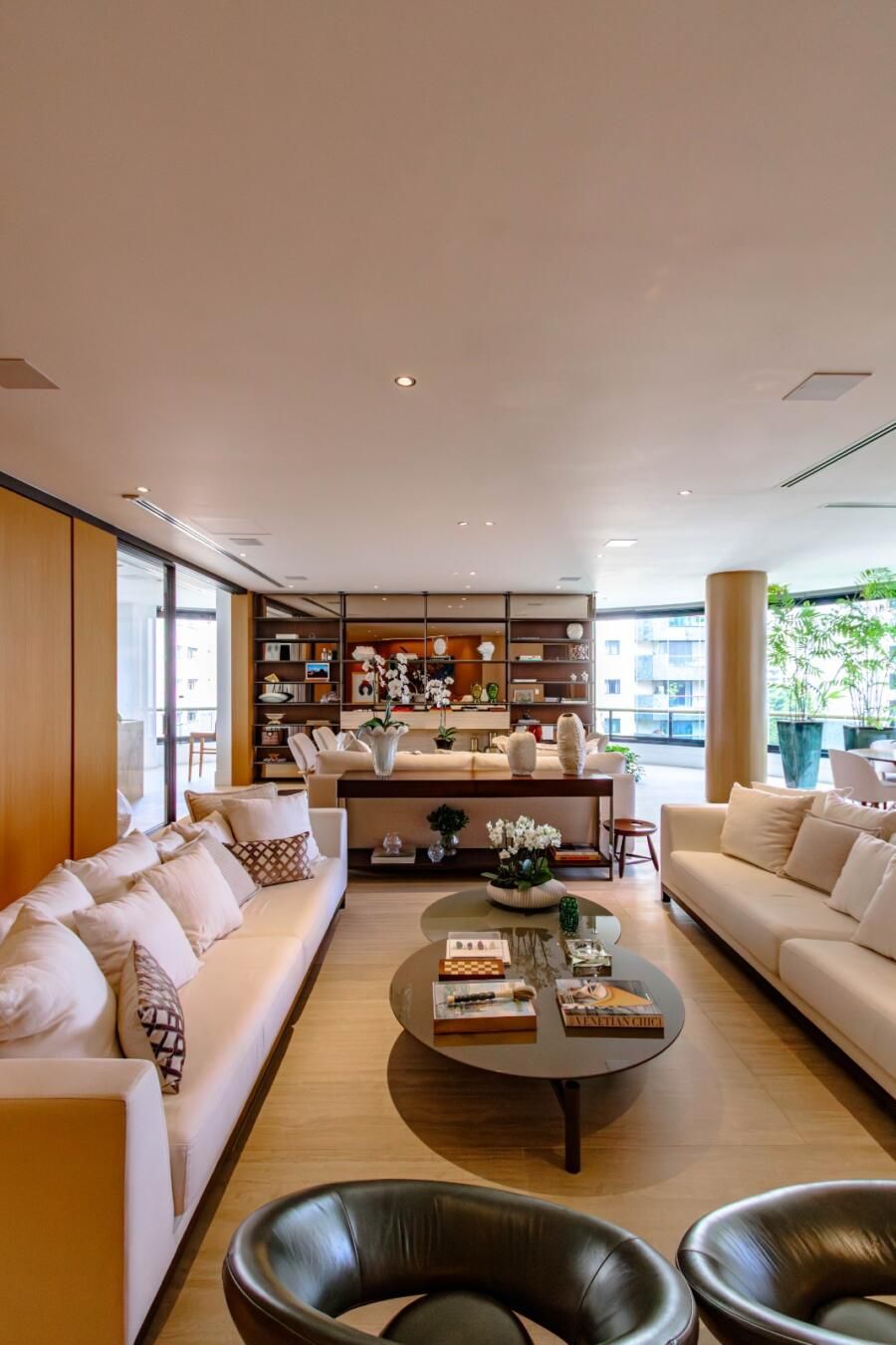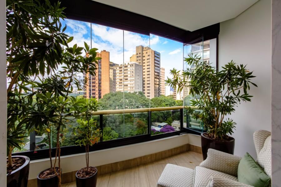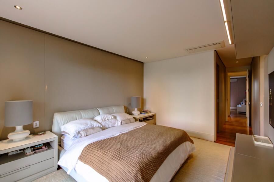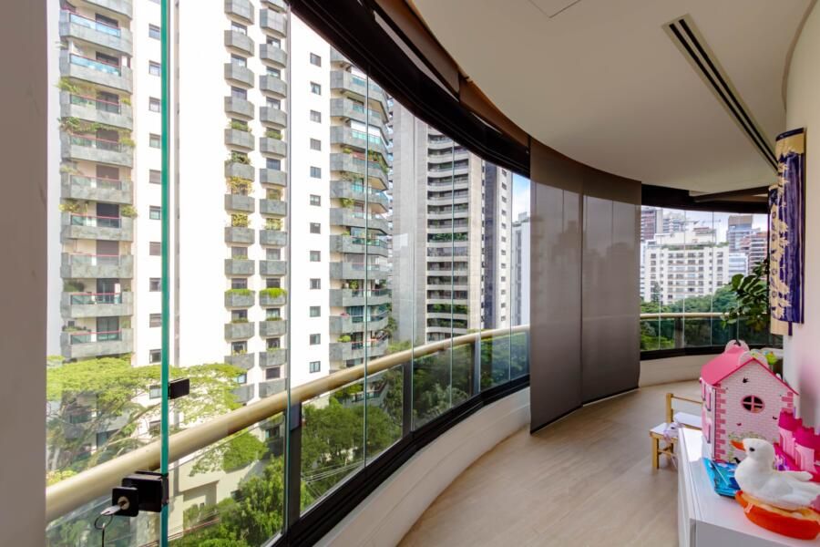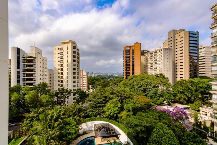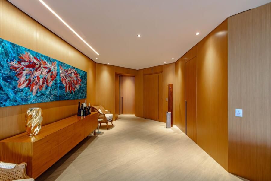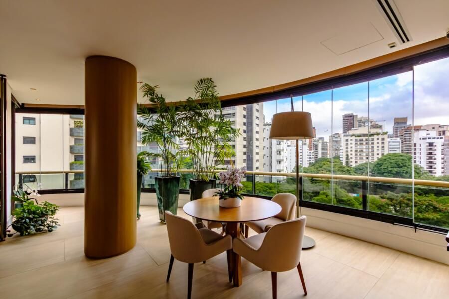 Localizado em um dos edifícios mais exclusivos da Vila Nova Conceição, com apenas 12 unidades e implantado em um dos maiores terrenos do bairro — e reconhecido por ter as maiores metragens da região, sem similares — o apartamento já impressiona antes mesmo de abrir a porta. O térreo generoso, a sensação de espaço e o entorno arborizado criam uma atmosfera pouco comum em São Paulo. E, lá em cima, a percepção se mantém: a planta ampla, quase como uma casa linear, é envolvida por terraços que percorrem todo o imóvel, trazendo luz, respiro e uma relação constante com o exterior.