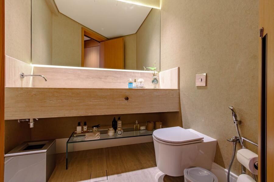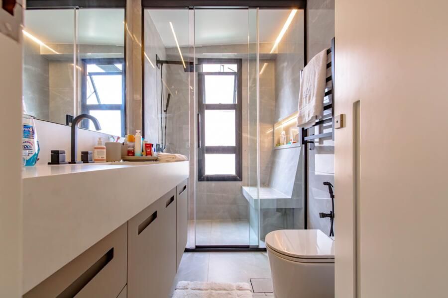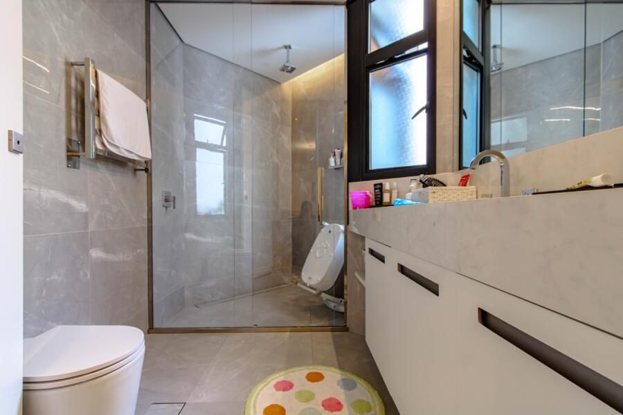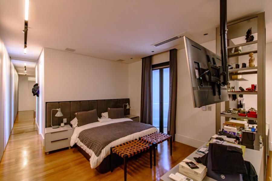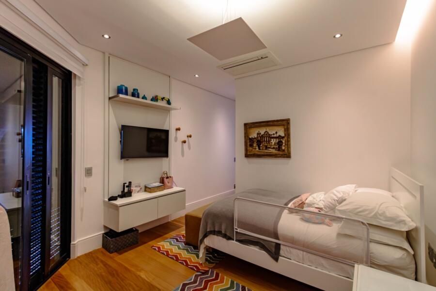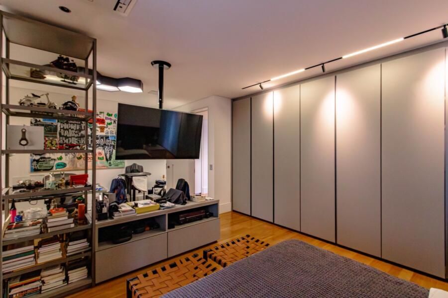 A área íntima segue a mesma lógica de conforto e funcionalidade. A circulação é bem resolvida, com possibilidades de fechamento que garantem privacidade quando necessário. A suíte master se destaca pelos dois closets independentes e pelo banheiro amplo, com bancada generosa, chuveiro duplo e soluções que priorizam o uso cotidiano. Já o quarto do filho incorpora uma ideia interessante: a divisão entre área de descanso e estudos por meio de uma TV giratória, além de um banheiro com sauna integrada.