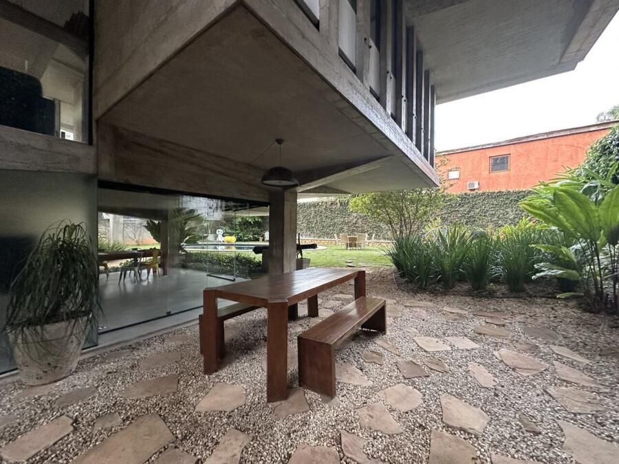 A residência conta com uma configuração ampla e bem distribuída. São duas suítes, um quarto de serviço com banheiro, além de cozinha, lavanderia, sala de jantar, escritório, hall, lavabo e uma sala de estar de grandes proporções, que se conecta a um salão voltado para a piscina. Cada um desses espaços revela características típicas da Escola Paulista de Arquitetura, como a valorização da estrutura aparente e o uso de materiais brutos.