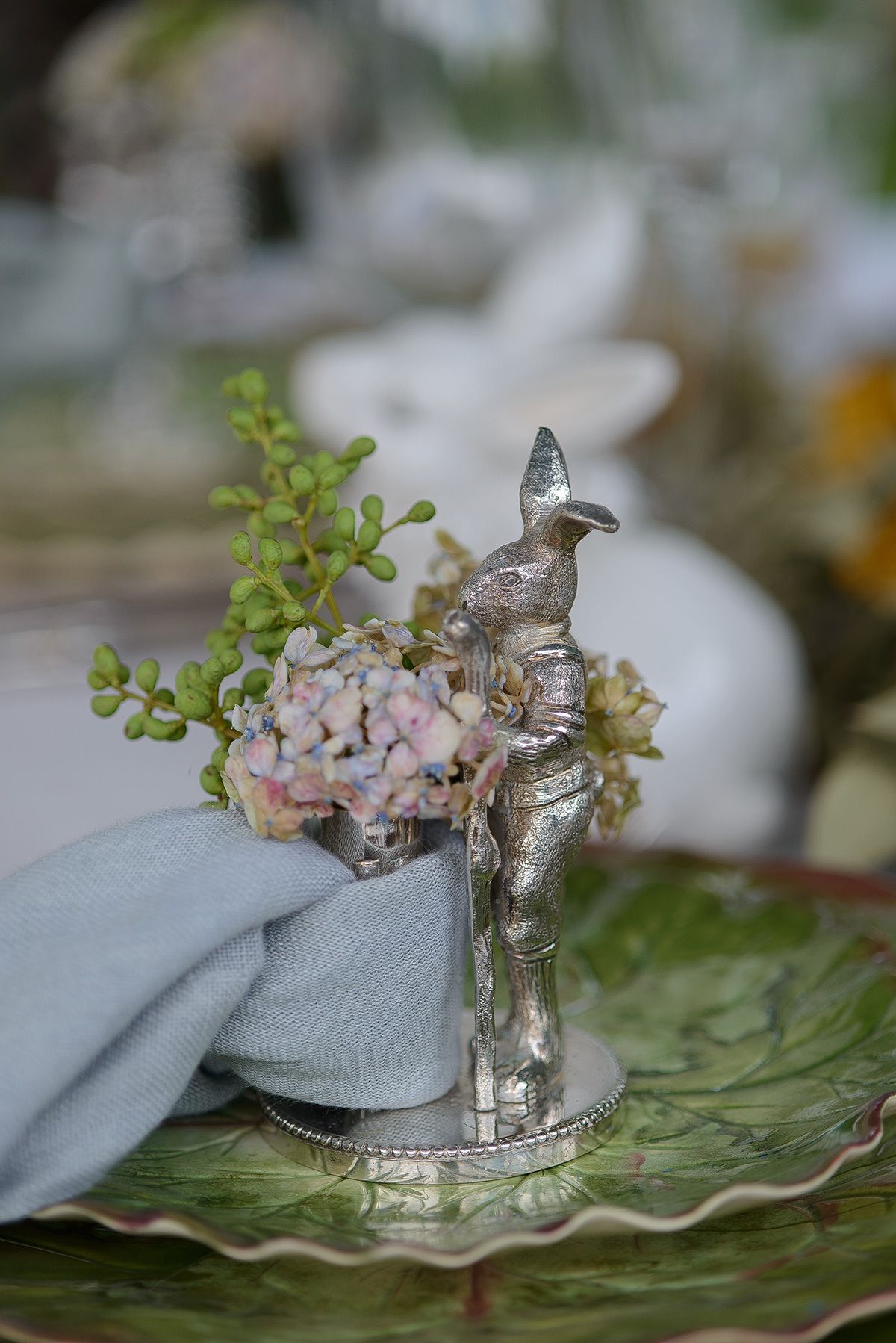 A decoração apresenta elementos que lembram o verde, com poucos coelhinhos, pratos de cerâmica em forma de folhas, e no centro há folhas e flores secas.