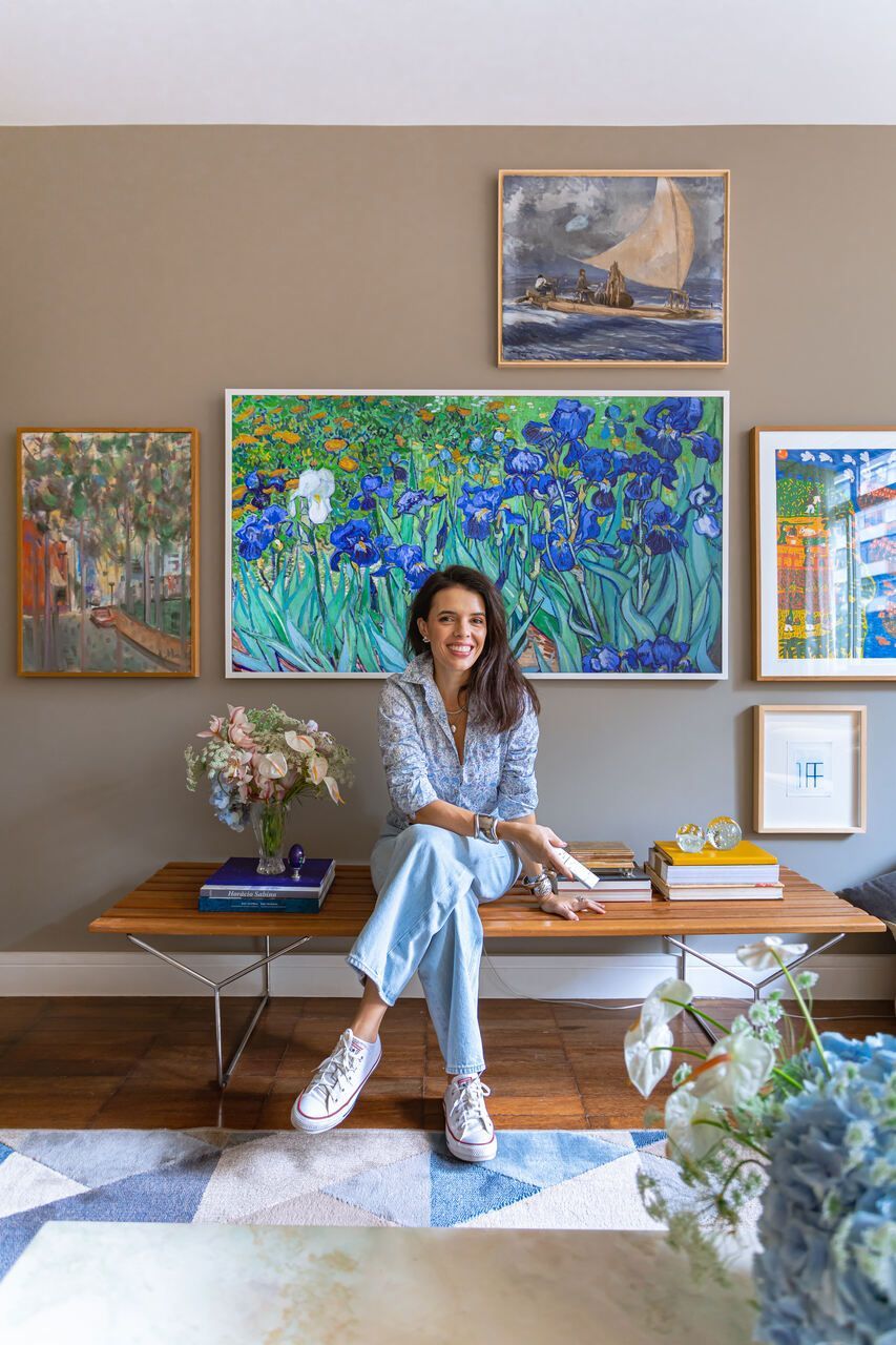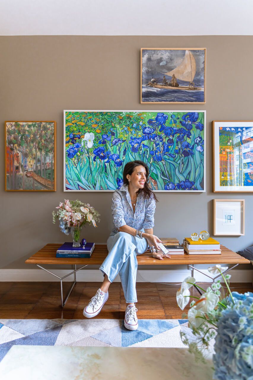 E, claro, existe a minha queridinha para compor o ambiente e transformar as noites de filme em casa: a TV The Frame. Ela não é só uma televisão, é um elemento de composição que funciona como quadro e muda completamente a atmosfera do espaço. No Modo Arte, acompanha o humor do dia, as cores do cenário e até o ritmo das conversas. Durante as gravações, se integra naturalmente como parte do décor e, nos momentos de descanso, exibe meus filmes preferidos com uma qualidade de imagem maravilhosa com 4K de resolução.